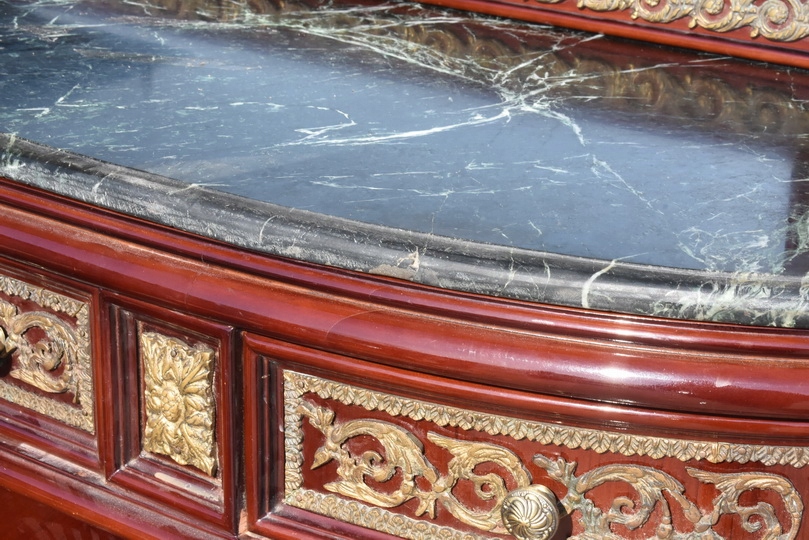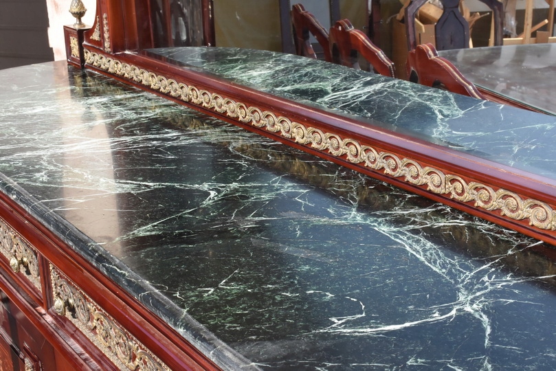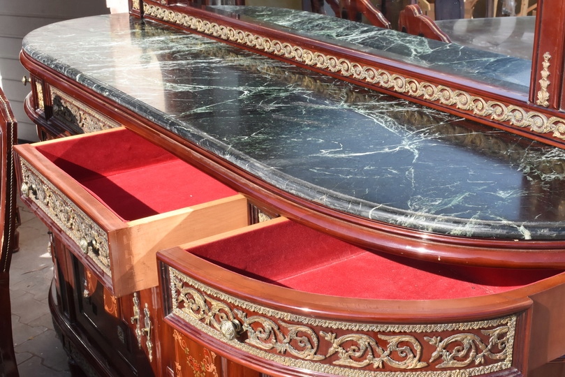 Zestaw zachwyca ręcznymi intarsjami, szlachetną formą oraz monumentalnością wykonania. To nie jest replika – to oryginalny komplet antyczny, który przetrwał pokolenia i nadal zachwyca swoim charakterem.