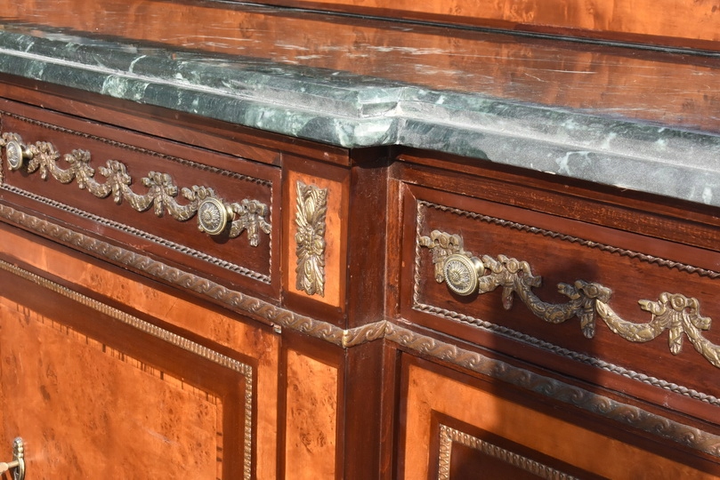 Zestaw zachwyca ręcznymi intarsjami, szlachetną formą oraz monumentalnością wykonania. To nie jest replika – to oryginalny komplet antyczny, który przetrwał pokolenia i nadal zachwyca swoim charakterem.