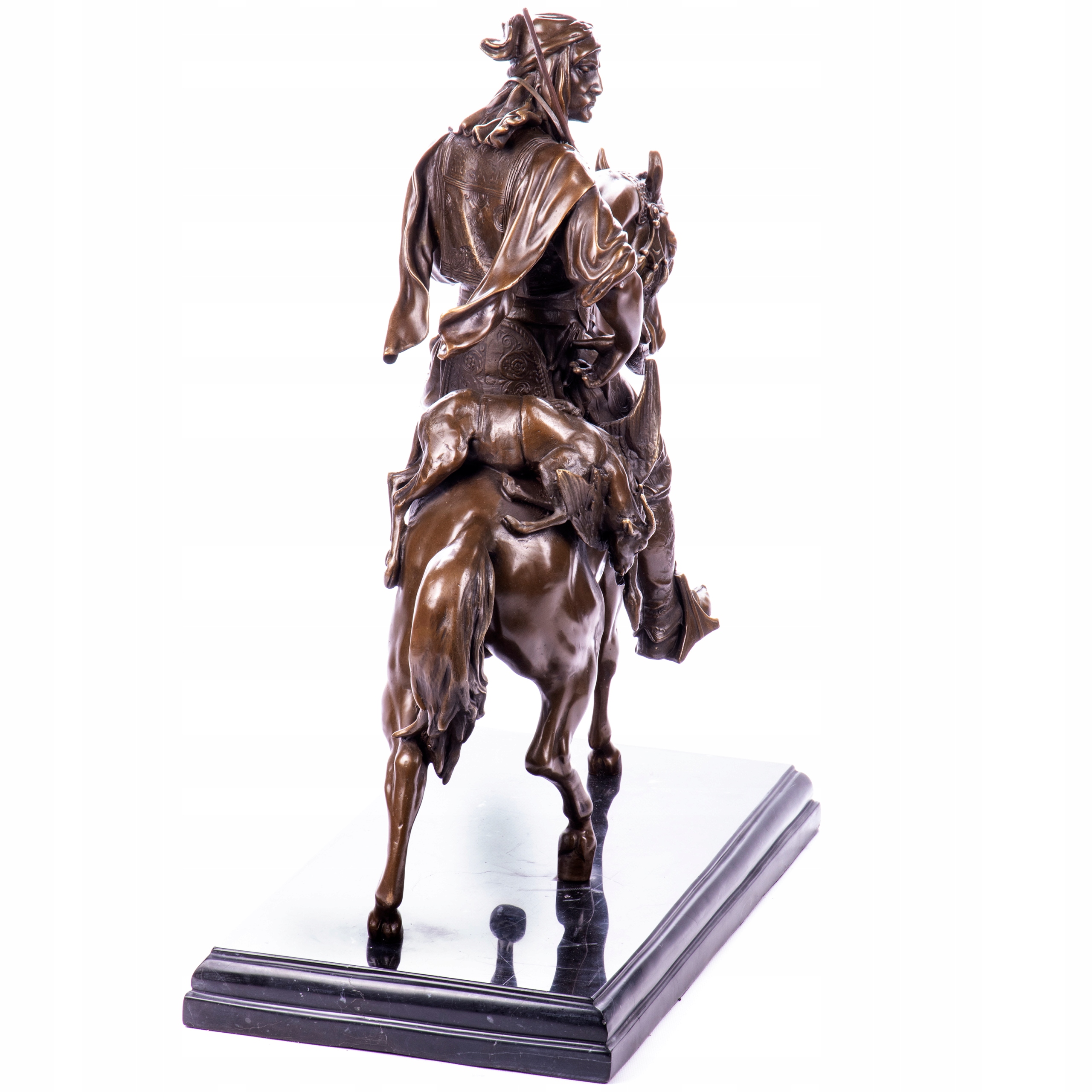 Imponująca, dynamiczna rzeźba z litego brązu przedstawiająca arabskiego wojownika w pełnym galopie. Postać jeźdźca z uniesioną bronią oraz ekspresja galopującego konia tworzą kompozycję pełną ruchu, siły i orientalnego charakteru. To dzieło, które natychmiast przyciąga wzrok i budzi podziw – idealne dla miłośników sztuki orientalnej, historii i mocnych dekoracji.