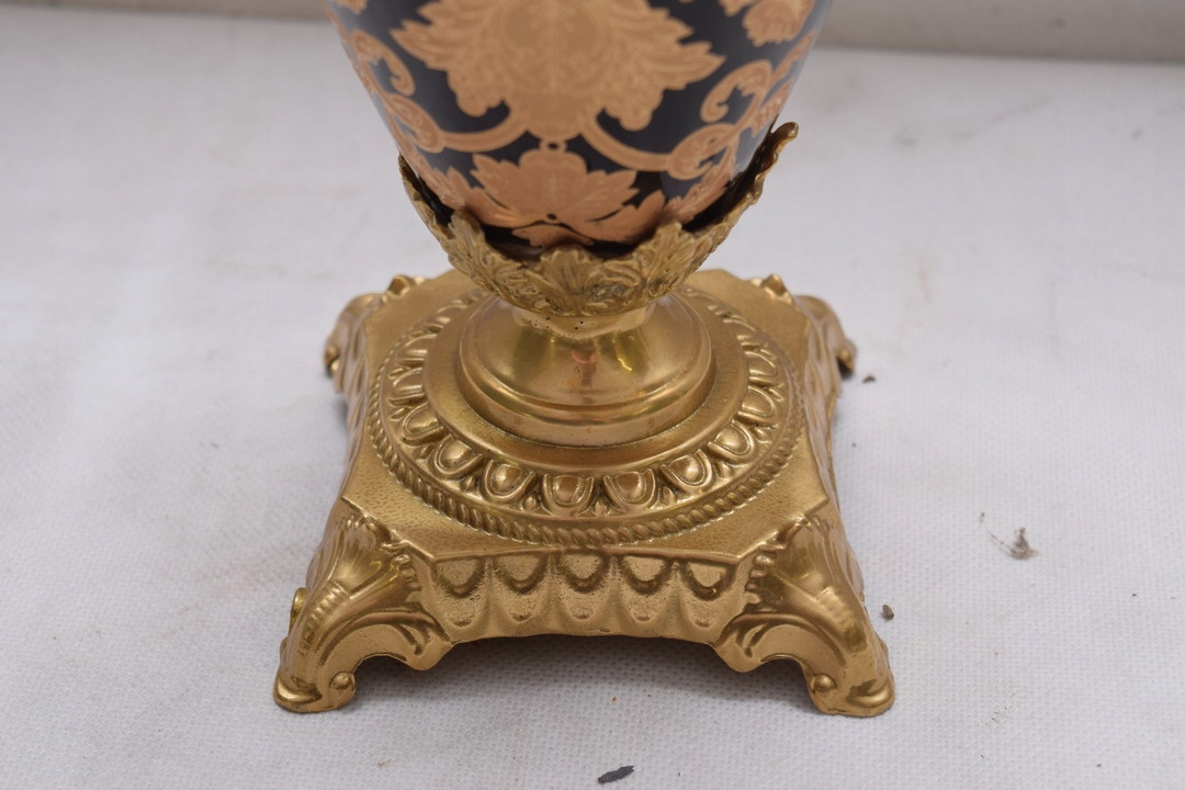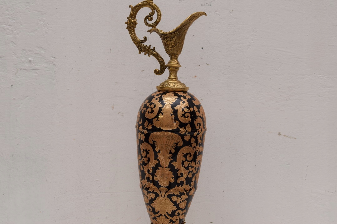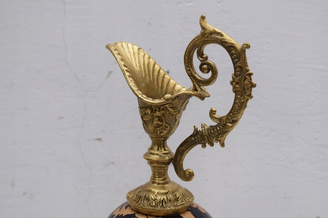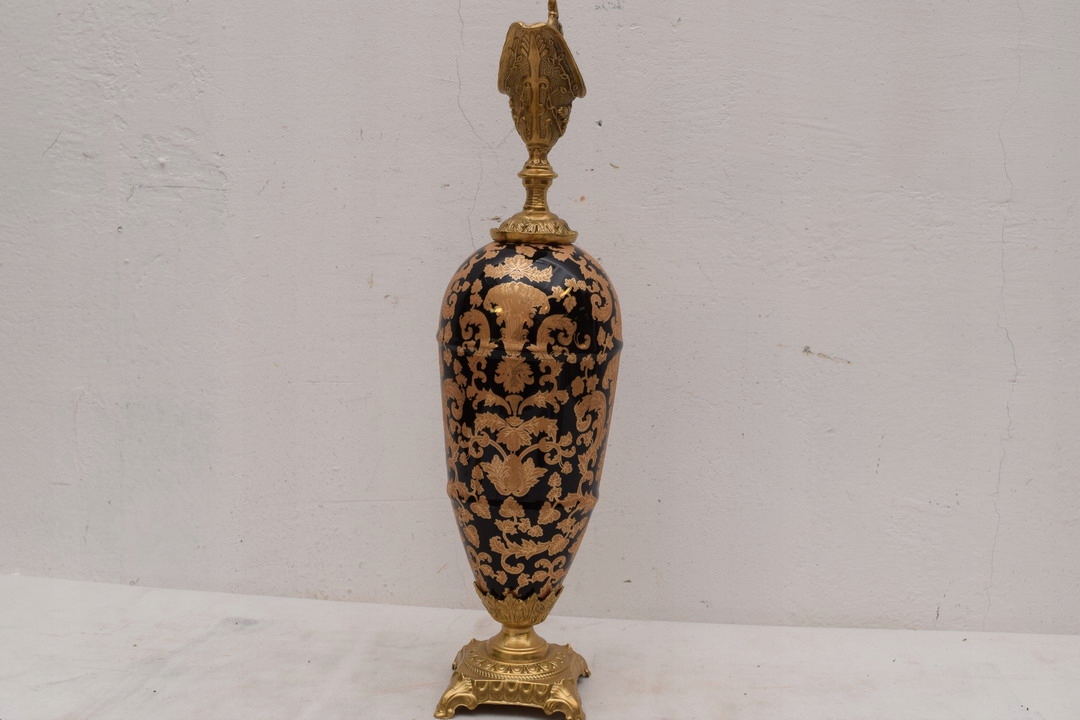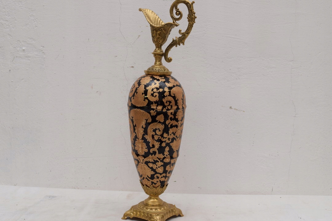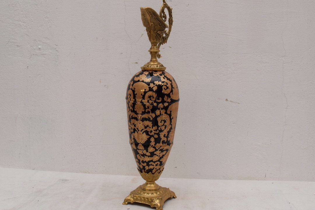 Witam, w dniu dzisiejszym pragnę zaoferować Państwu porcelanową karafkę - okuta brązem. Piękne zdobienia z brązu oraz złocenia.