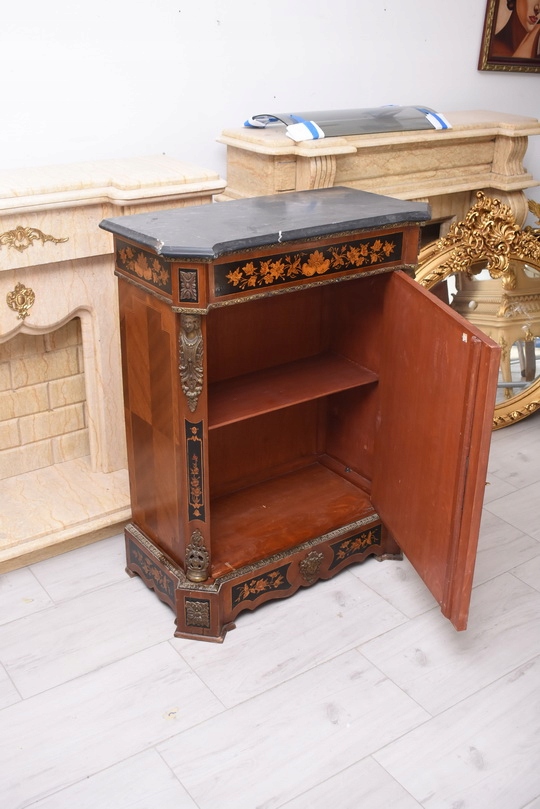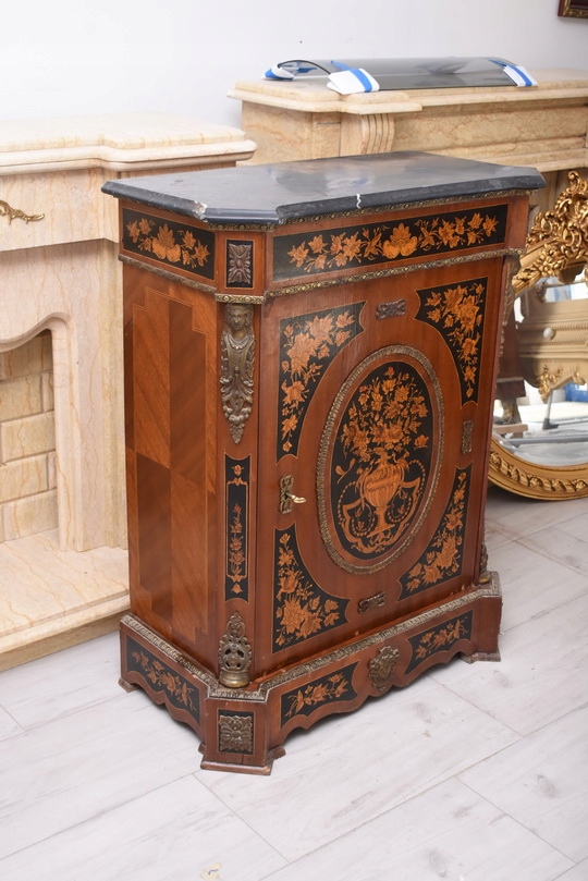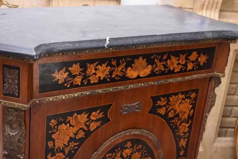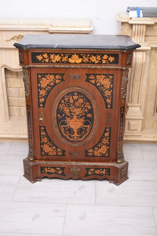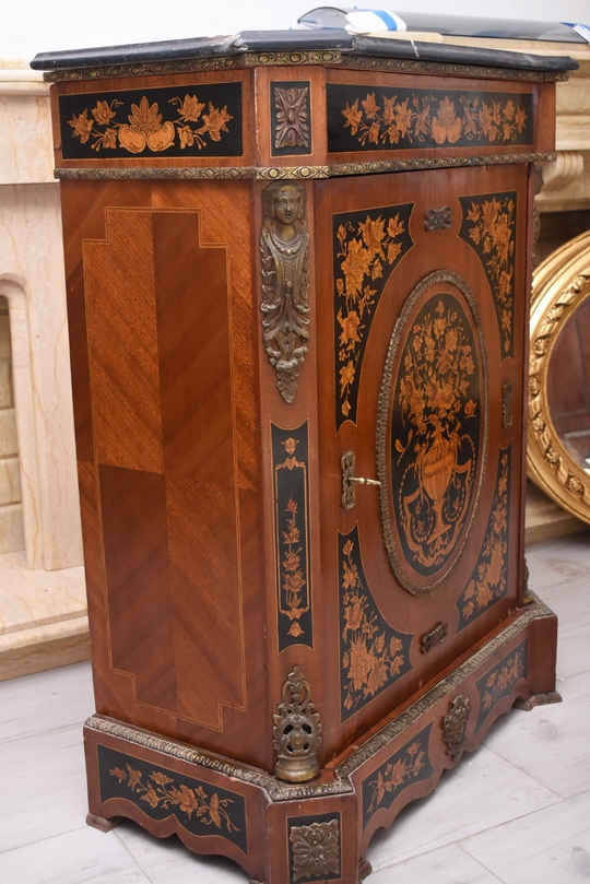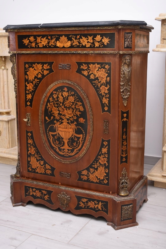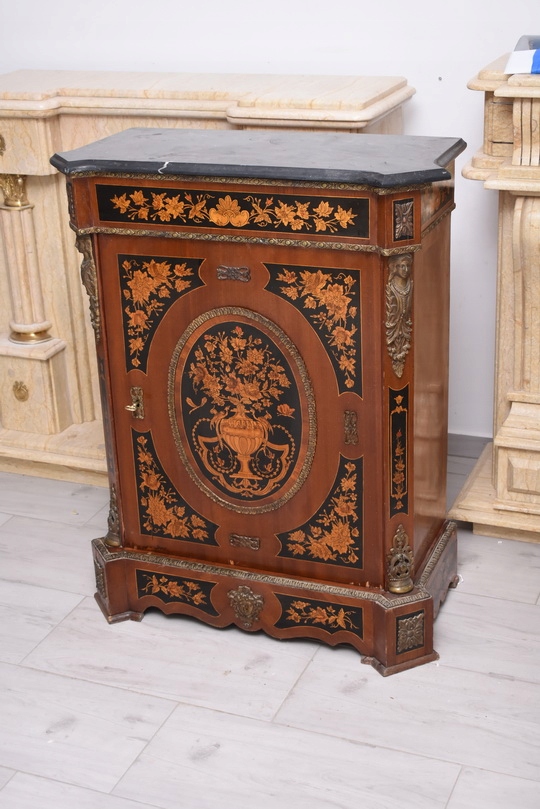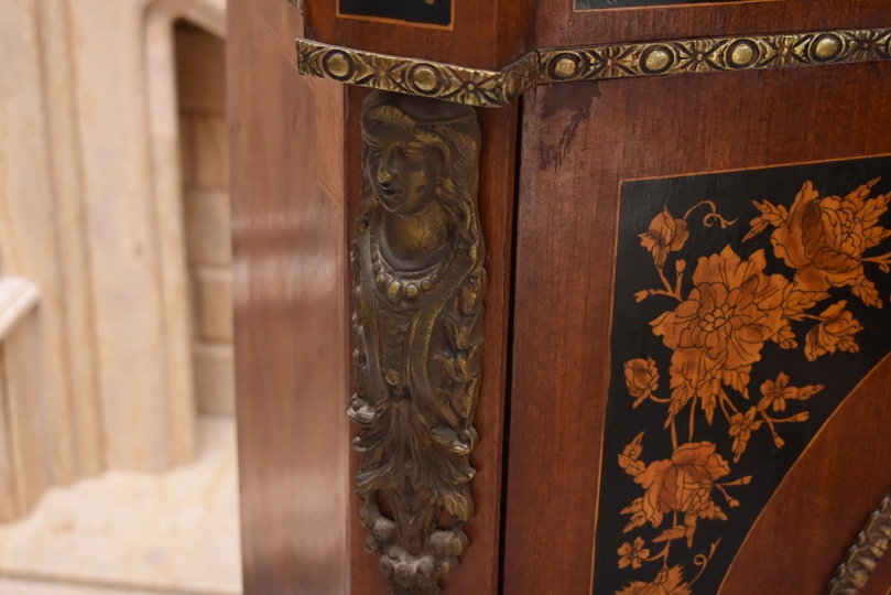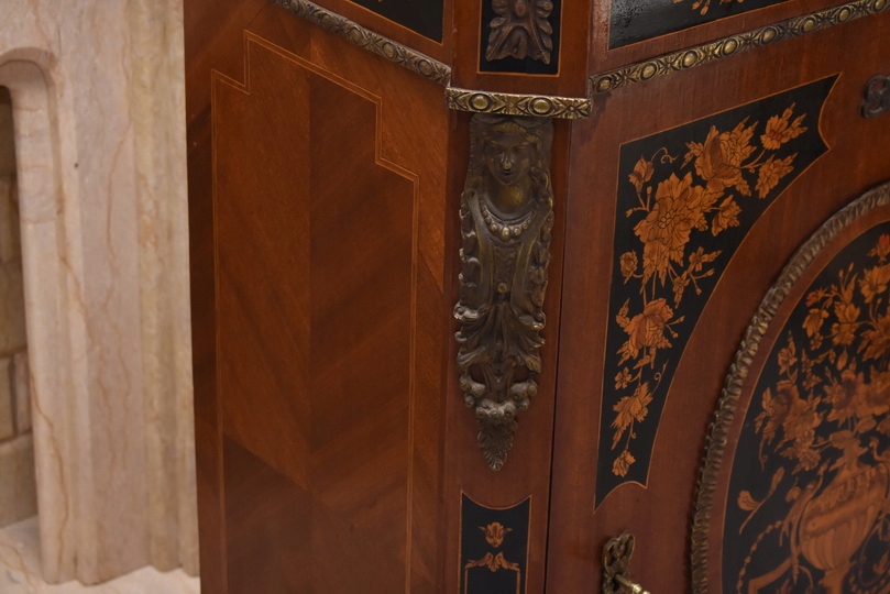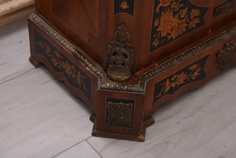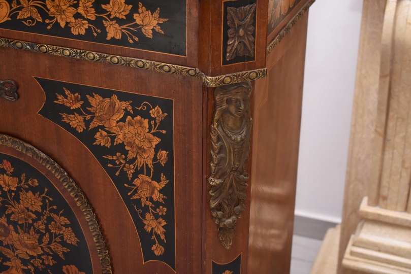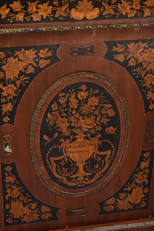 Front komody zdobi efektowna intarsja o motywach roślinnych, ułożona w symetryczne, dekoracyjne kompozycje, z centralnym medalionem przedstawiającym wazę z kwiatami. Kontrastowe zestawienie ciepłych odcieni drewna z ciemnym tłem podkreśla głębię zdobień i nadaje meblowi wyjątkowej elegancji.