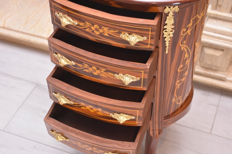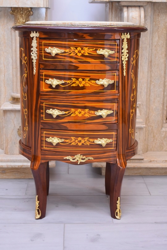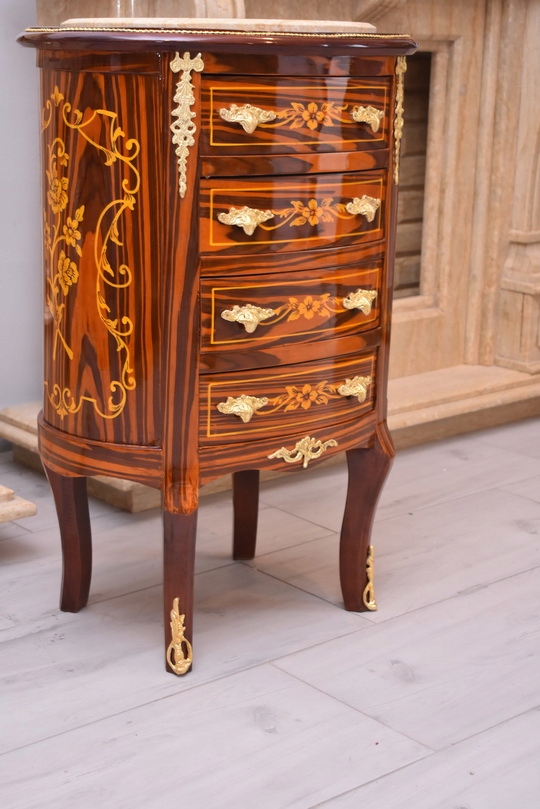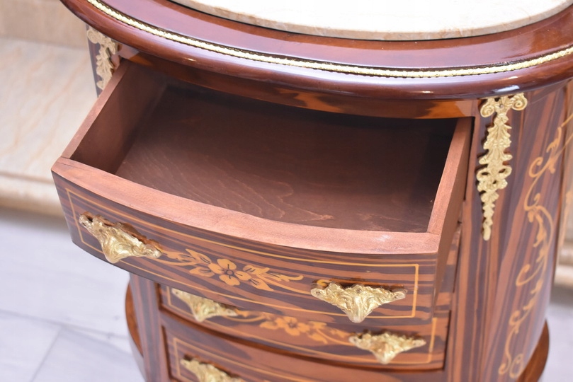 Elegancka drewniana komoda w stylu barokowym z efektownym blatem marmurowym. Mebel zachwyca klasyczną, dekoracyjną formą oraz detalami charakterystycznymi dla stylu – profilowanymi frontami, subtelnymi zdobieniami i stylowymi uchwytami. Komoda wyposażona jest w cztery pojemne szuflady, które zapewniają dużo miejsca do przechowywania.