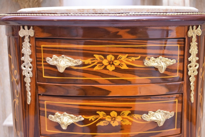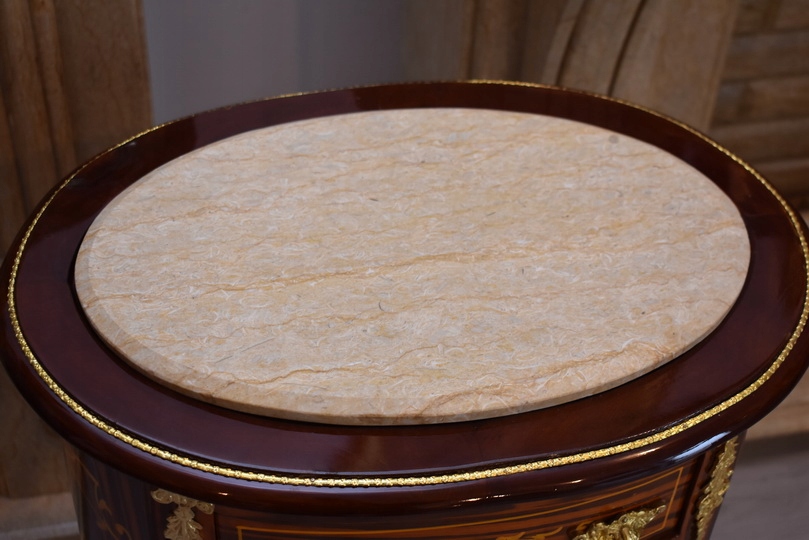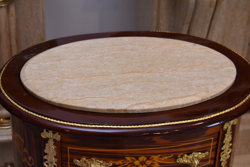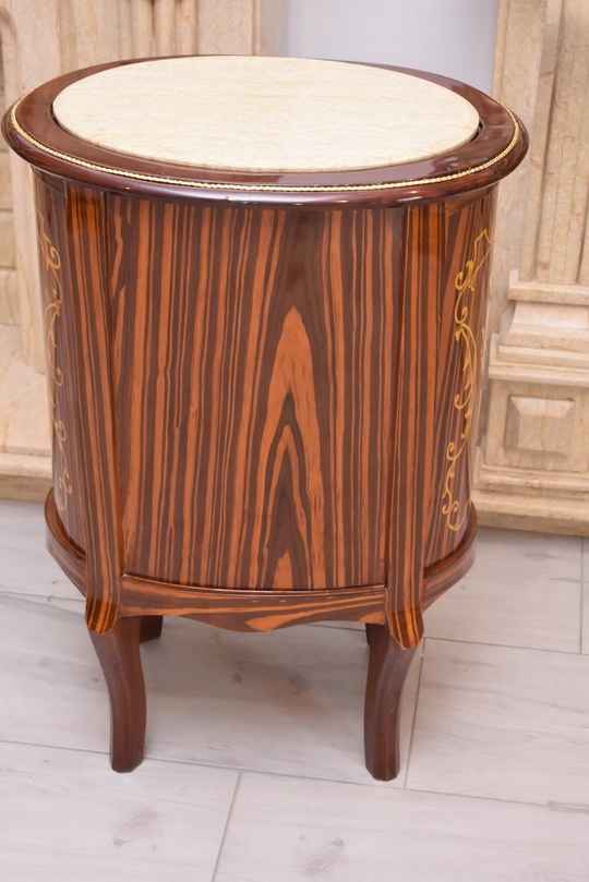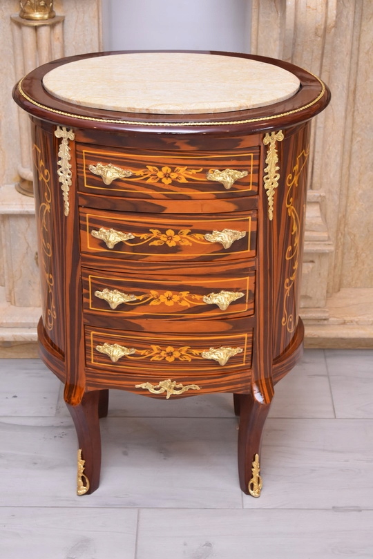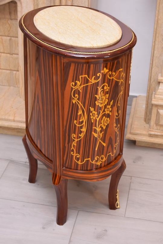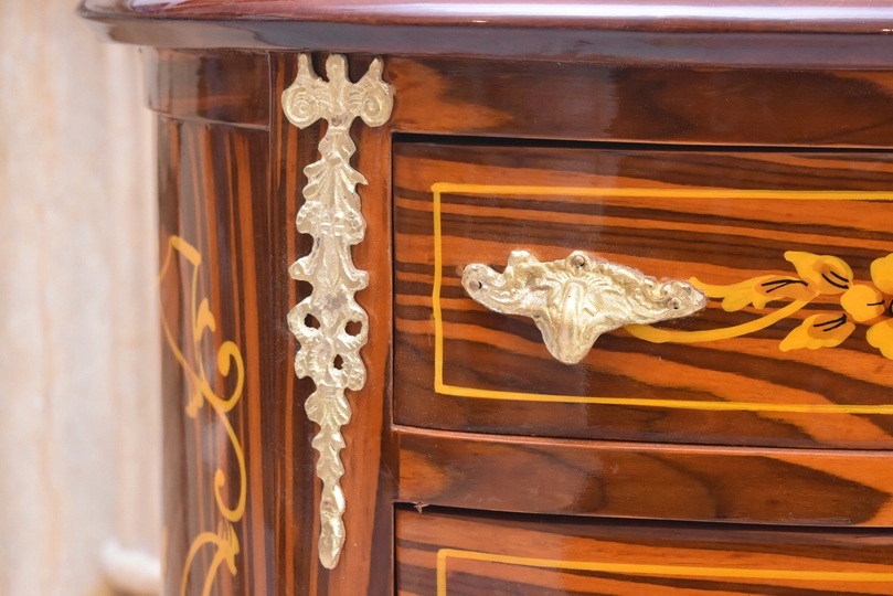 Solidna, stabilna konstrukcja z drewna sprawia, że mebel jest trwały i funkcjonalny, a jednocześnie stanowi wyjątkową ozdobę wnętrza. Marmurowy blat dodaje elegancji i podkreśla antyczny charakter komody. Idealnie sprawdzi się w salonie, sypialni, gabinecie lub przedpokoju – zarówno w klasycznych, jak i eklektycznych aranżacjach.