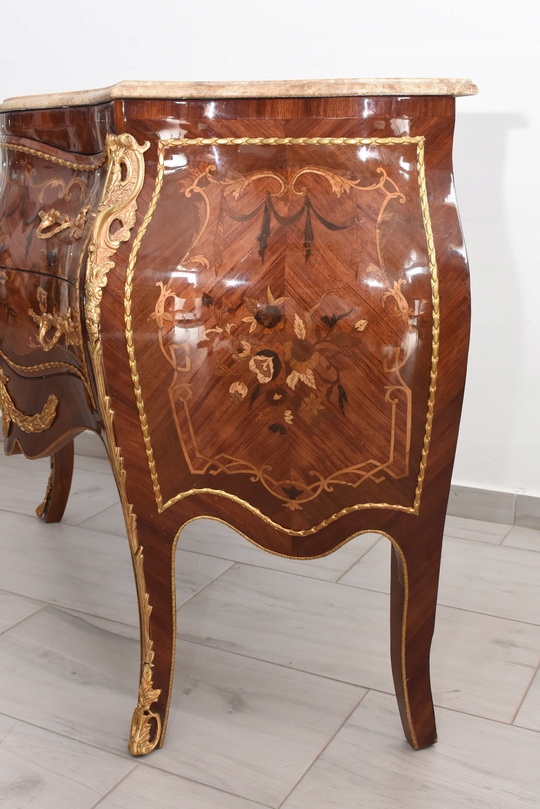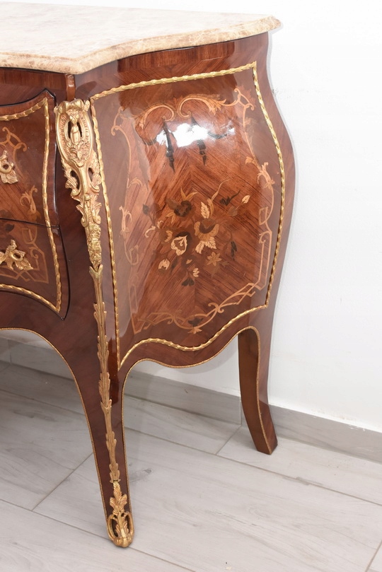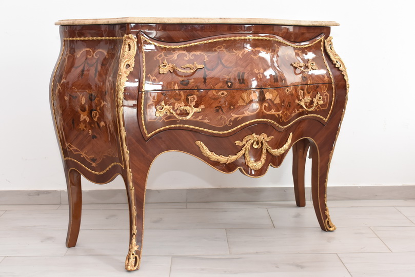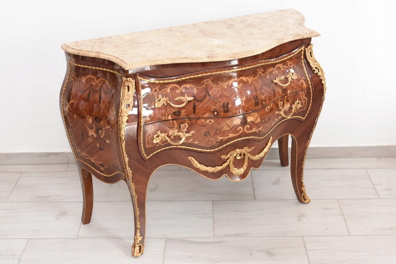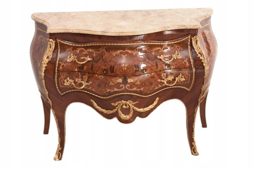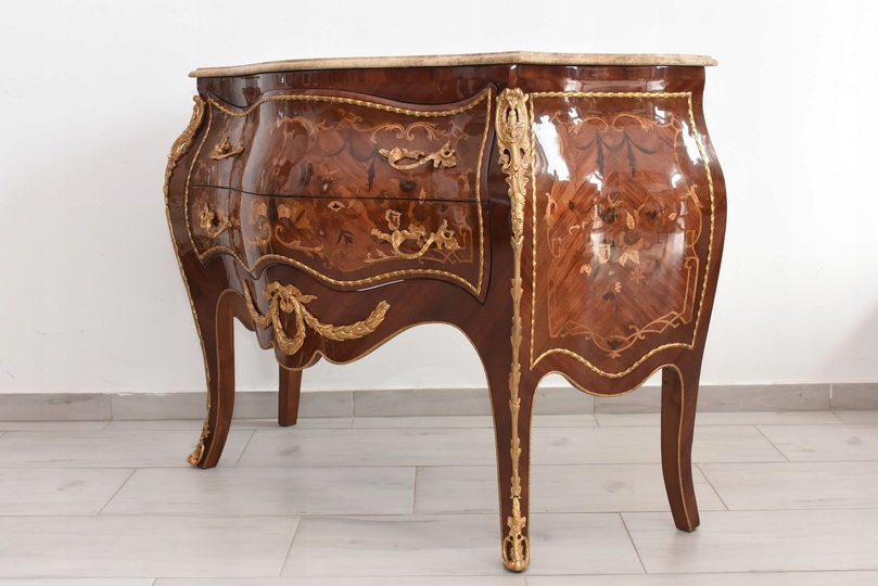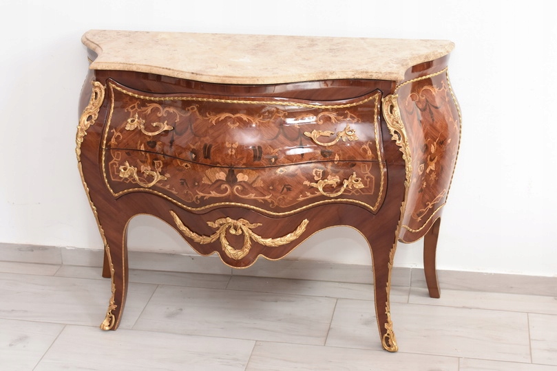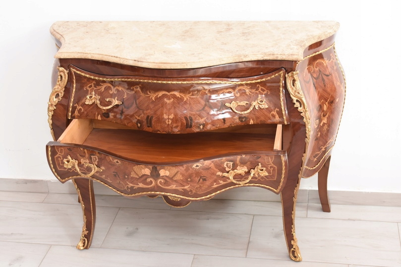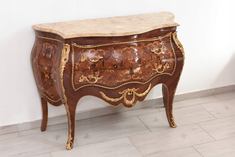 Niesamowicie piękna komoda, licznie zdobiona okuciami, które dodają wspaniałego uroku meblowi. Posiada 2 pojemne szuflady.