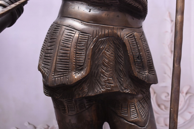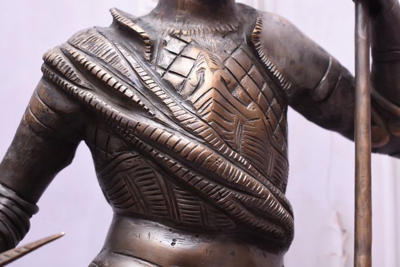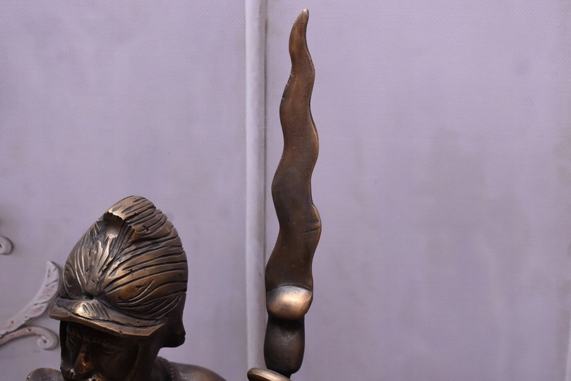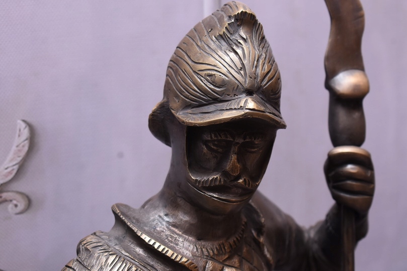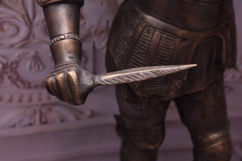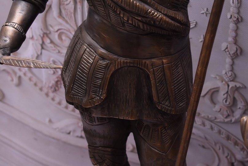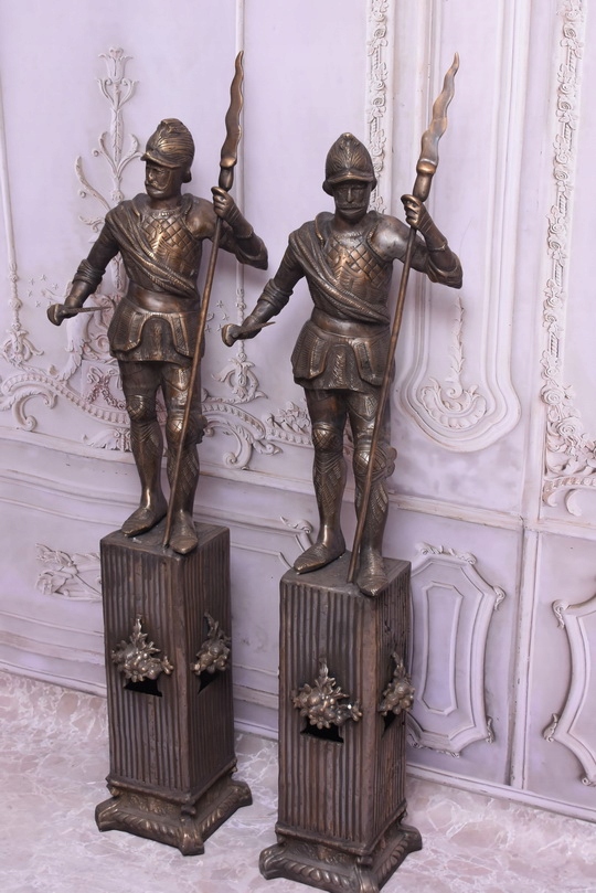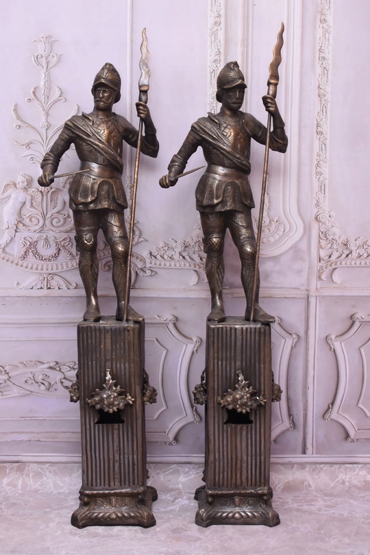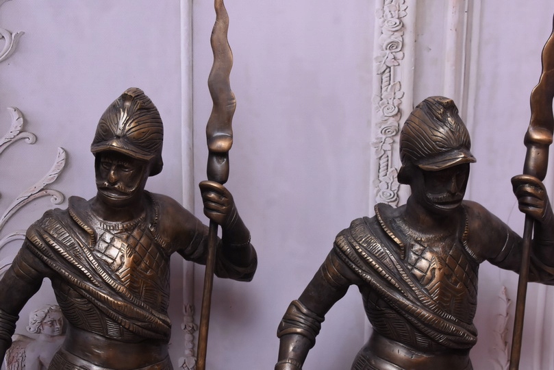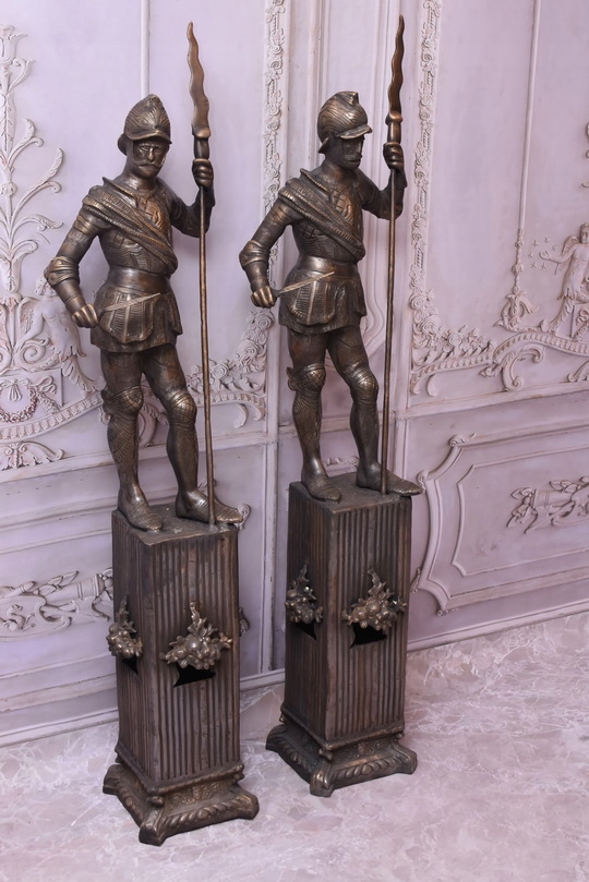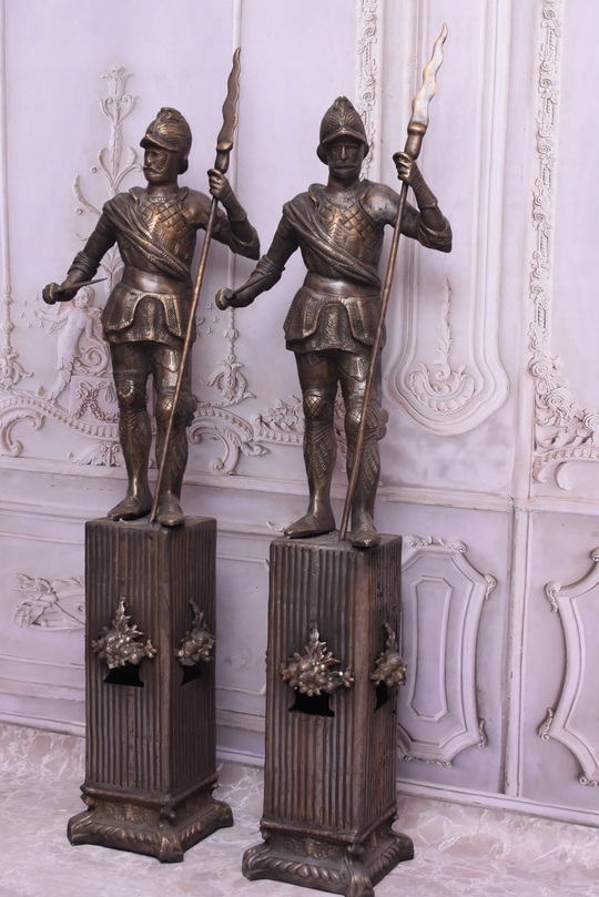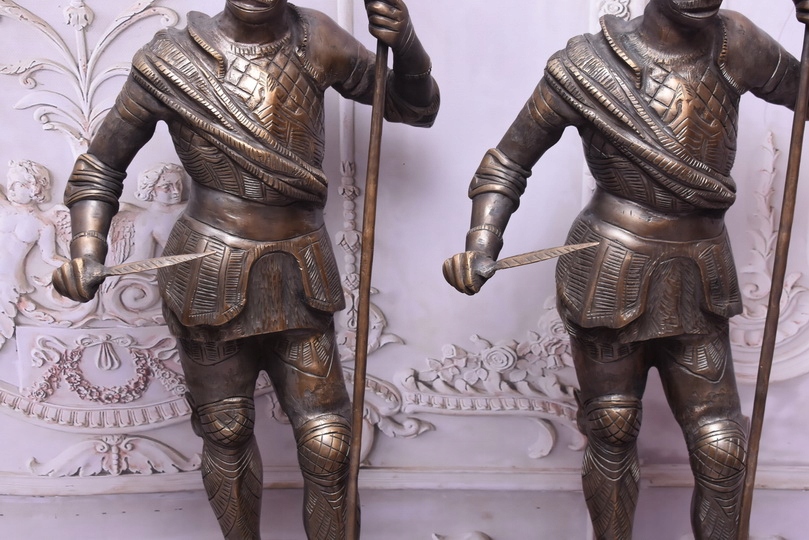 Figury robią ogromne wrażenie dzięki swojej wysokości i rzeźbiarskiej precyzji. Dynamiczne pozy wojowników, realistyczne odwzorowanie zbroi oraz patynowany brąz nadają im charakter prawdziwych strażników starożytnego pałacu. To wyjątkowy, kolekcjonerski komplet, rzadko spotykany w tak dużych rozmiarach i tak solidnym wykonaniu.