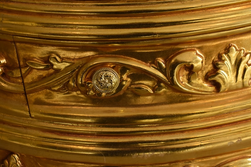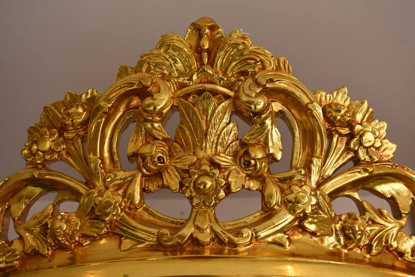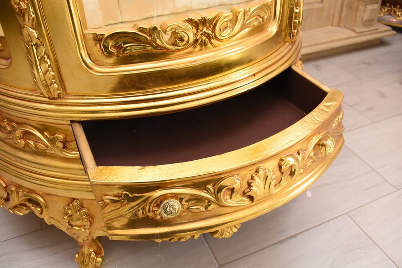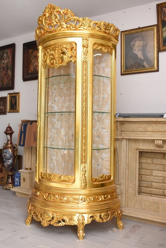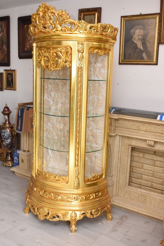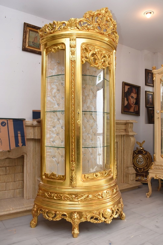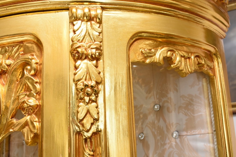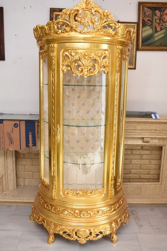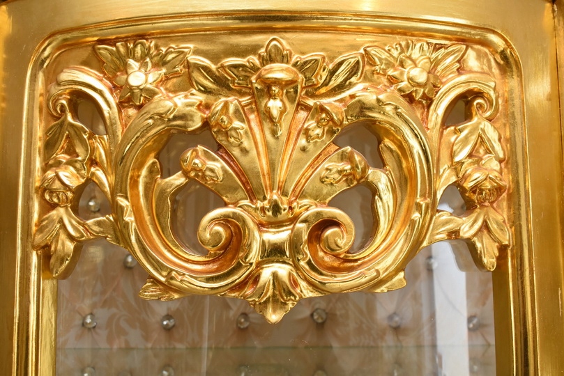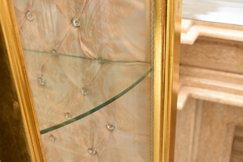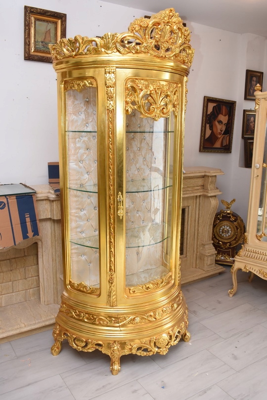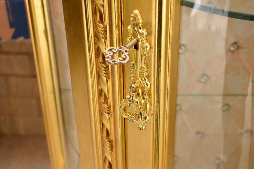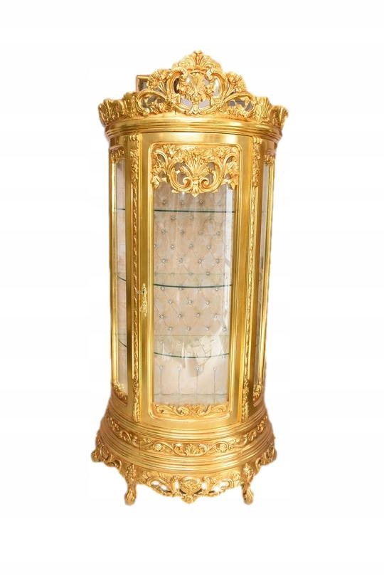 Witryna wykonana z drewna, w kolorze złotym Front oraz , wewnątrz szklane półki umożliwiające efektowną ekspozycję porcelany, kryształów, figurek lub kolekcji. Tylna ścianka wykończona dekoracyjną tapicerką z pikowaniem i kryształkami, co nadaje całości wyjątkowego charakteru.