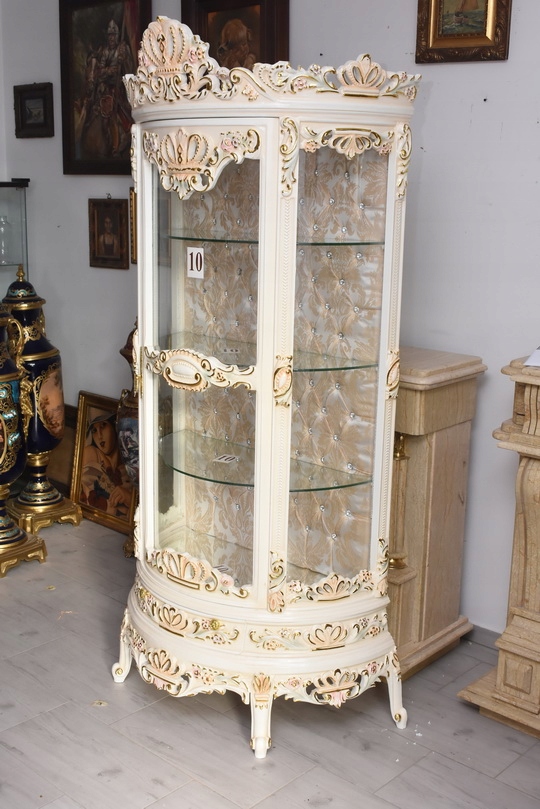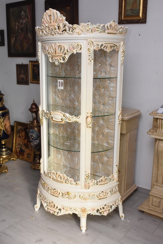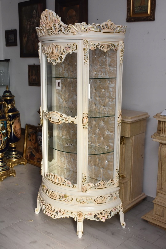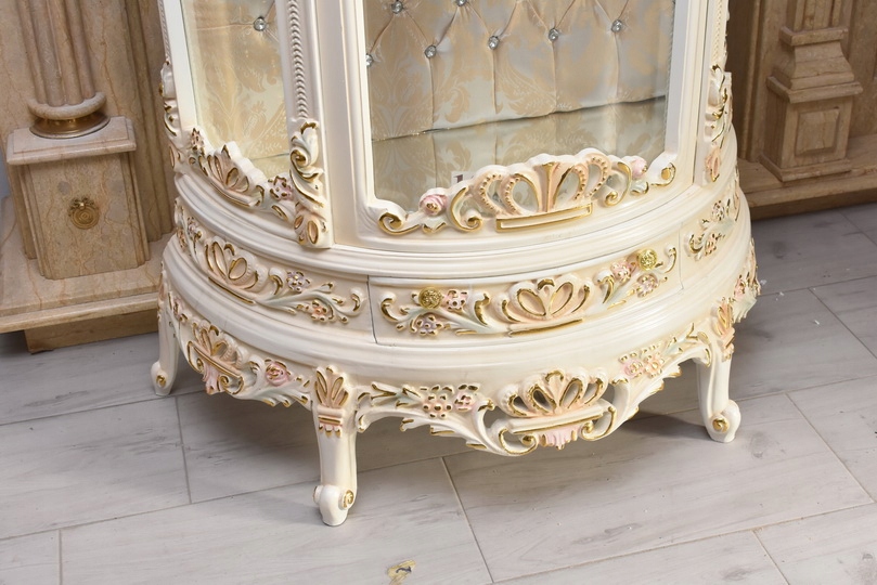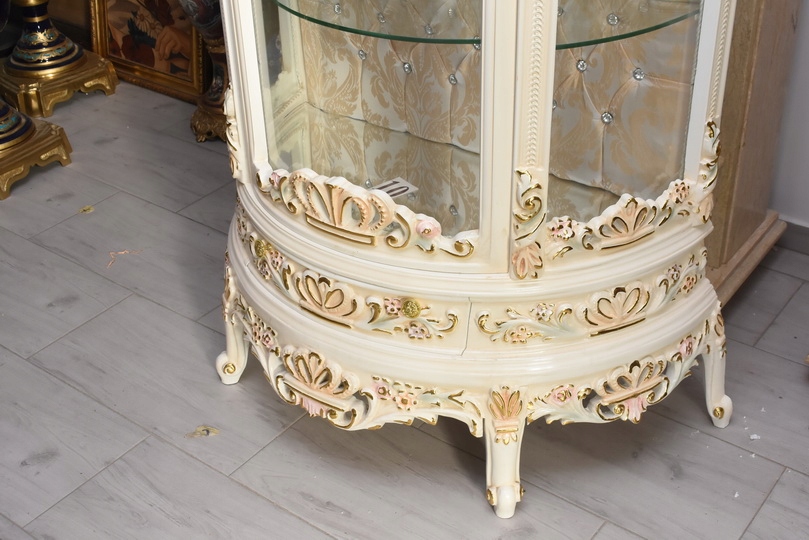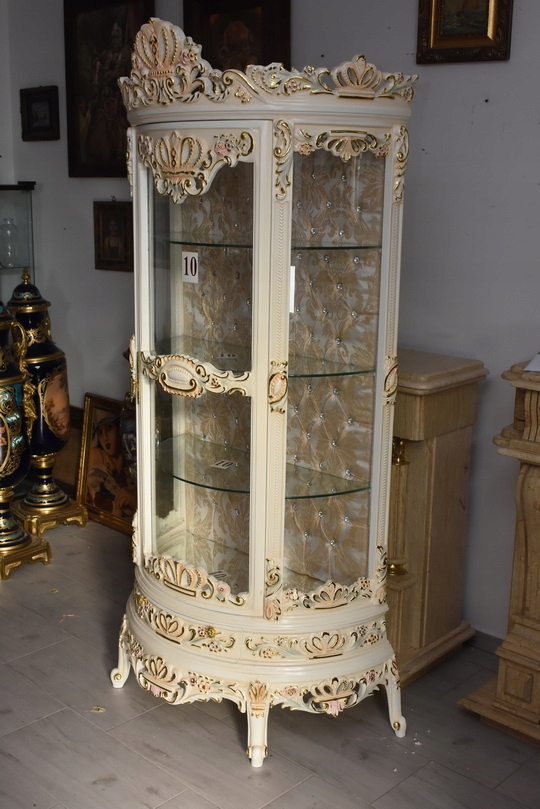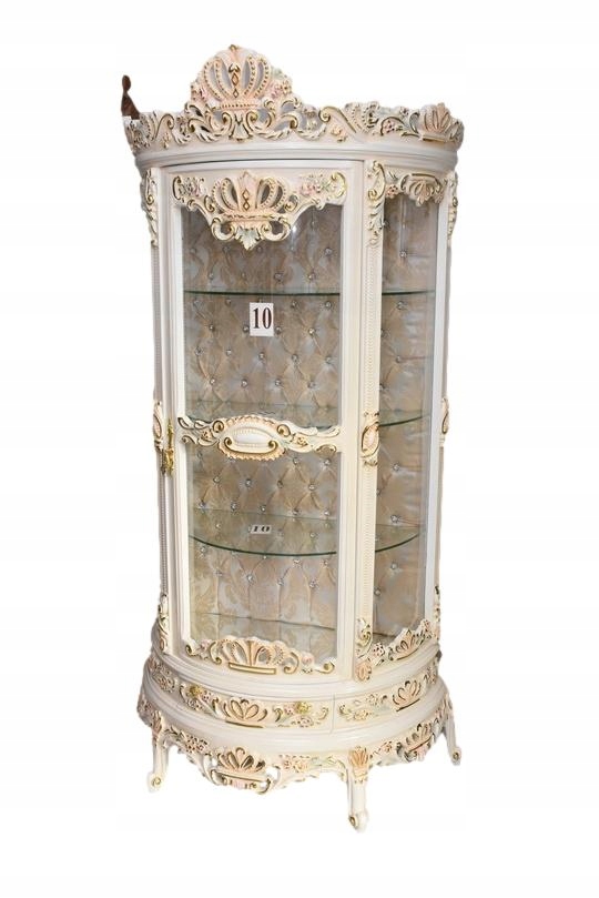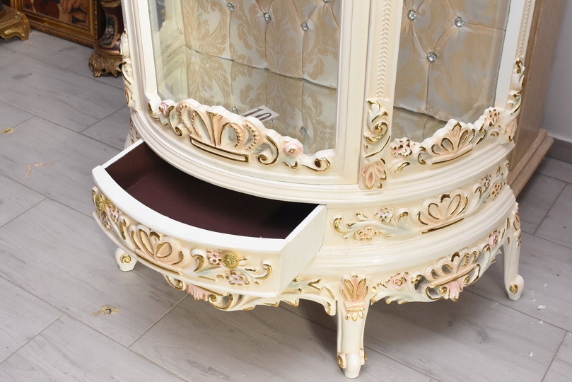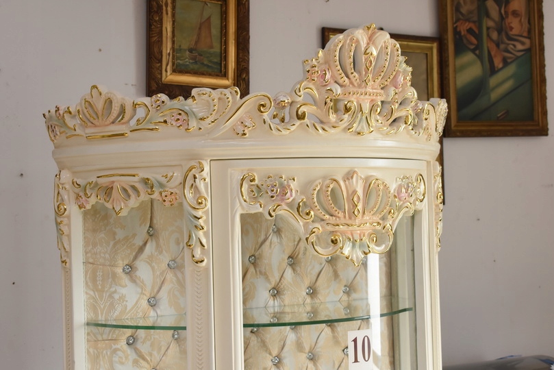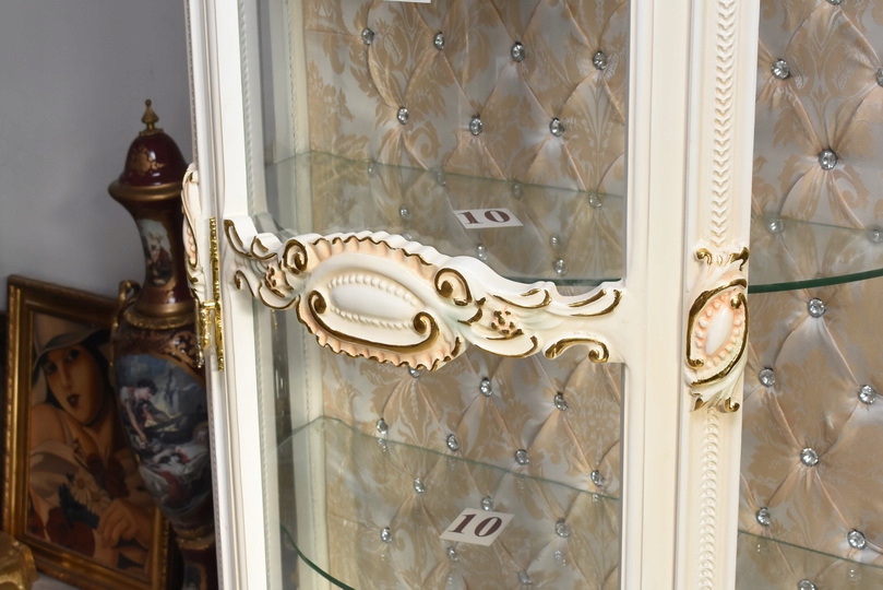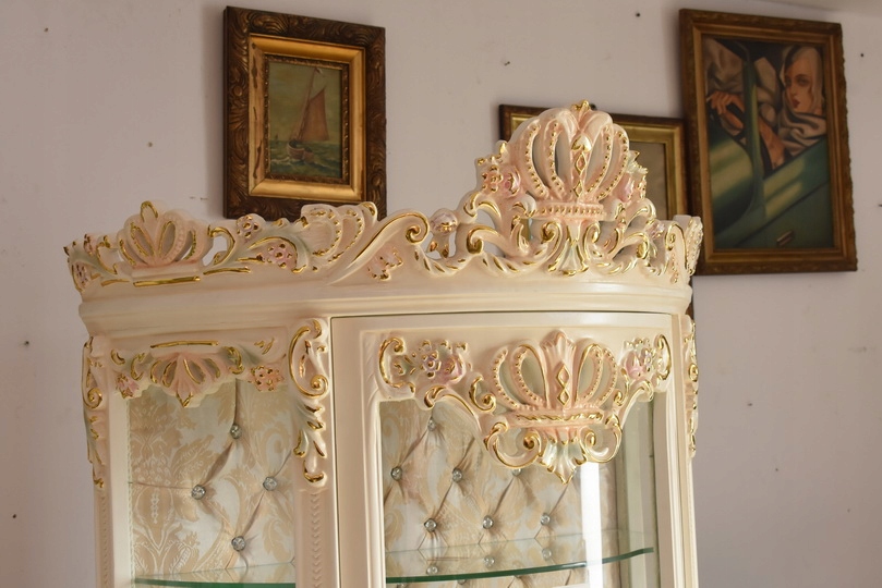 Witryna wykonana z drewna, w kolorze kremowym z subtelnymi złoceniami. Front oraz boki przeszklone, wewnątrz szklane półki umożliwiające efektowną ekspozycję porcelany, kryształów, figurek lub kolekcji. Tylna ścianka wykończona dekoracyjną tapicerką z pikowaniem i kryształkami, co nadaje całości wyjątkowego charakteru.