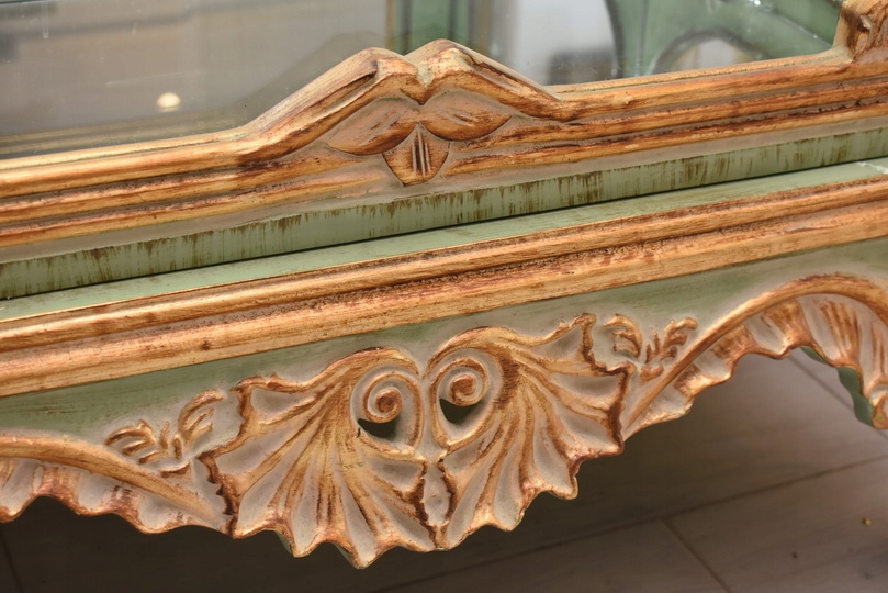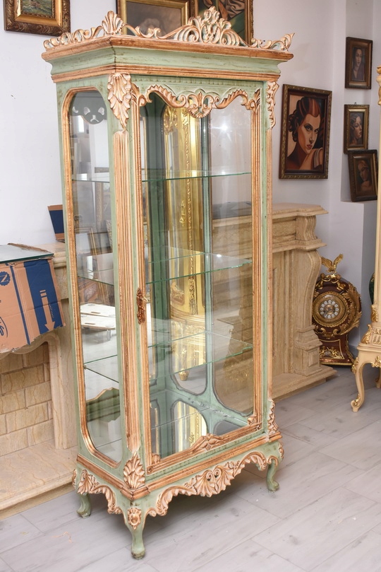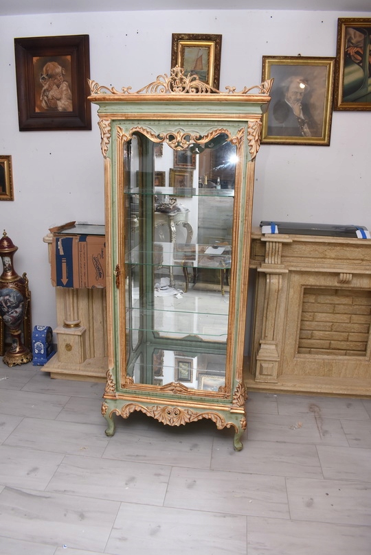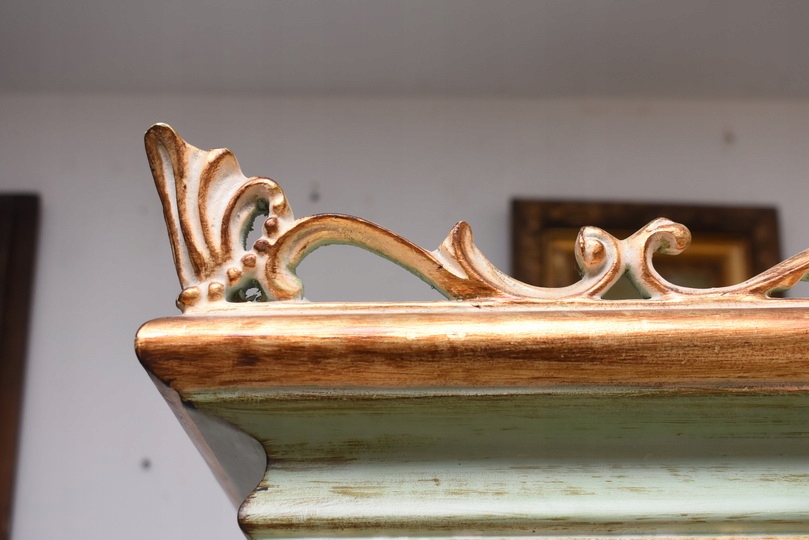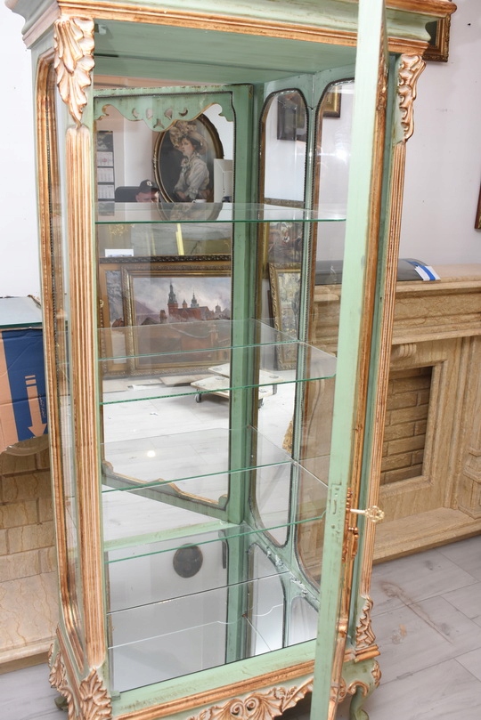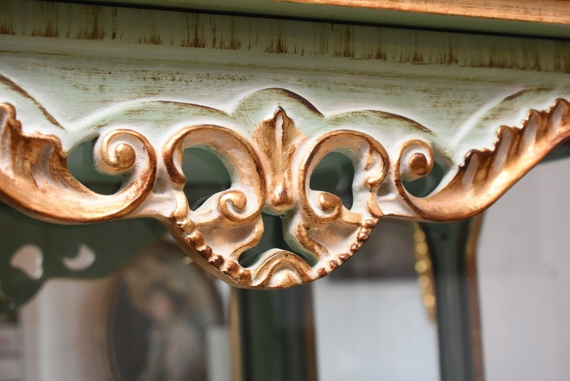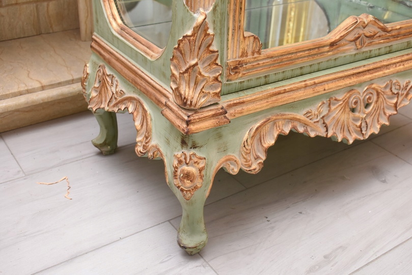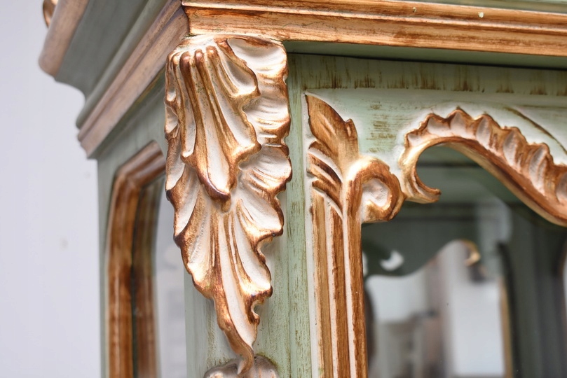 Witryna została wykonana z drewna i wykończona zielonym kolorem w subtelnym, jasnym odcieniu, podkreślającą misternie rzeźbione detale o motywach roślinnych. Falująca linia gzymsu i podstawy, smukłe, delikatnie wygięte nogi oraz bogato zdobione narożniki nadają całości wyjątkowej lekkości i wyrafinowanego charakteru.