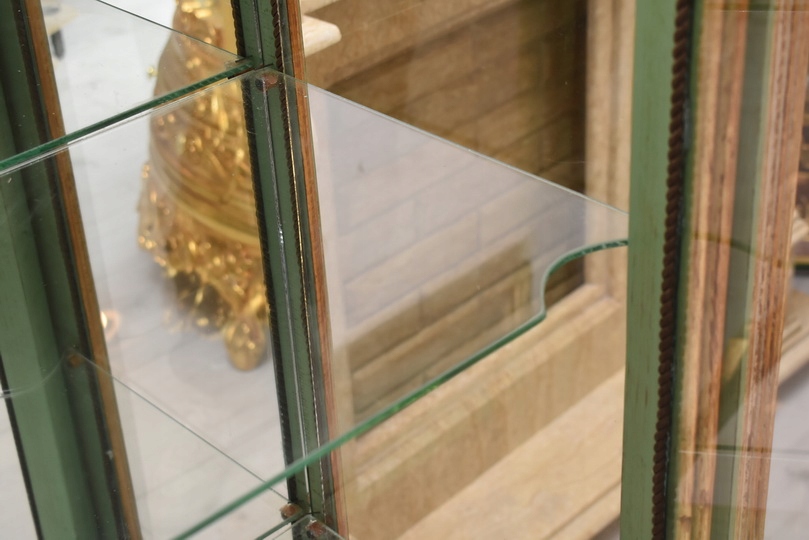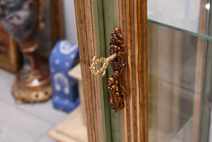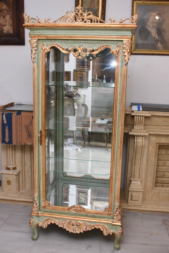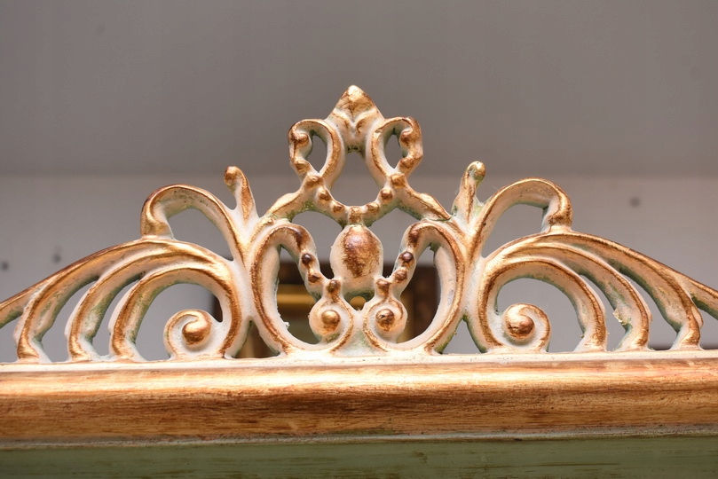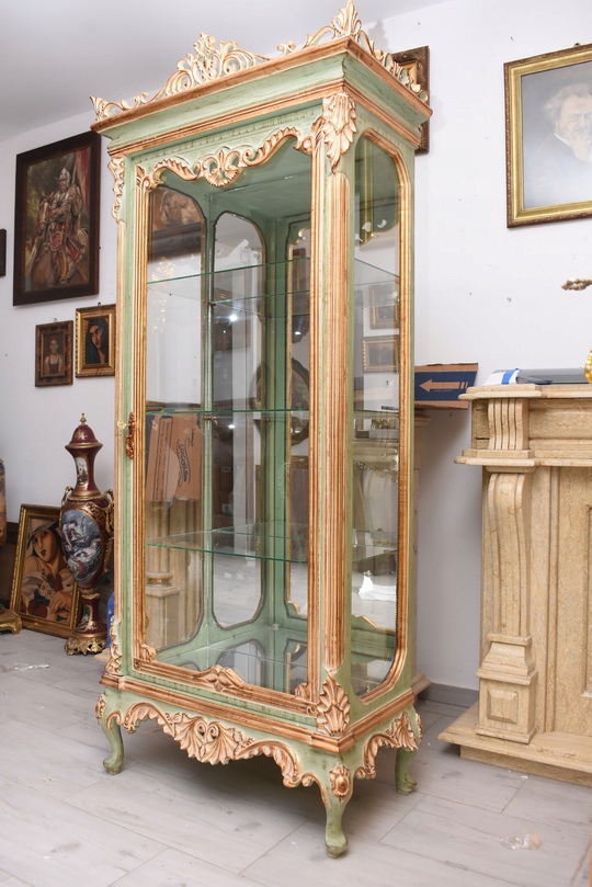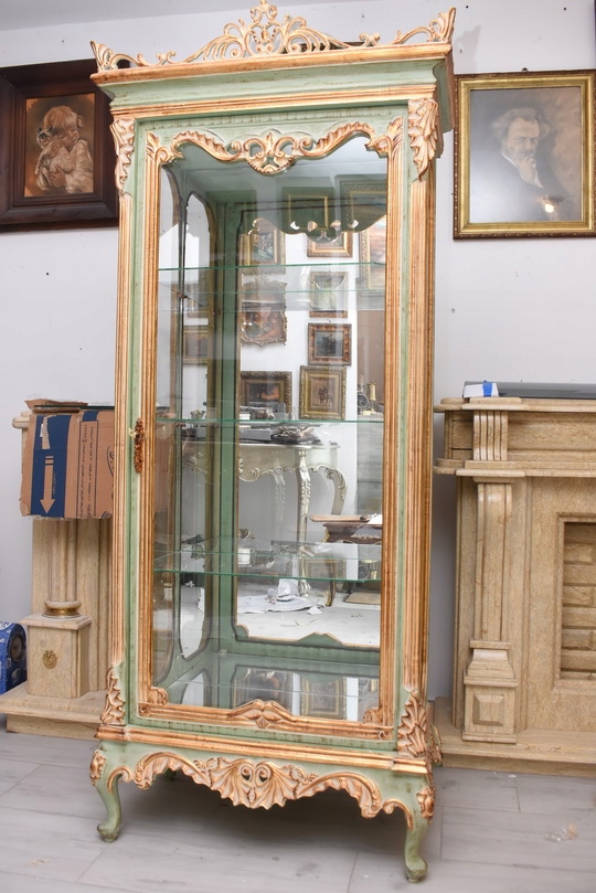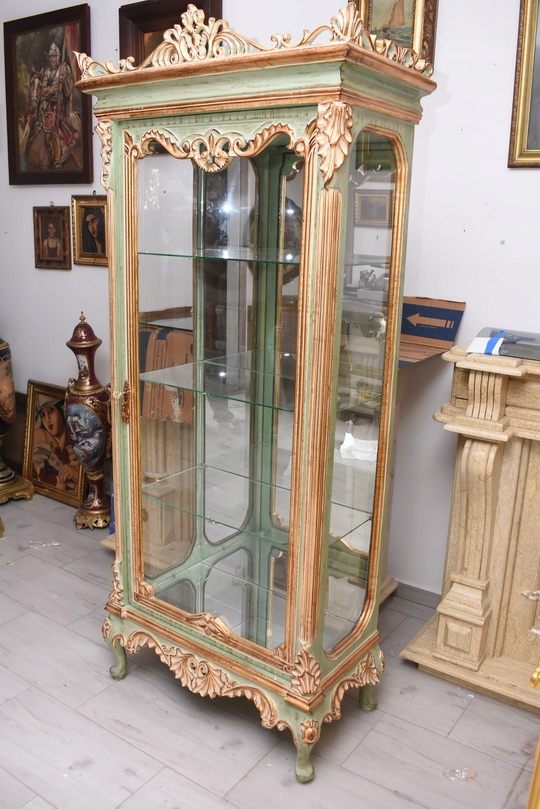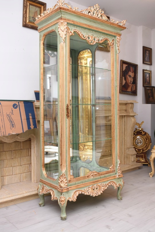 Witryna została wykonana z drewna i wykończona zielonym kolorem w subtelnym, jasnym odcieniu, podkreślającą misternie rzeźbione detale o motywach roślinnych. Falująca linia gzymsu i podstawy, smukłe, delikatnie wygięte nogi oraz bogato zdobione narożniki nadają całości wyjątkowej lekkości i wyrafinowanego charakteru.
