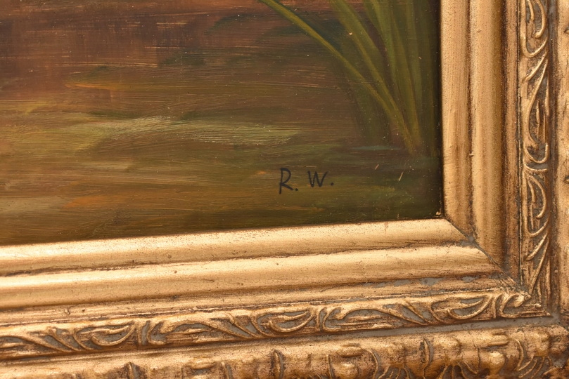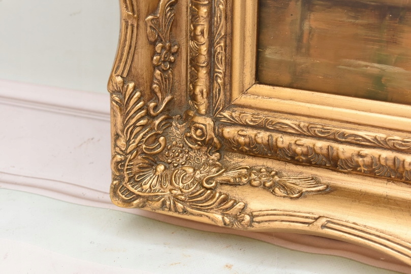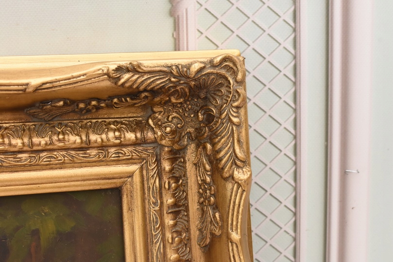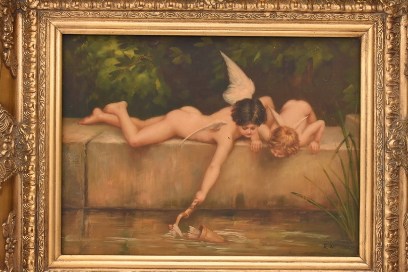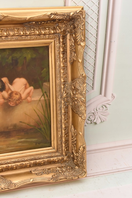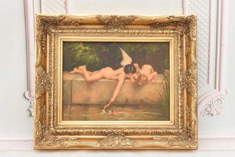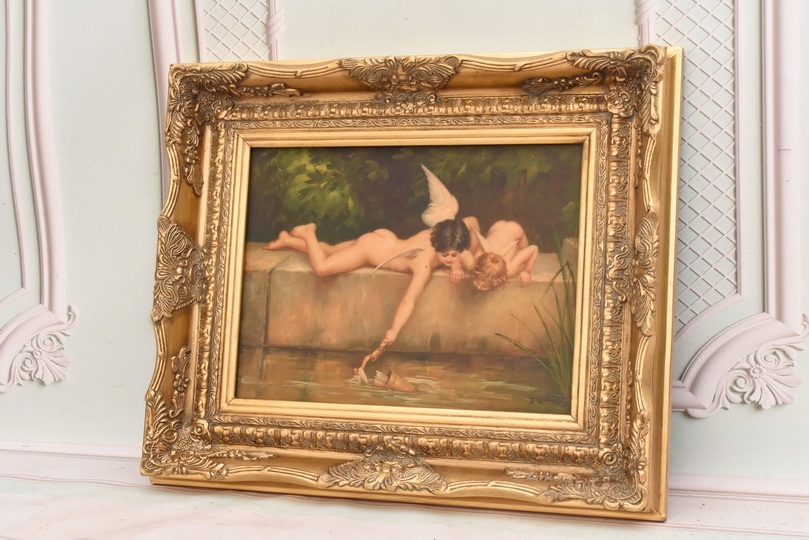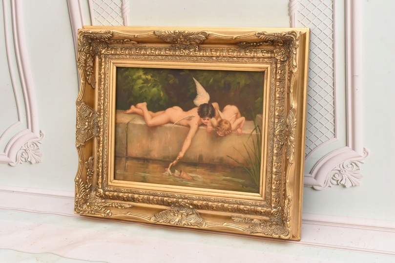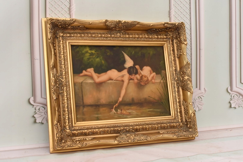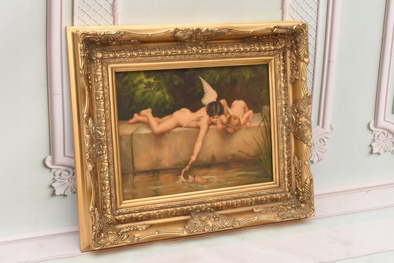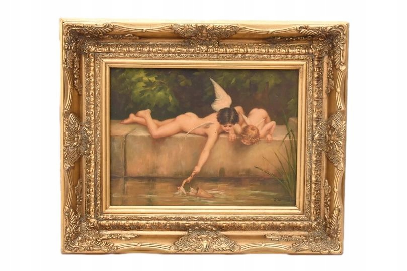 Elegancki obraz olejny przedstawiający dwa amory (putti) wyciągające strzały z wody, oprawiony w bogato zdobioną złotą ramę. Dzieło inspirowane klasyczną symboliką miłości i alegorią Amora, idealne do salonu, gabinetu lub jadalni, wprowadzając do wnętrza romantyczny i artystyczny klimat.