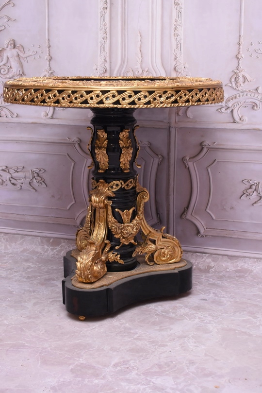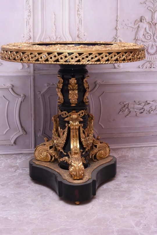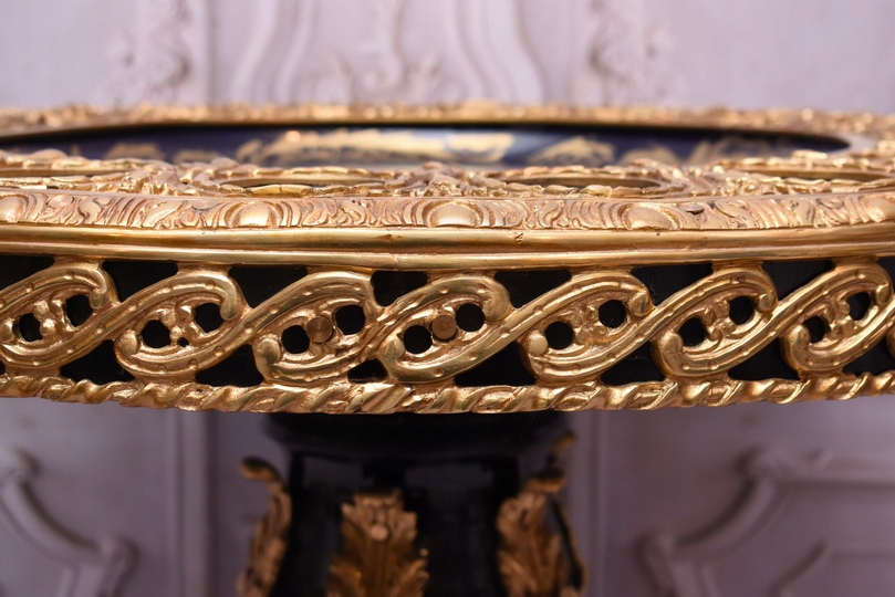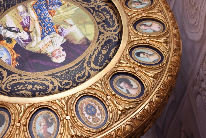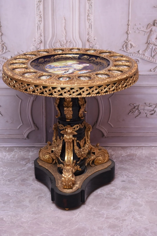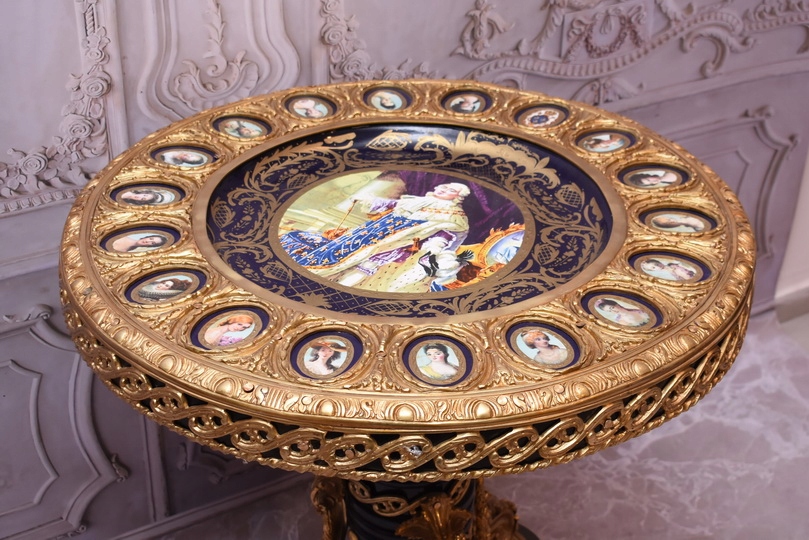 Subtelne akcenty z brązu dodają stołowi delikatnego blasku i szlachetności, podkreślając jego wyjątkowy charakter. Porcelanowe malunki umieszczone na blacie stołu nadają mu niepowtarzalnego uroku, tworząc kompozycję pełną finezji i klasy.