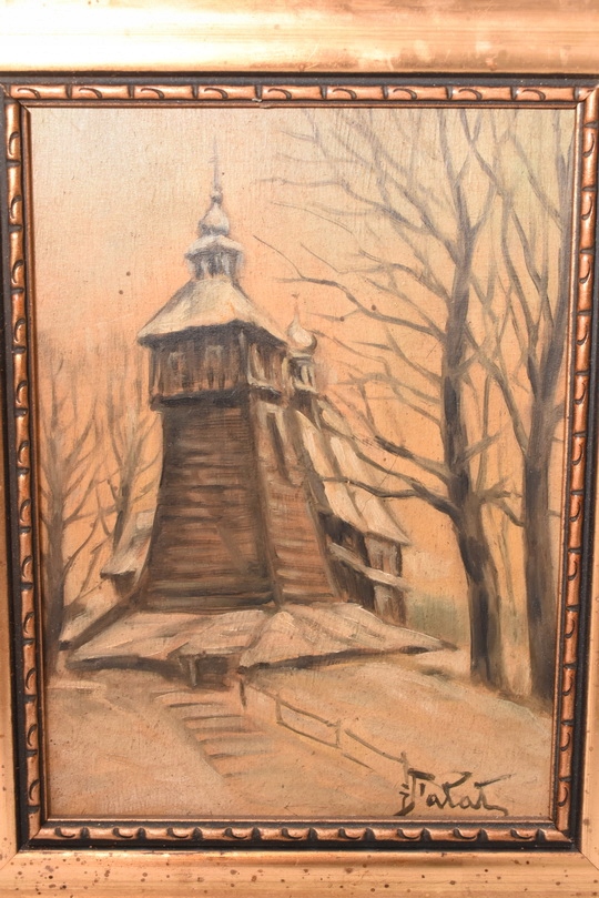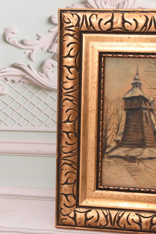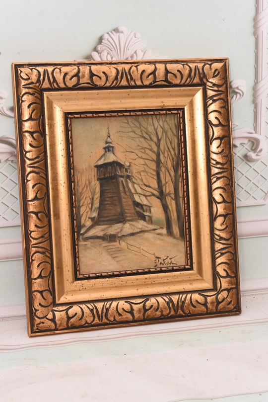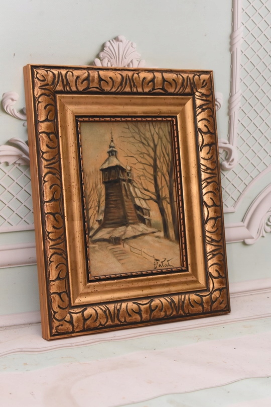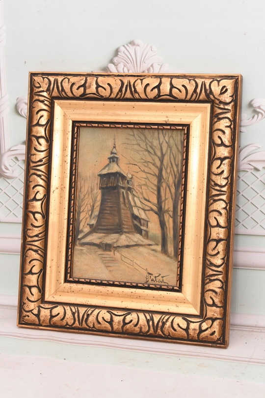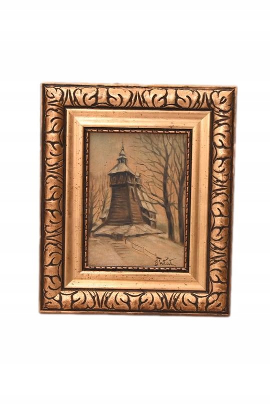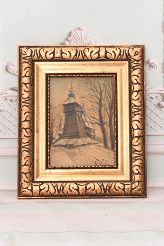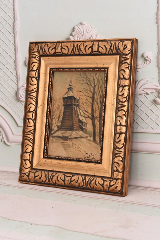 Wyjątkowy obraz sygnowany nazwiskiem Juliana Fałata, przedstawiający drewniany kościół na wzgórzu w zimowym pejzażu Kresów Wschodnich. Dzieło oddaje charakterystyczny dla artysty klimat melancholii, subtelności barw oraz mistrzowskie operowanie światłem. Obraz osadzony w eleganckiej ramie, gotowy do ekspozycji.
