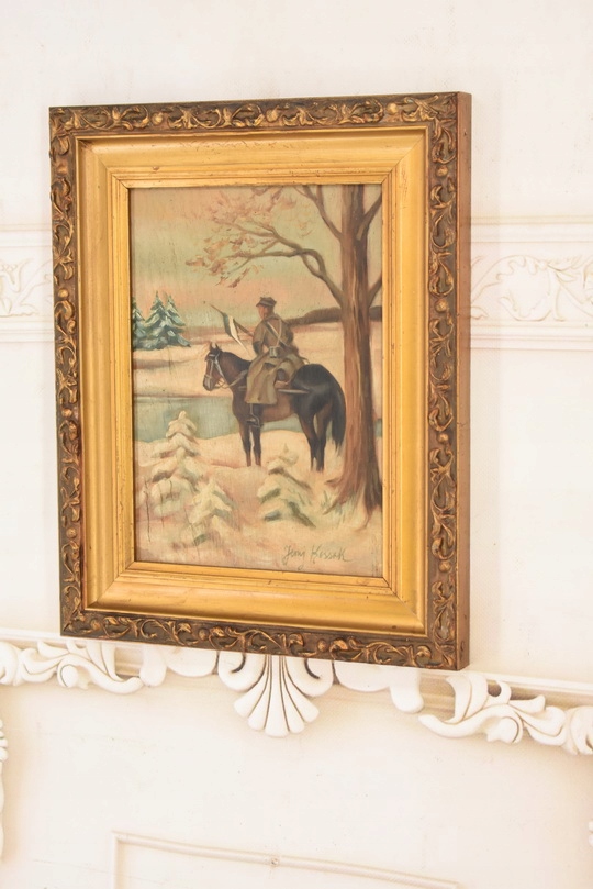 Oprawiony w piękną złotą ramę, która idealnie współgra z samym obrazem.