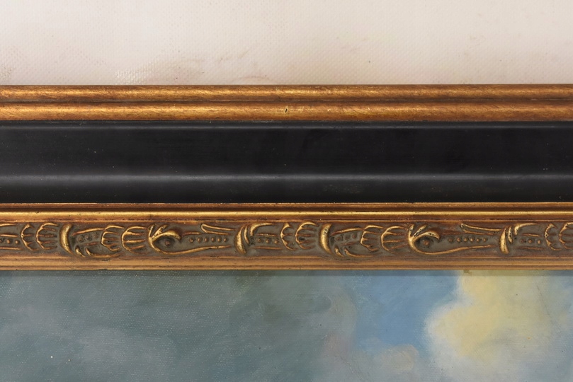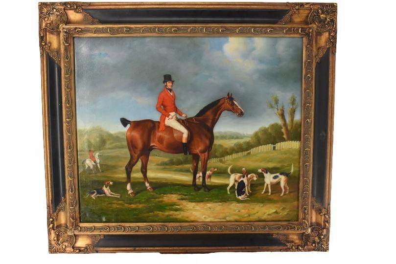 Dynamiczny obraz olejny na płótnie przedstawiający jeźdźca na koniu w towarzystwie psów myśliwskich, uchwycający ruch i energię sceny myśliwskiej. Starannie oddane detale koni, psów i jeźdźca nadają dziełu realistyczny i ekspresyjny charakter. Doskonały do wnętrz klasycznych, myśliwskich i kolekcjonerskich.