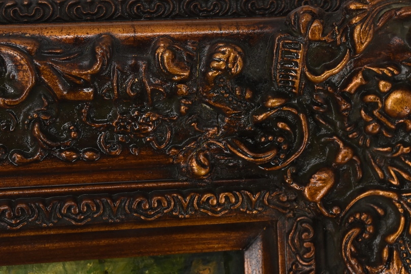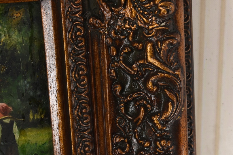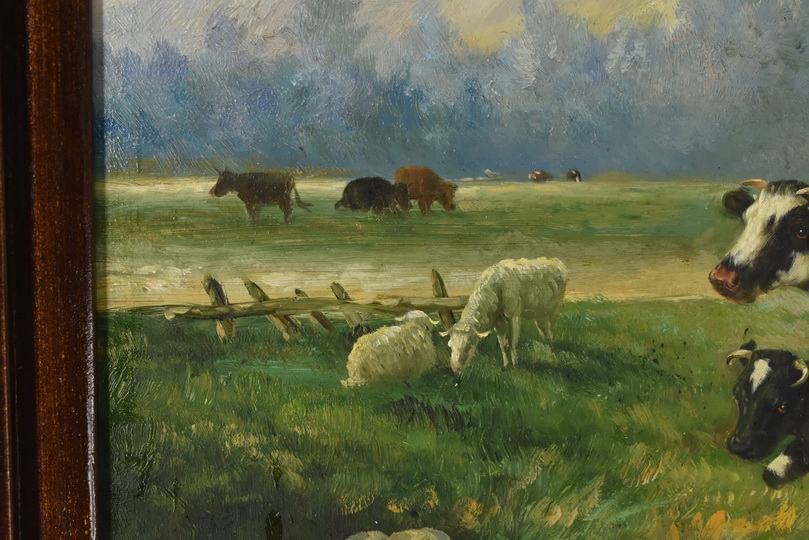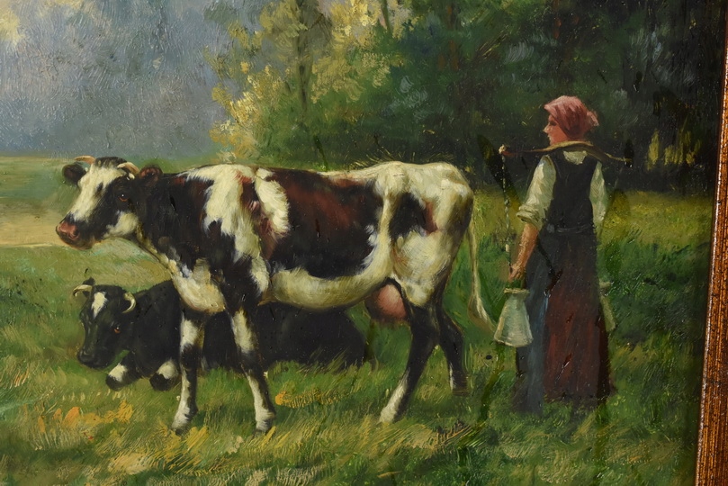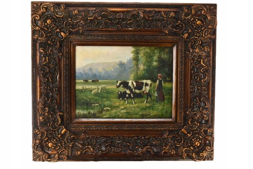 Malowniczy obraz olejny przedstawiający kobietę opiekującą się stadem krów na pastwisku, w sielankowej scenie rodzajowej. Ciepła, naturalna kolorystyka i staranne detale tworzą spokojny, wiejski klimat. Idealny do wnętrz klasycznych, rustykalnych i dla miłośników tematyki wiejskiej.