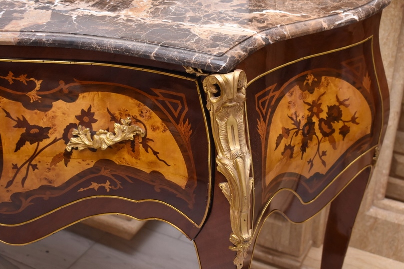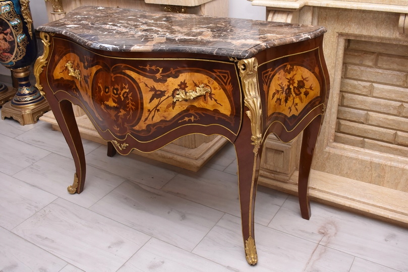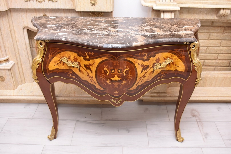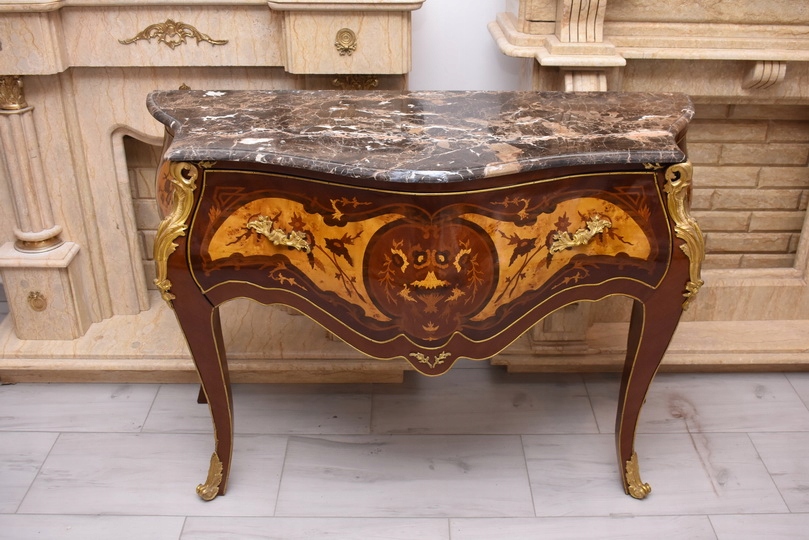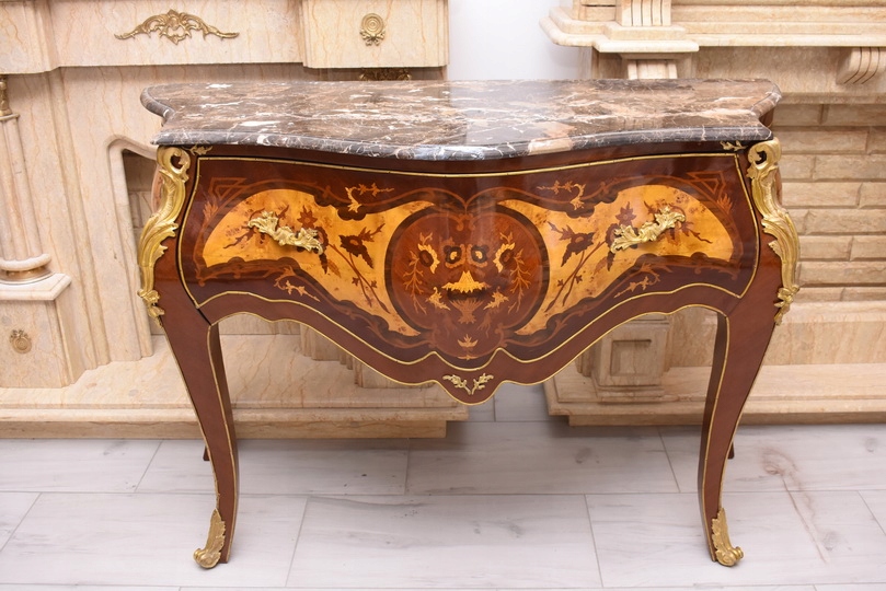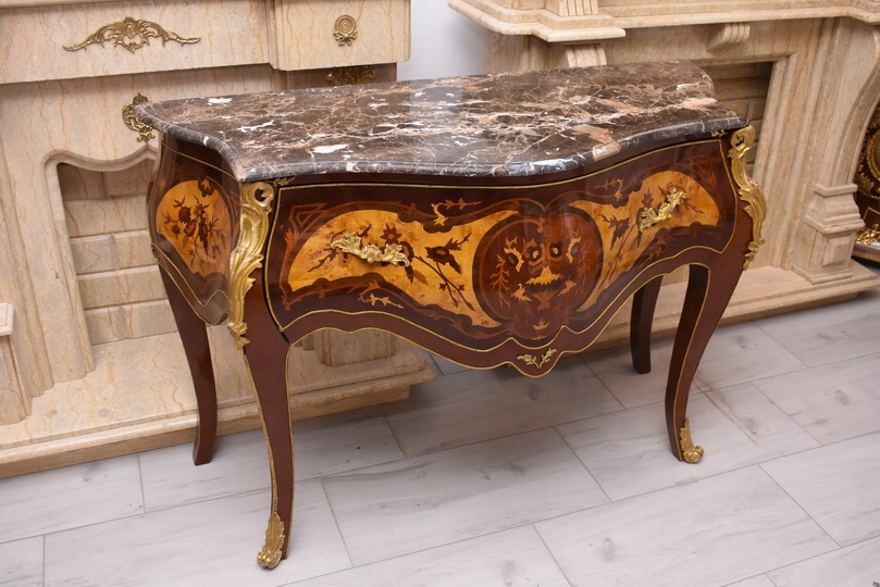 Prezentujemy elegancką komodę w stylu Ludwika XV, zachwycającą lekkością formy oraz bogactwem dekoracji. Mebel został wykonany z wysokiej jakości drewna i zwieńczony marmurowym blatem o delikatnie falowanej linii, idealnie dopasowanej do charakteru epoki.