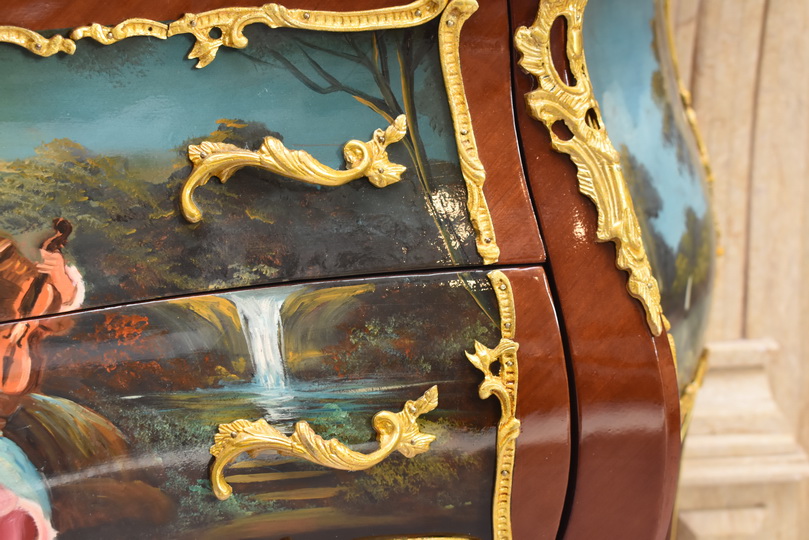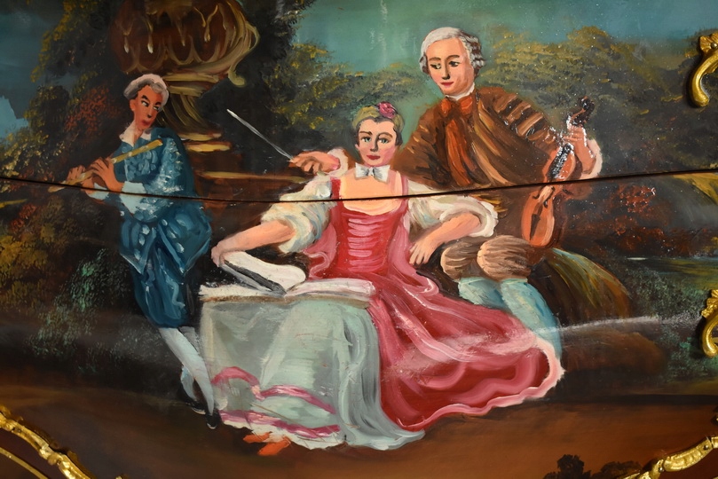 Front komody zdobi ręcznie malowany obraz przedstawiający scenę z życia arystokracji – eleganckie postacie w strojach z epoki, ukazane w romantycznej, parkowej scenerii.