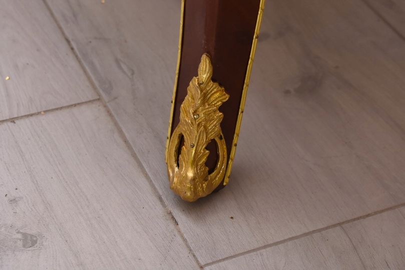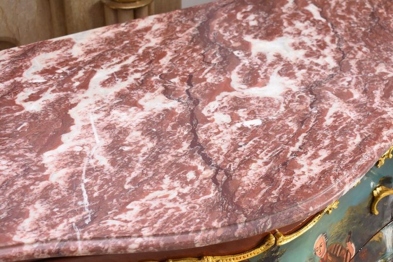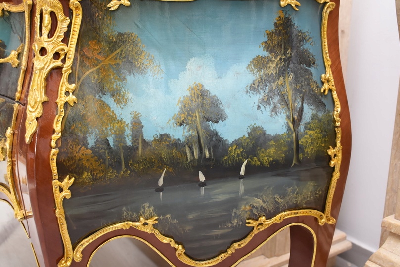 Całość ujęta jest w bogato zdobione złocone aplikacje, które nadają komodzie luksusowego i reprezentacyjnego charakteru. Falujący front, smukłe nogi oraz subtelne złocenia podkreślają lekkość i dekoracyjność formy, będące znakiem rozpoznawczym stylu Ludwika XV.