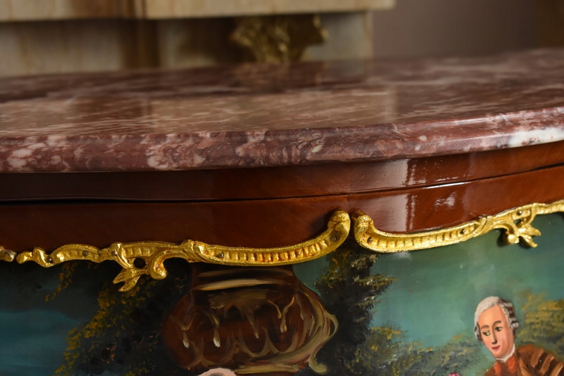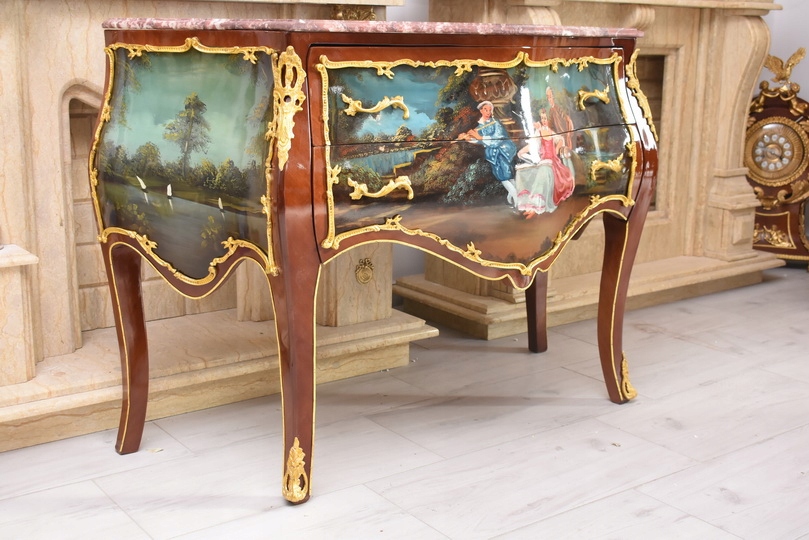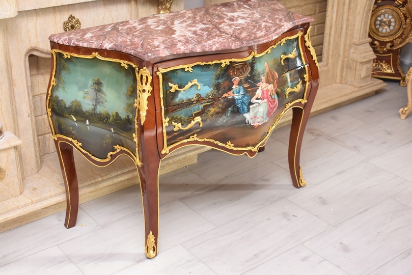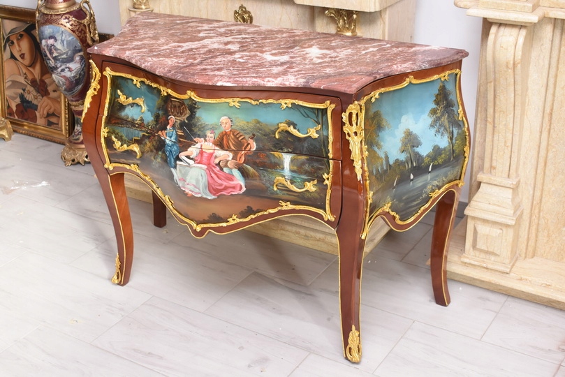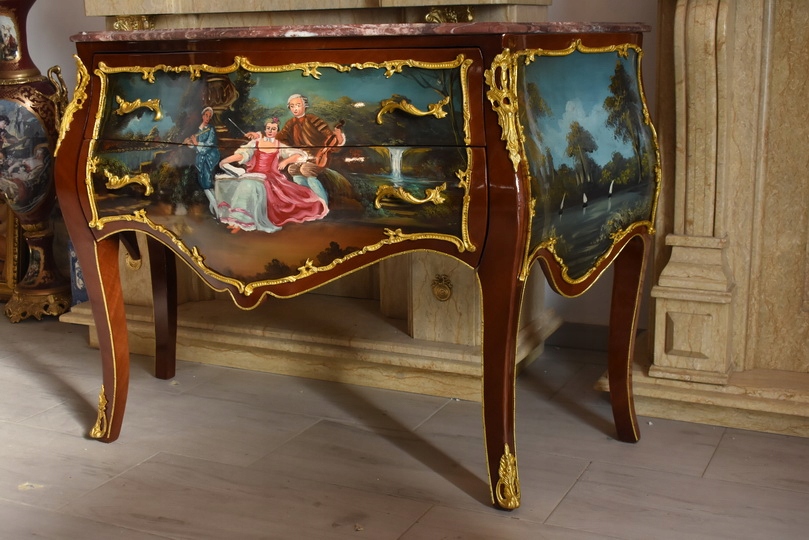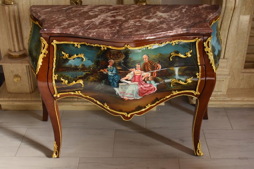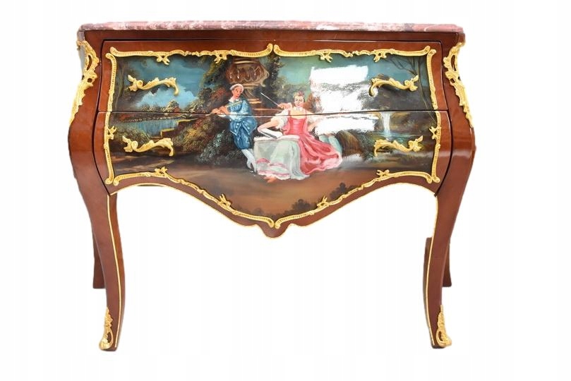 Prezentujemy niezwykle dekoracyjną komodę w stylu Ludwika XV, która zachwyca finezją formy oraz wyjątkową, ręcznie malowaną dekoracją. Mebel wykonany z wysokiej jakości drewna, zwieńczony jest marmurowym blatem o falowanej linii, doskonale podkreślającym elegancję stylu ludwikowskiego.