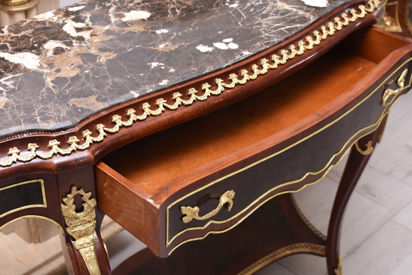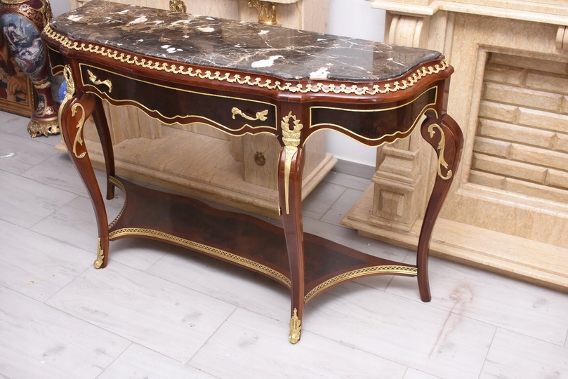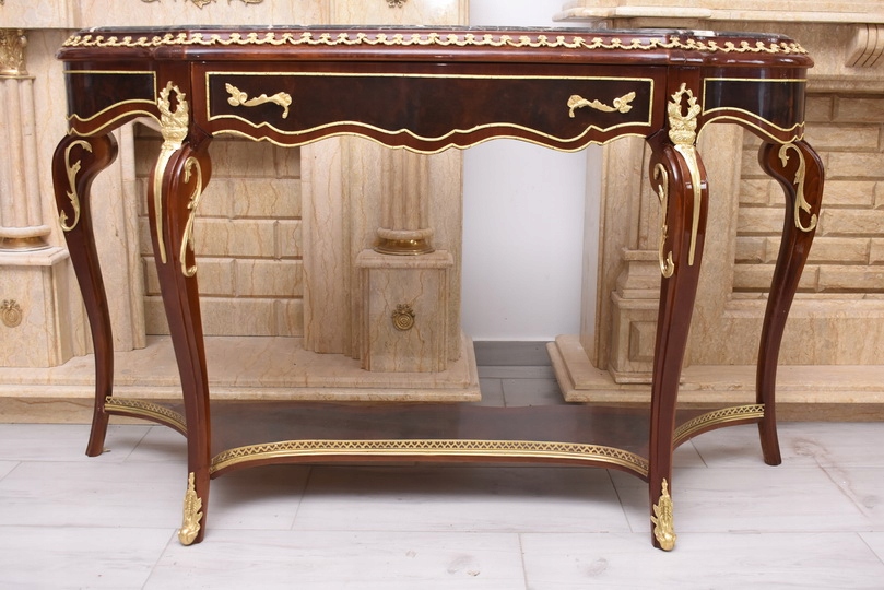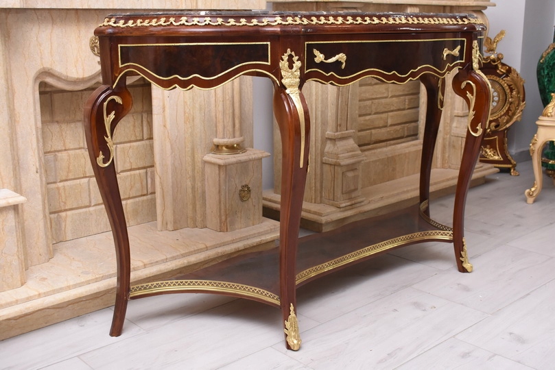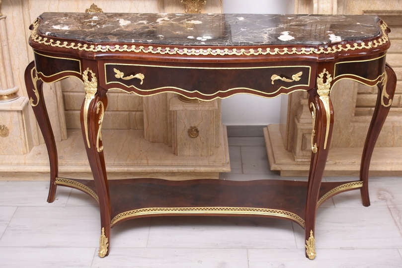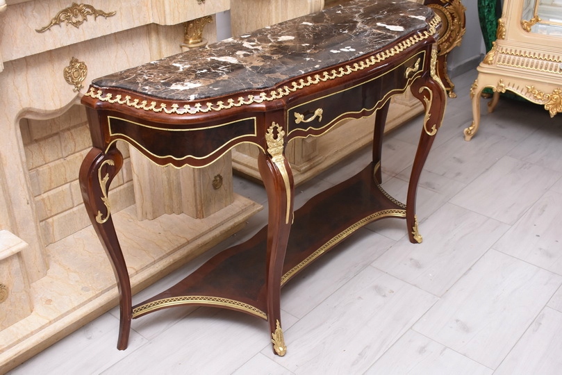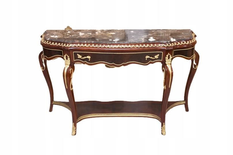 Prezentujemy wyjątkową konsolę w stylu Ludwika XV, która zachwyca smukłą sylwetką, subtelną linią oraz starannie dopracowanymi detalami. Mebel wykonany z wysokiej jakości drewna, zwieńczony jest marmurowym blatem o delikatnie falowanym kształcie, idealnie wpisującym się w estetykę epoki.