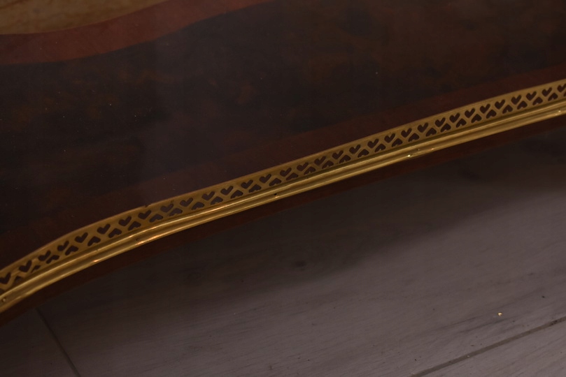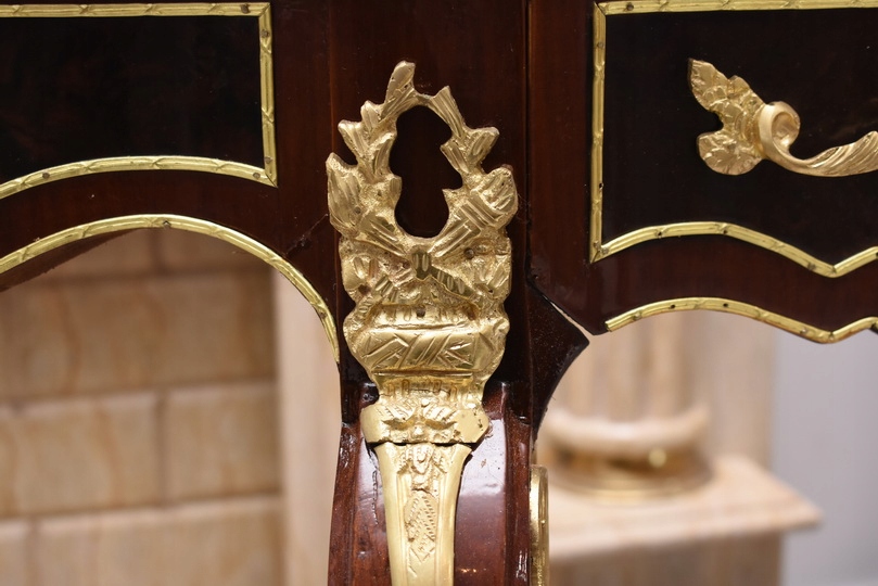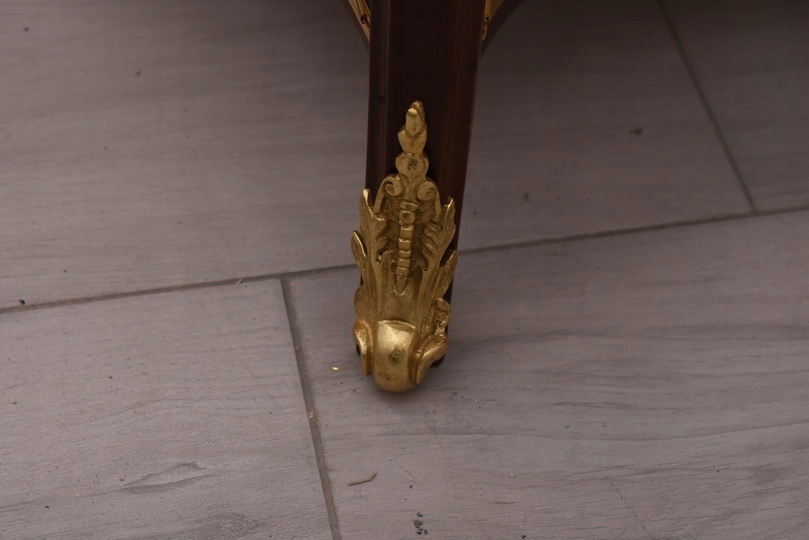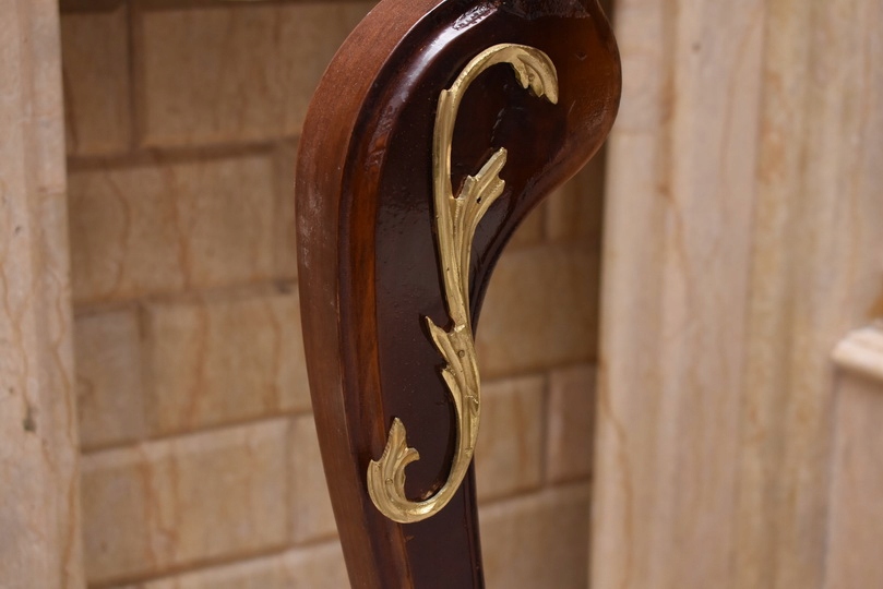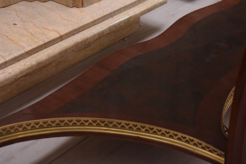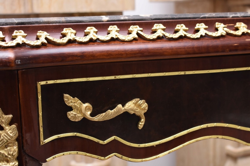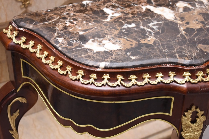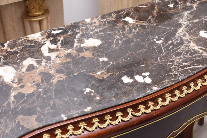 Prezentujemy wyjątkową konsolę w stylu Ludwika XV, która zachwyca smukłą sylwetką, subtelną linią oraz starannie dopracowanymi detalami. Mebel wykonany z wysokiej jakości drewna, zwieńczony jest marmurowym blatem o delikatnie falowanym kształcie, idealnie wpisującym się w estetykę epoki.