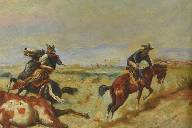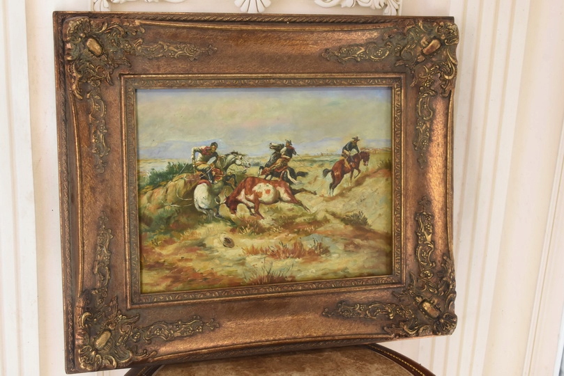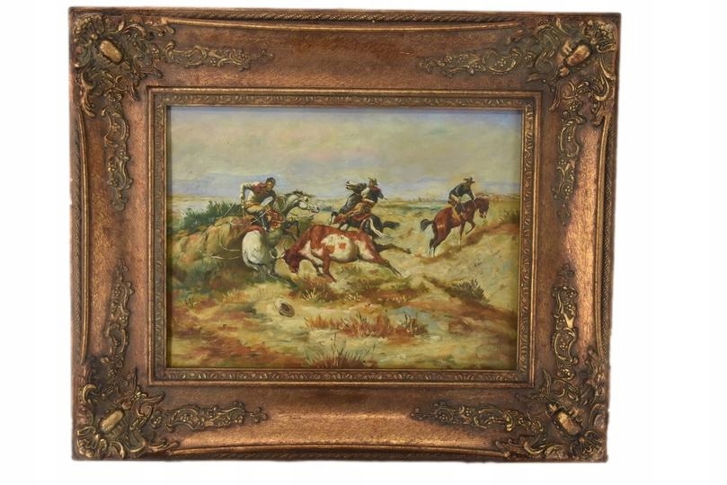 Dynamiczny obraz olejny przedstawiający kowbojów polujących na byka, pełen ruchu i emocji Dzikiego Zachodu. Wyrazista scena i realistyczne detale przyciągają uwagę, a elegancka, zdobiona rama podkreśla artystyczny i dekoracyjny charakter obrazu. Doskonały akcent do wnętrz klasycznych, gabinetów i przestrzeni z charakterem.