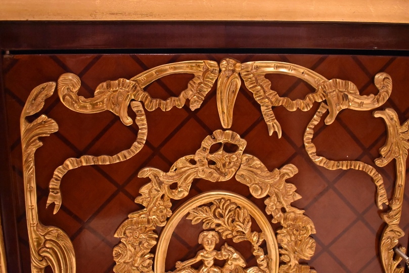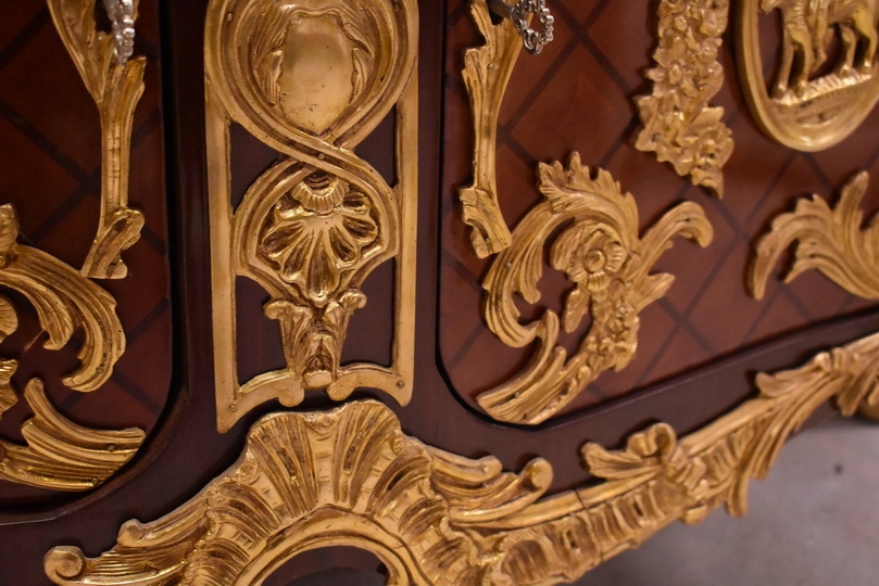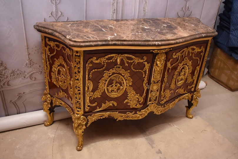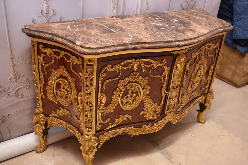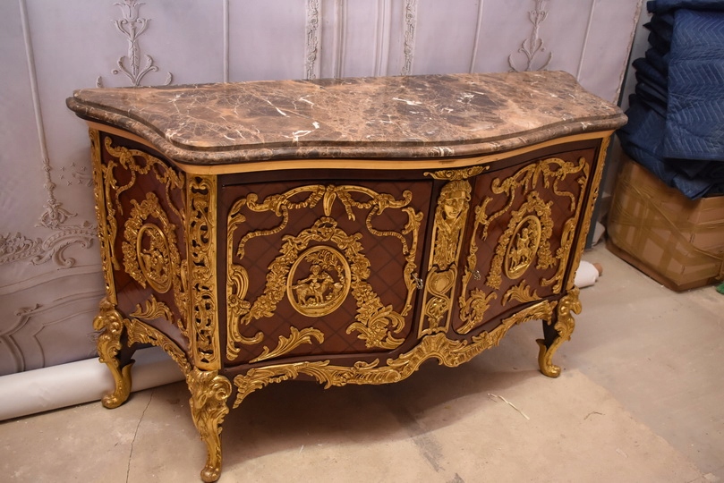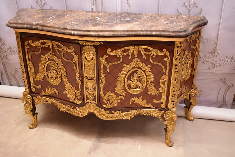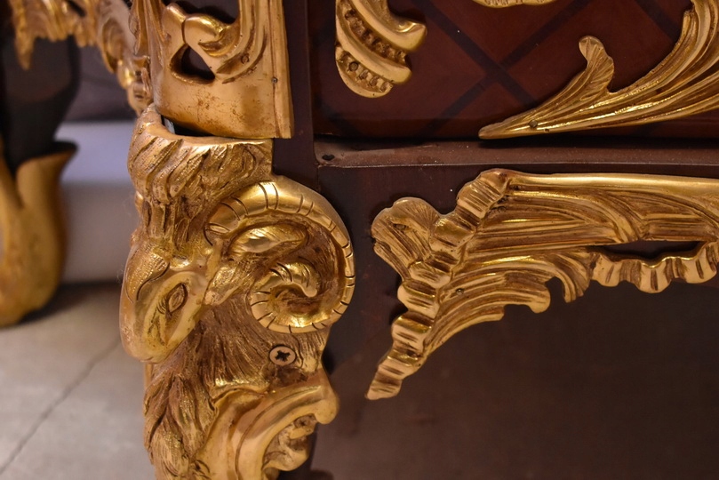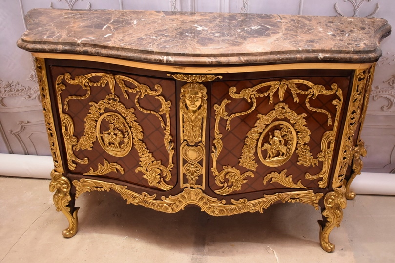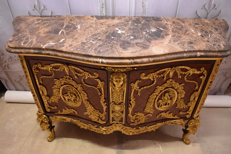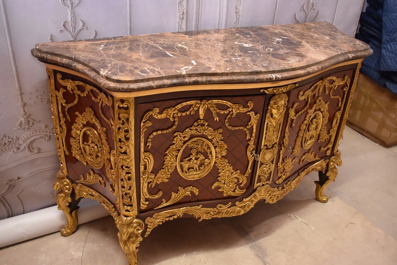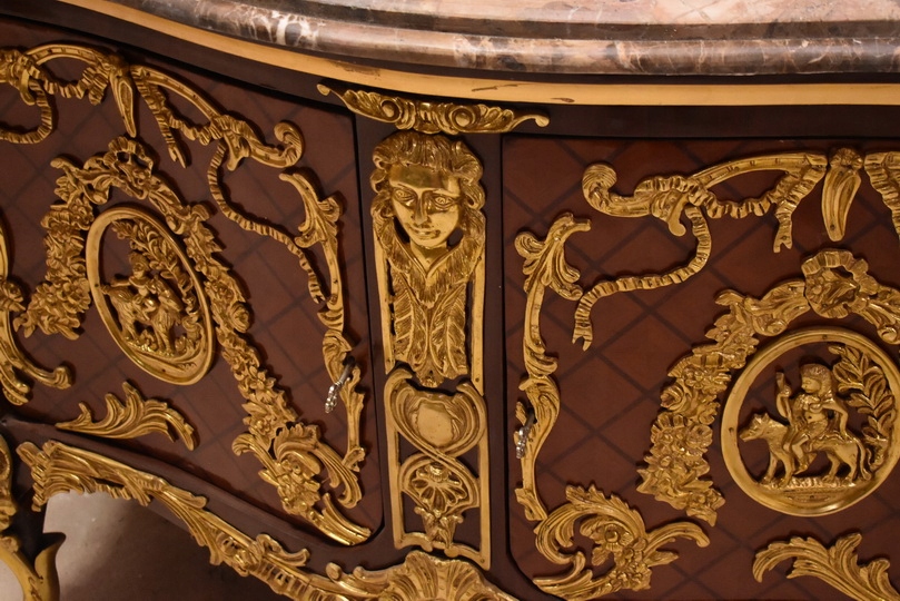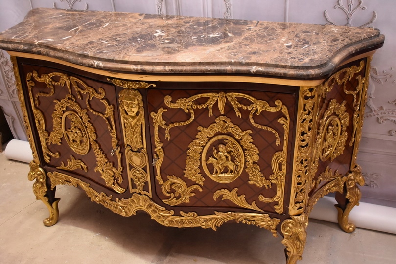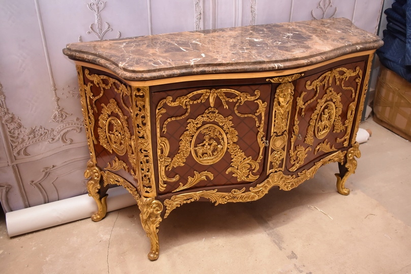 Na sprzedaż wyjątkowa, barokowa komoda wykonana z drewna, bogato zdobiona okuciami z brązu oraz zwieńczona masywnym blatem z naturalnego marmuru.