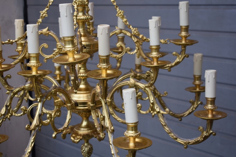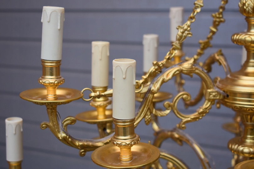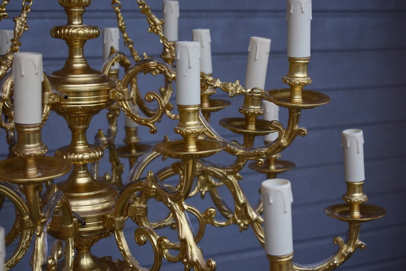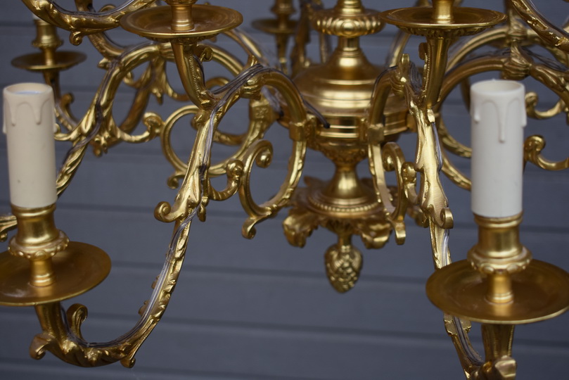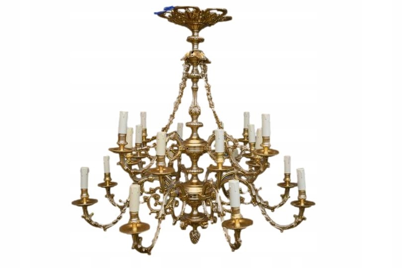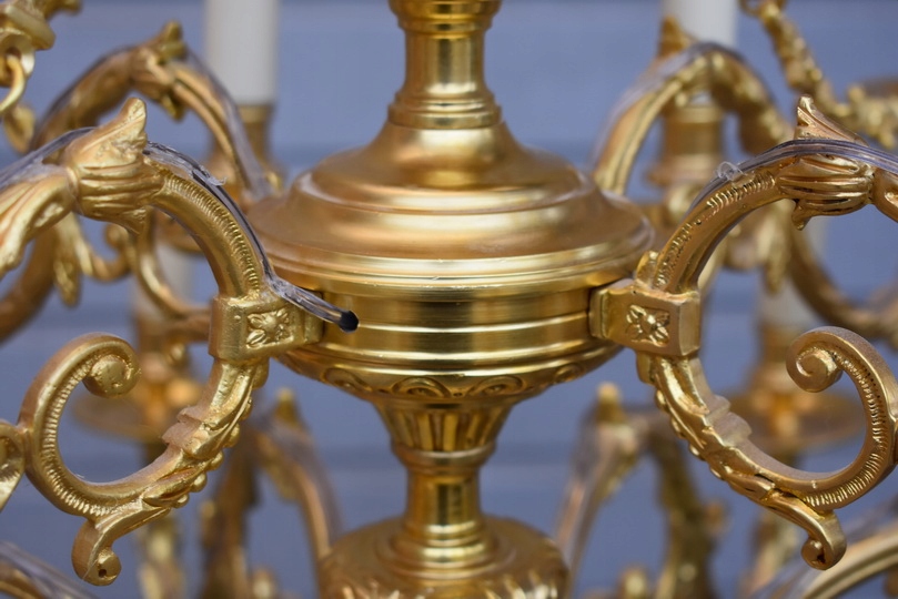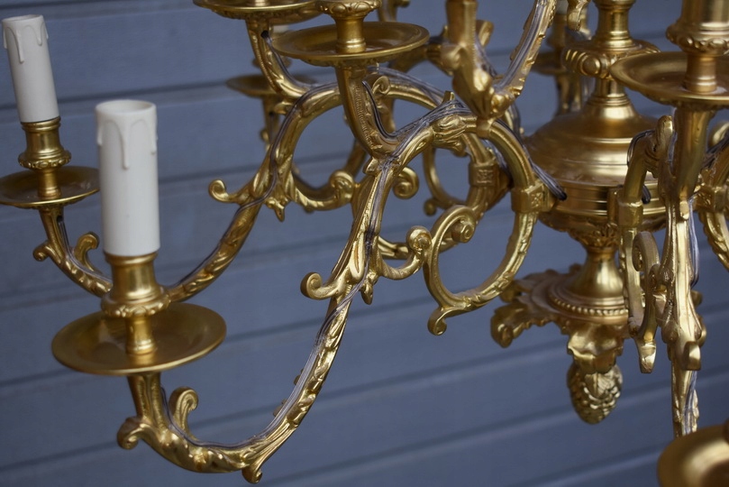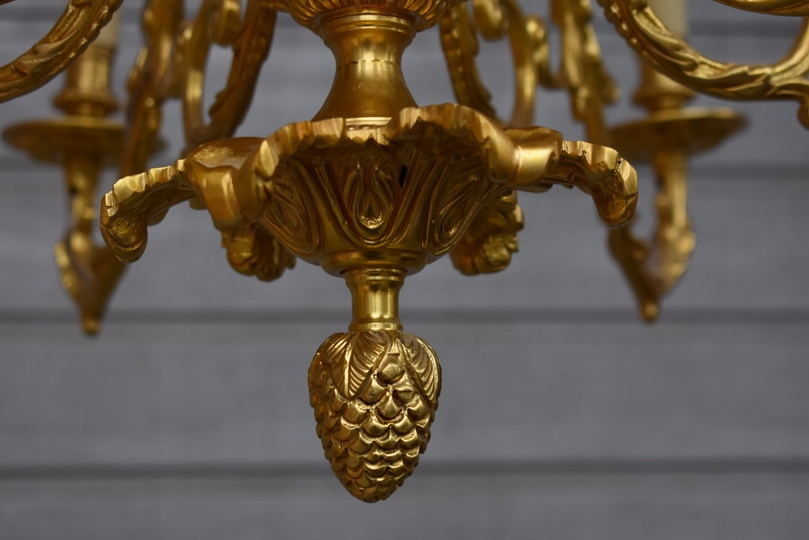 Reprezentacyjny żyrandol barokowy wykonany z wysokiej jakości brązu złoconego, bogato zdobiony klasycznymi ornamentami.