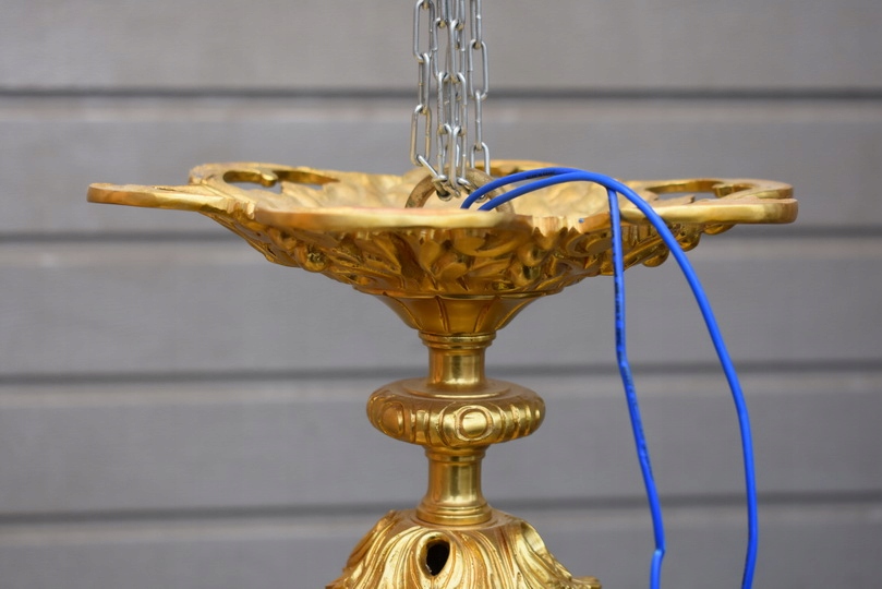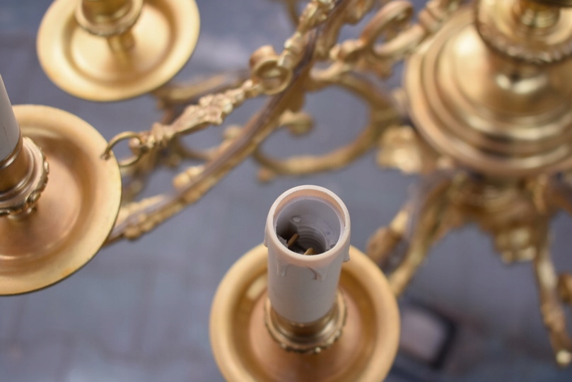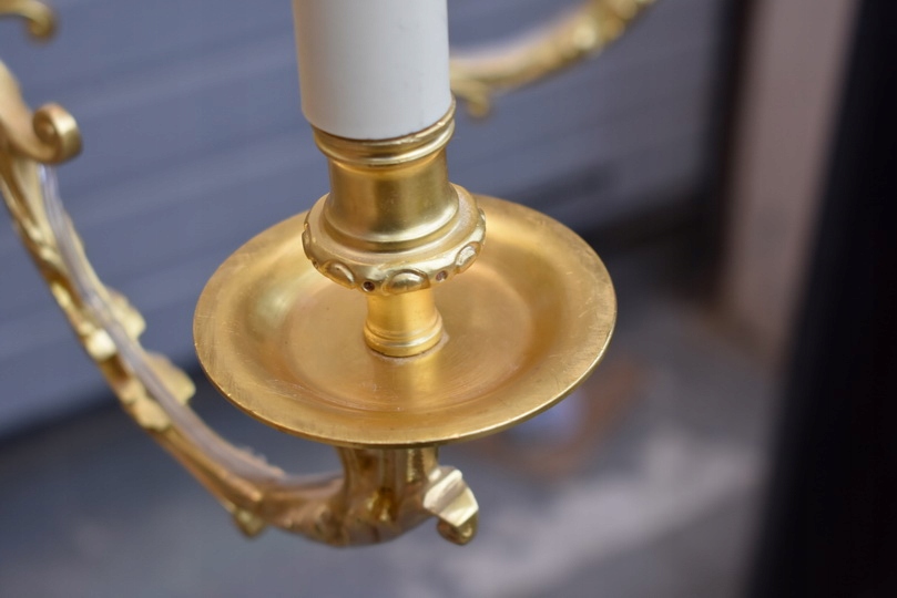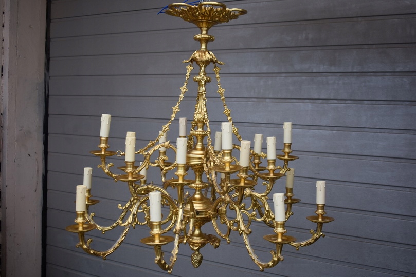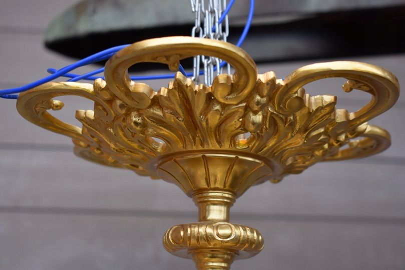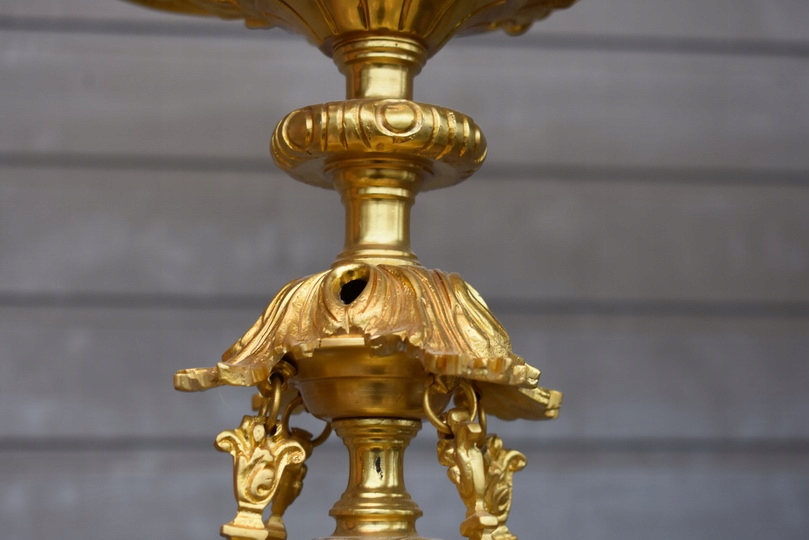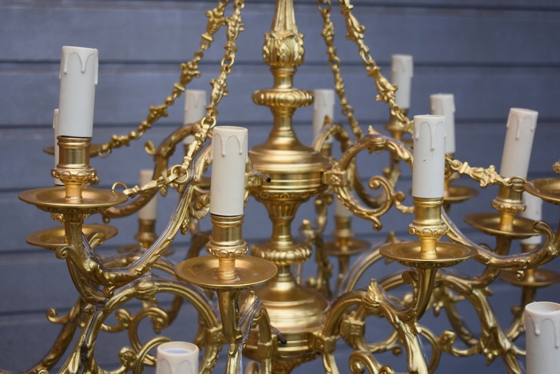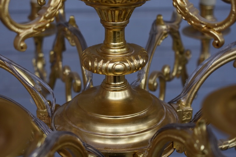 Reprezentacyjny żyrandol barokowy wykonany z wysokiej jakości brązu złoconego, bogato zdobiony klasycznymi ornamentami.