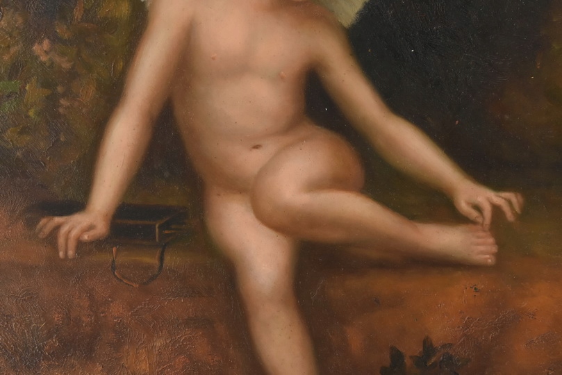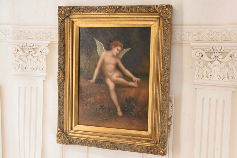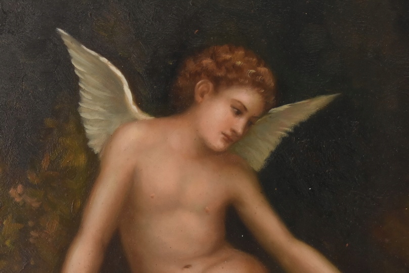 Klasyczny obraz olejny przedstawiający Kupidyna z rozpostartymi skrzydłami, symbol miłości i niewinności. Ciepła kolorystyka i staranne detale nadają dziełu ponadczasowy charakter, a elegancka złota rama podkreśla jego dekoracyjność. Idealny wybór do wnętrz klasycznych, romantycznych i stylowych.
