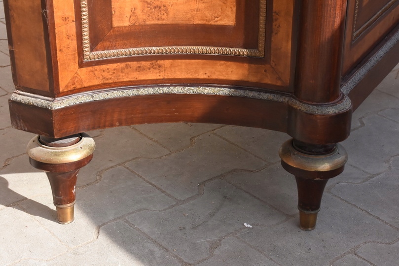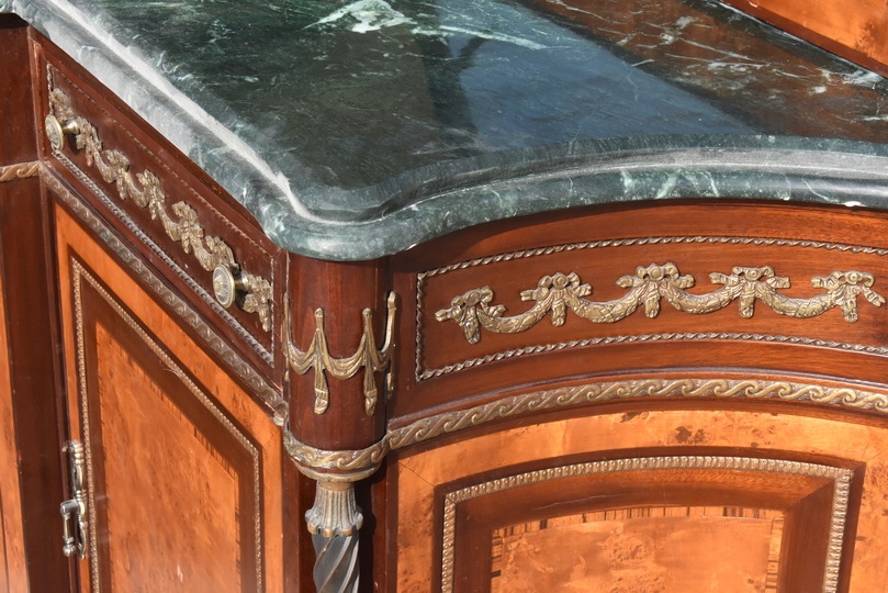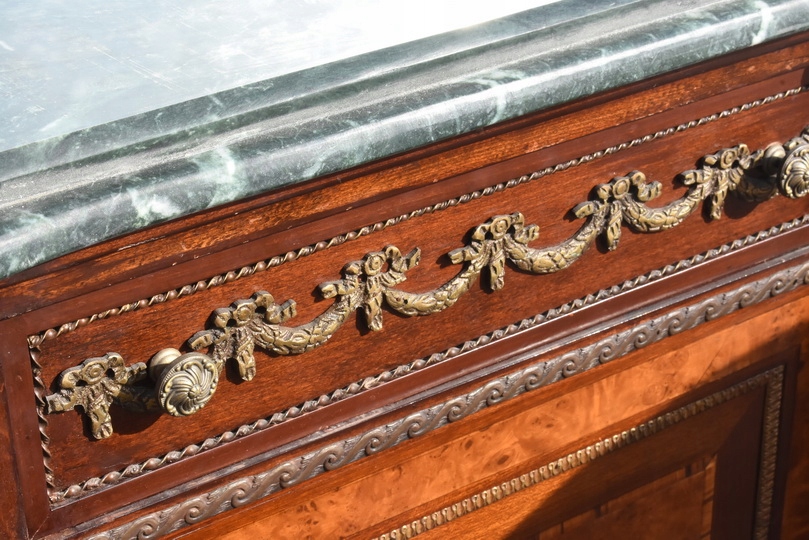 Zestaw zachwyca ręcznymi intarsjami, szlachetną formą oraz monumentalnością wykonania. To nie jest replika – to oryginalny komplet antyczny, który przetrwał pokolenia i nadal zachwyca swoim charakterem.