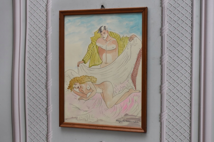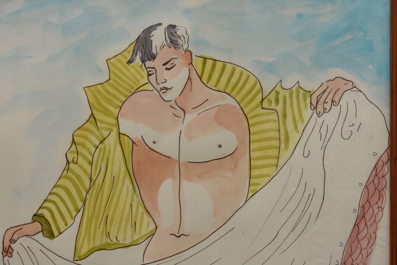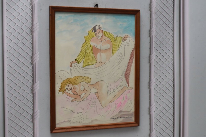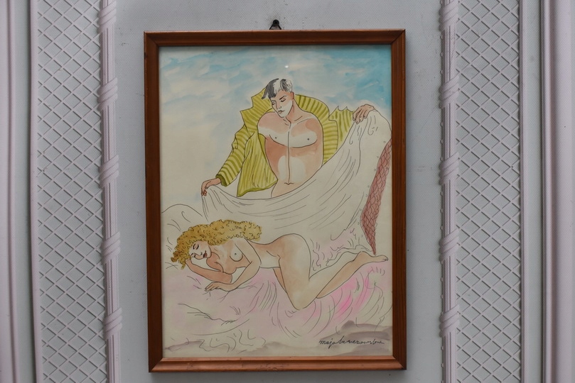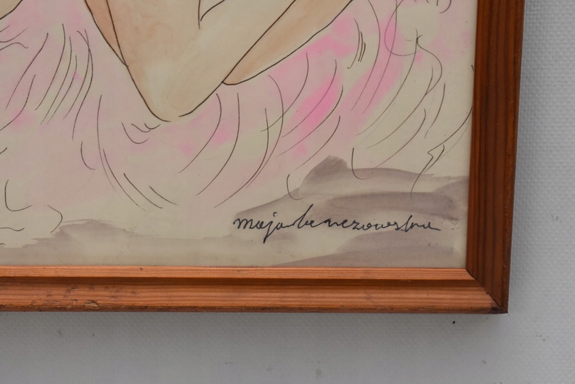 Obraz wykonany techniką akwareli na papierze. Delikatna kolorystyka i lekka, swobodna forma nadają pracy subtelny i elegancki charakter. Akwarela tworzy miękkie przejścia barwne, podkreślając nastrój i emocje przedstawionej sceny.