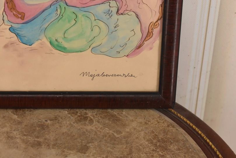 Obraz wykonany techniką akwareli na papierze. Delikatna kolorystyka i lekka, swobodna forma nadają pracy subtelny i elegancki charakter. Akwarela tworzy miękkie przejścia barwne, podkreślając nastrój i emocje przedstawionej sceny.