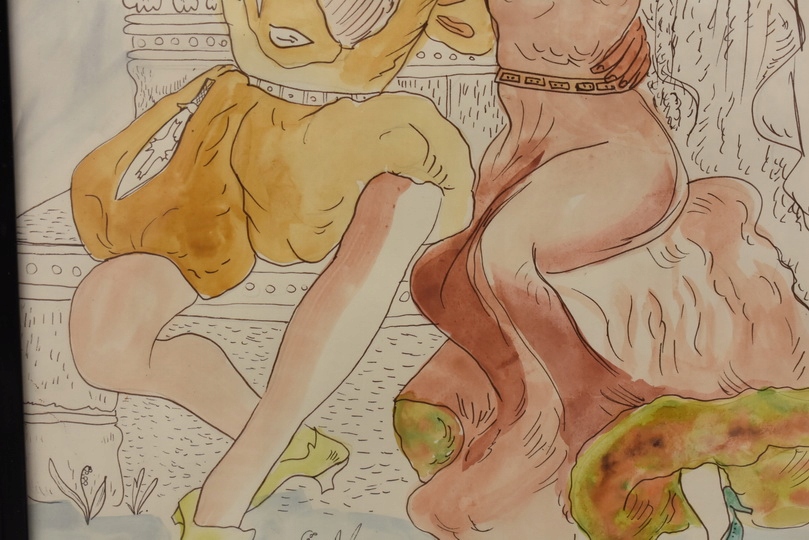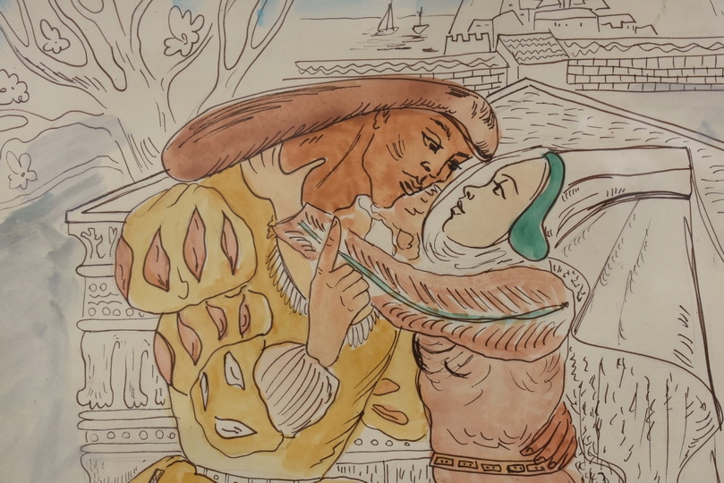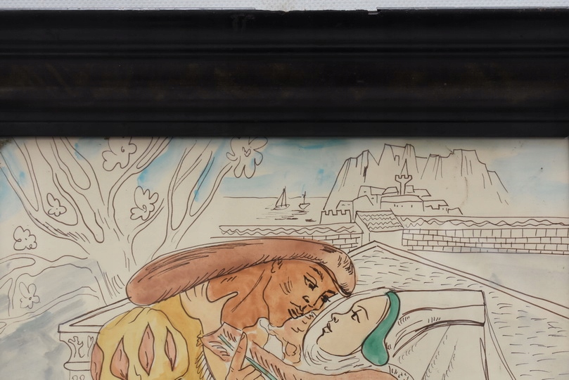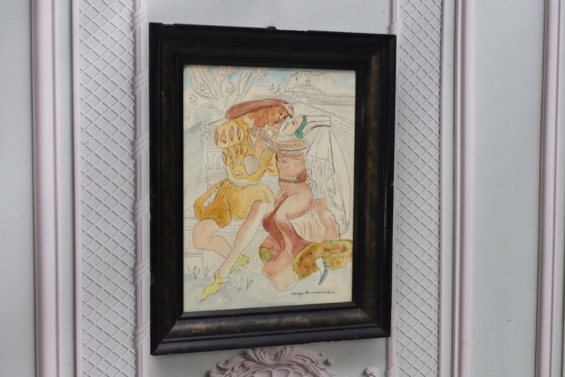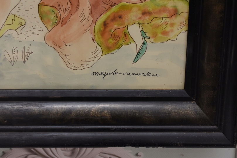 Obraz wykonany techniką akwareli na papierze. Delikatna kolorystyka i lekka, swobodna forma nadają pracy subtelny i elegancki charakter. Akwarela tworzy miękkie przejścia barwne, podkreślając nastrój i emocje przedstawionej sceny.