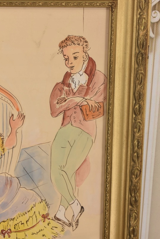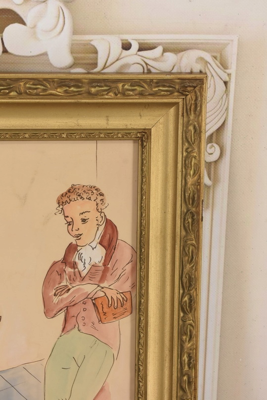 Obraz wykonany techniką akwareli na papierze. Delikatna kolorystyka i lekka, swobodna forma nadają pracy subtelny i elegancki charakter. Akwarela tworzy miękkie przejścia barwne, podkreślając nastrój i emocje przedstawionej sceny.