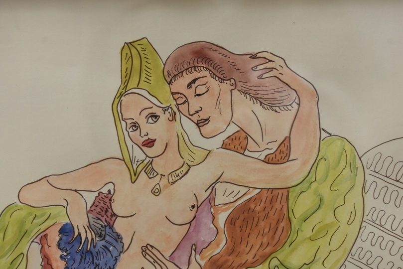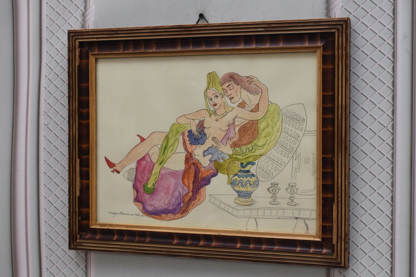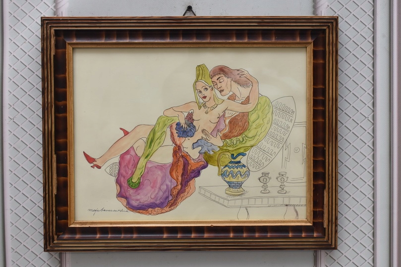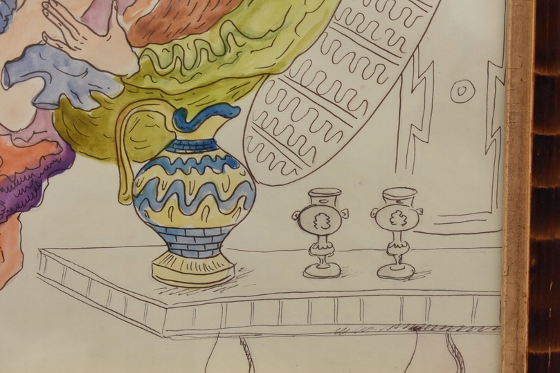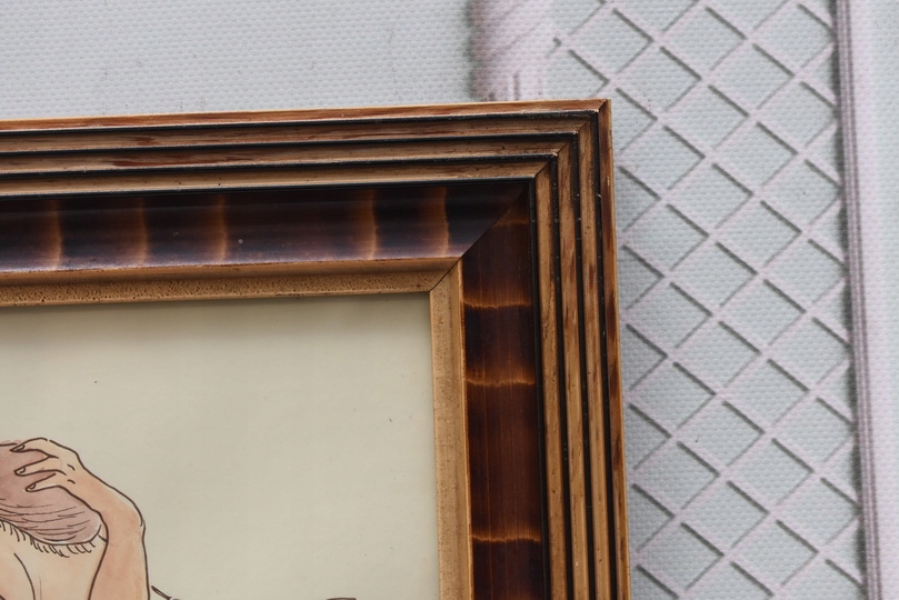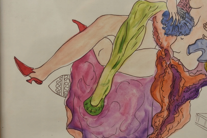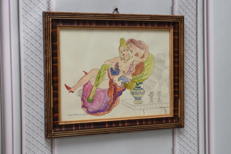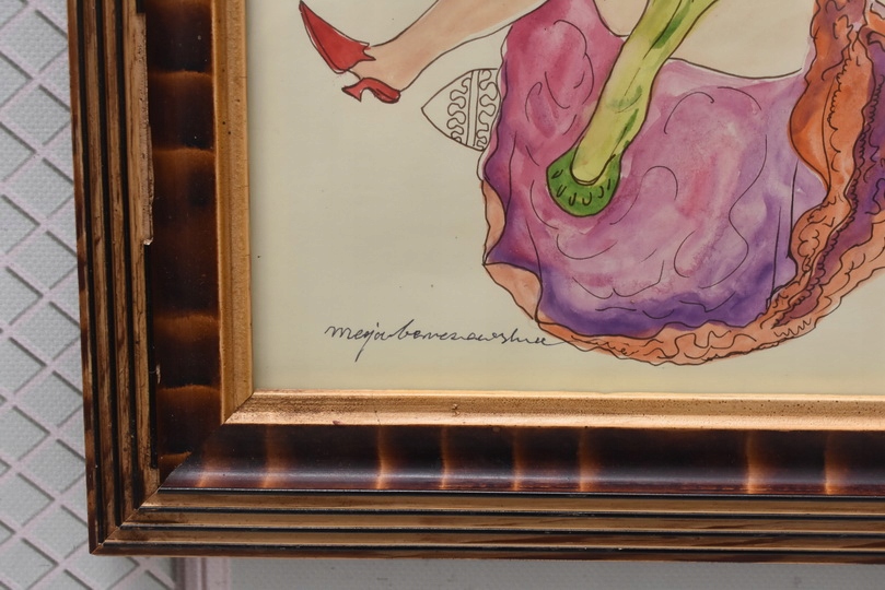 Obraz wykonany techniką akwareli na papierze. Delikatna kolorystyka i lekka, swobodna forma nadają pracy subtelny i elegancki charakter. Akwarela tworzy miękkie przejścia barwne, podkreślając nastrój i emocje przedstawionej sceny.