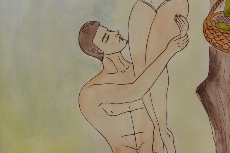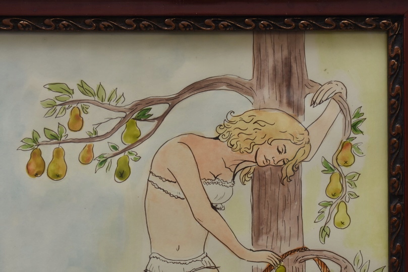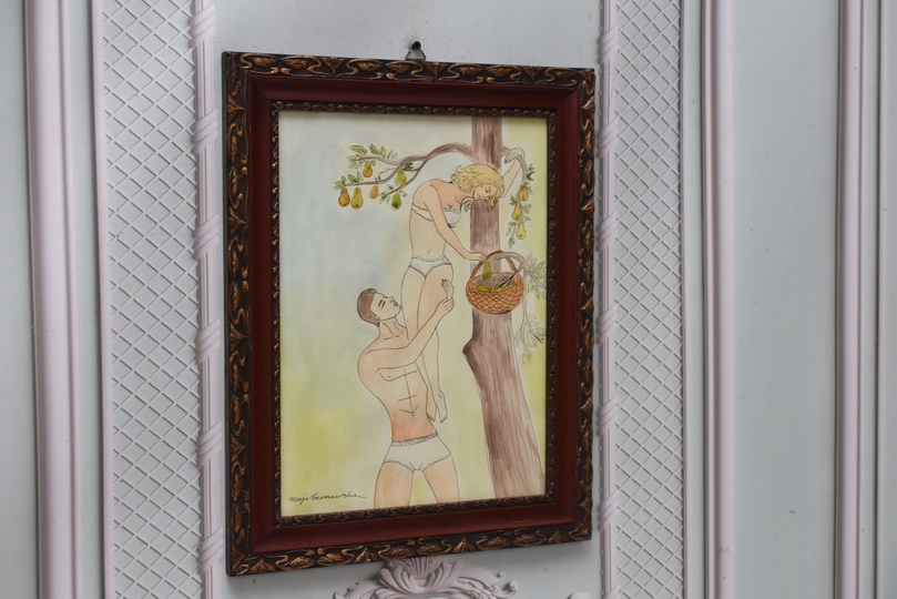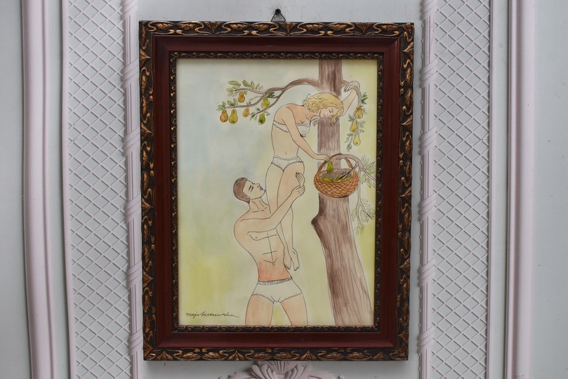 Obraz wykonany techniką akwareli na papierze. Delikatna kolorystyka i lekka, swobodna forma nadają pracy subtelny i elegancki charakter. Akwarela tworzy miękkie przejścia barwne, podkreślając nastrój i emocje przedstawionej sceny.