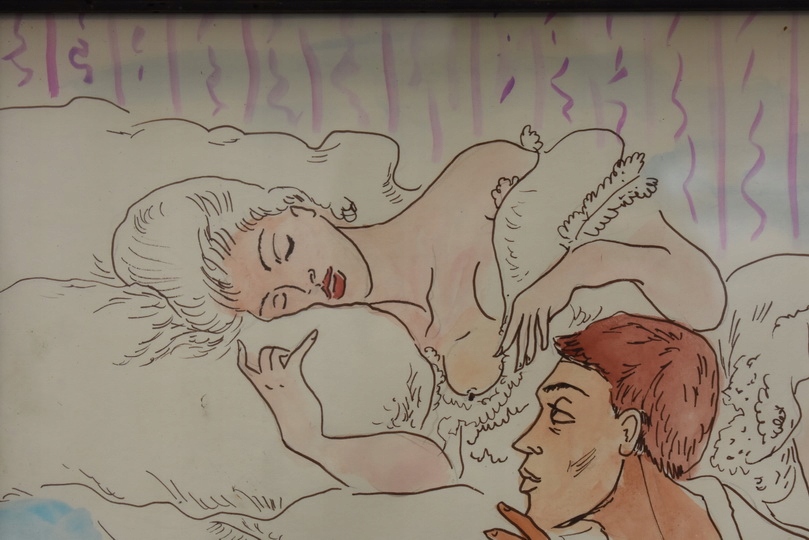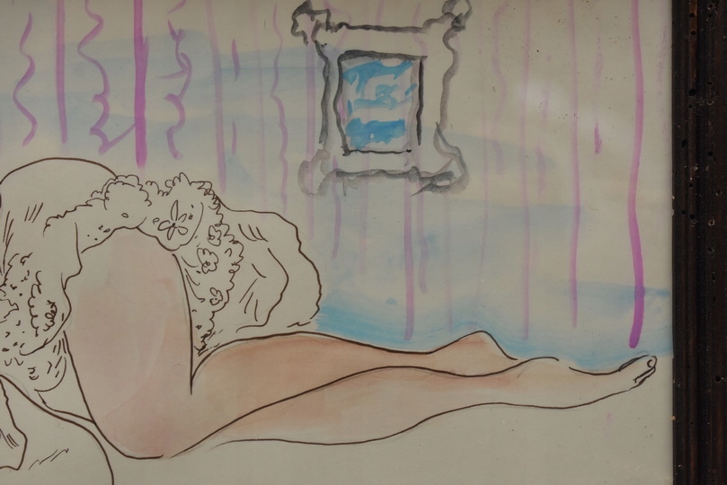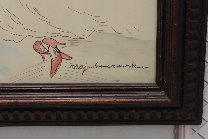 Obraz wykonany techniką akwareli na papierze. Delikatna kolorystyka i lekka, swobodna forma nadają pracy subtelny i elegancki charakter. Akwarela tworzy miękkie przejścia barwne, podkreślając nastrój i emocje przedstawionej sceny.