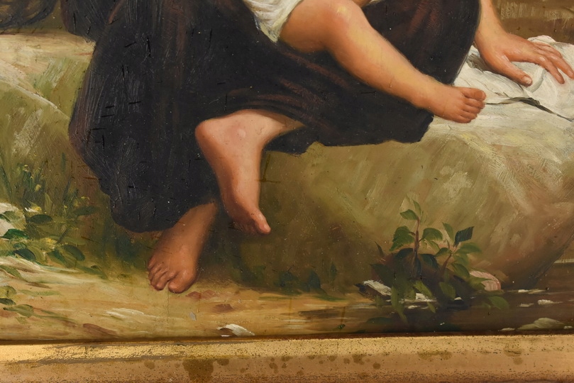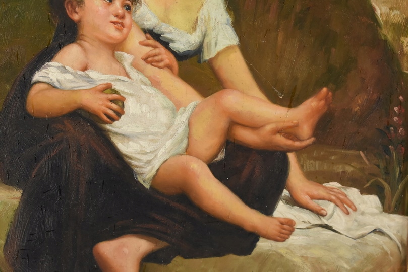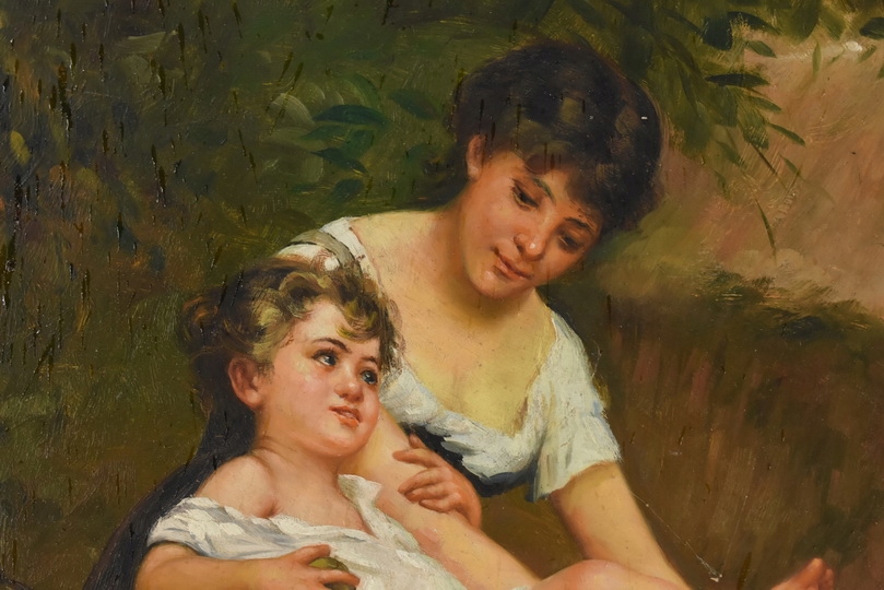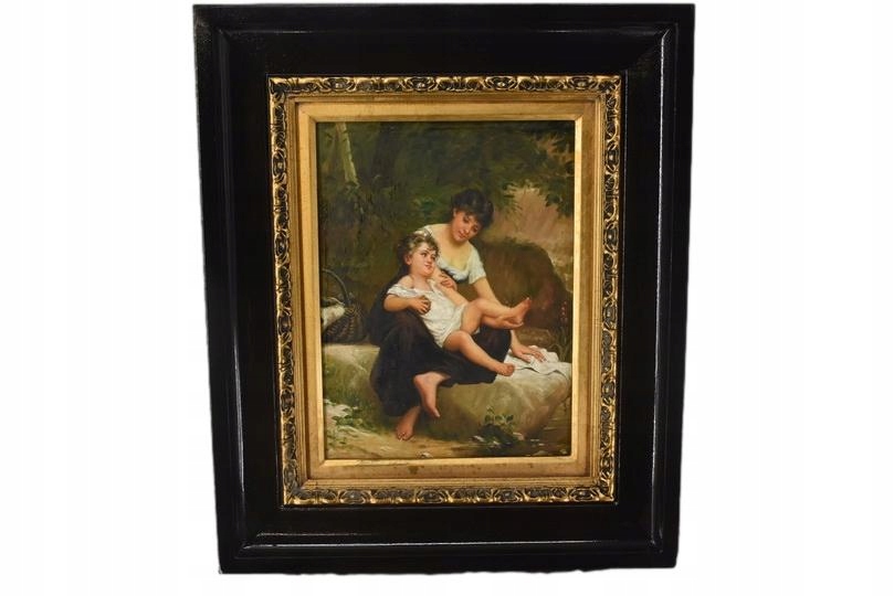 Urokliwy obraz olejny przedstawiający matkę z dzieckiem, emanujący ciepłem, miłością i rodzinną bliskością. Subtelna kolorystyka i delikatne detale nadają dziełu spokojny, ponadczasowy charakter, a elegancka złoto-czarna rama podkreśla jego dekoracyjny i artystyczny walor. Idealny do wnętrz klasycznych, przytulnych i rodzinnych.