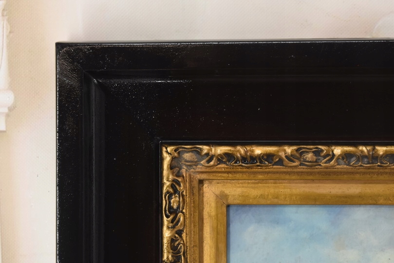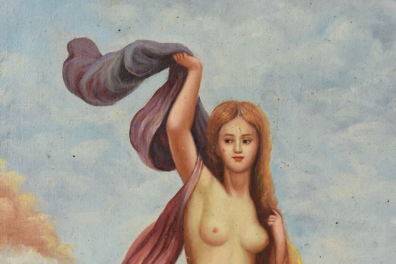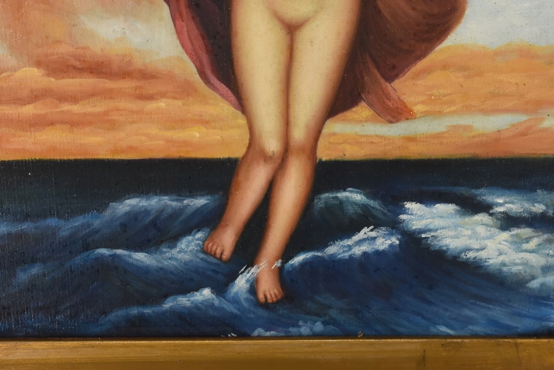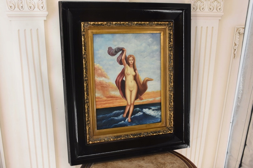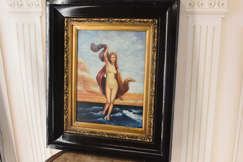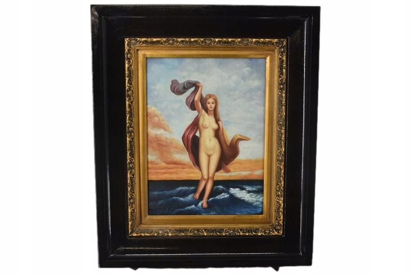 Wyrafinowany obraz olejny przedstawiający nagą kobietę idącą po wodzie, łączący elementy aktu i portretu w subtelnej, artystycznej kompozycji. Delikatna kolorystyka i płynność form nadają dziełu zmysłowy i harmonijny charakter, a elegancka złoto-czarna rama podkreśla jego dekoracyjny i prestiżowy walor. Idealny do wnętrz klasycznych, nowoczesnych i loftowych.