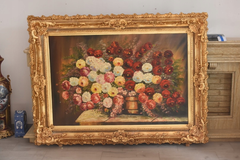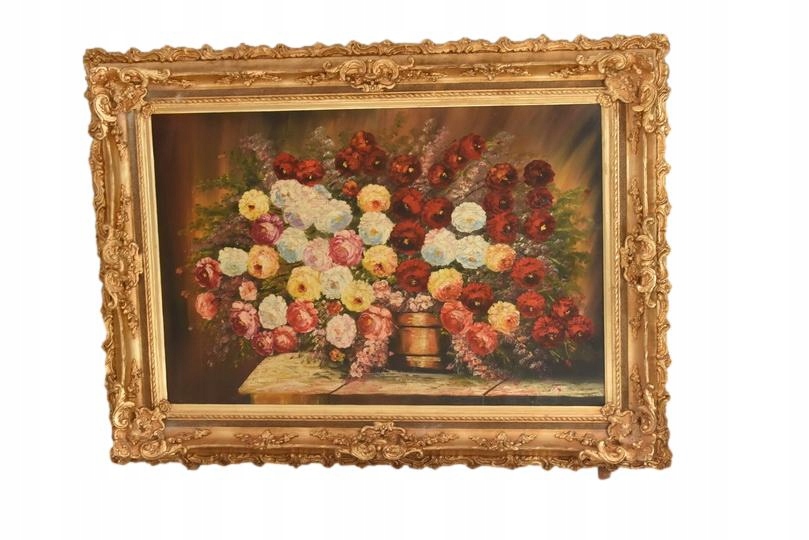 Przedmiotem sprzedaży jest efektowny obraz olejny przedstawiający bogatą kompozycję kwiatową z dominacją róż w różnych odcieniach. Dzieło charakteryzuje się ciepłą kolorystyką i klasycznym stylem malarskim, który nada elegancji każdemu wnętrzu.