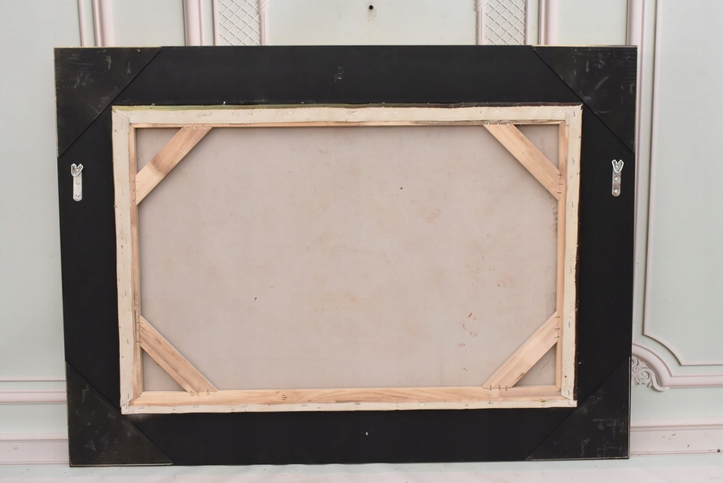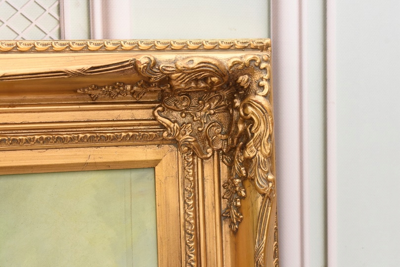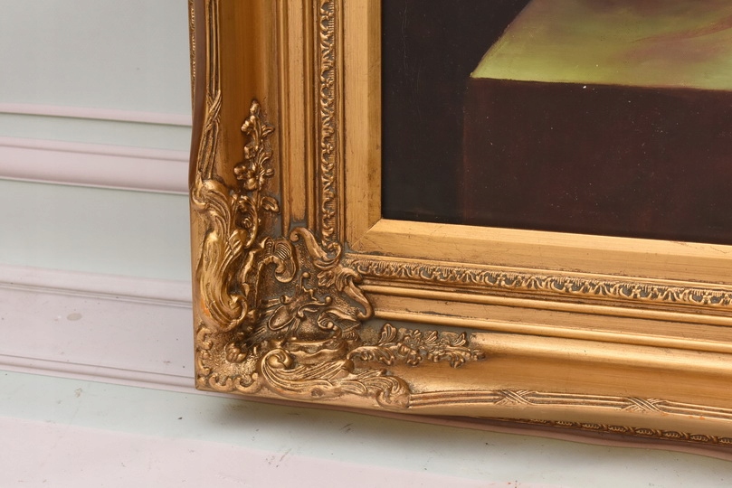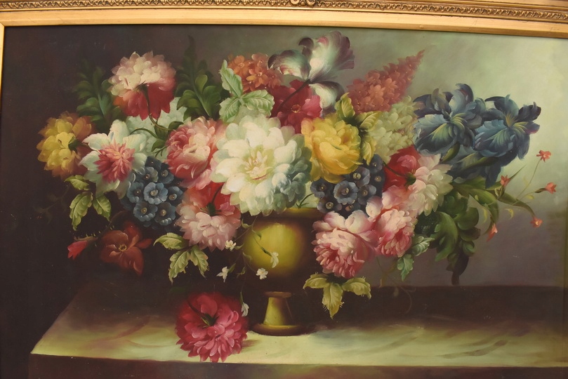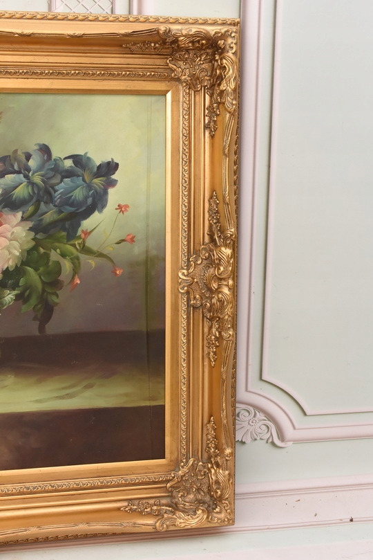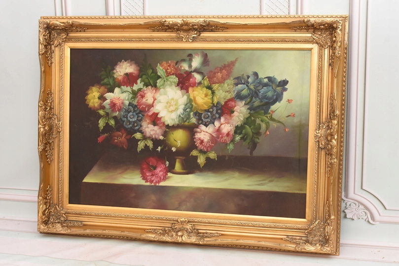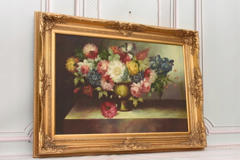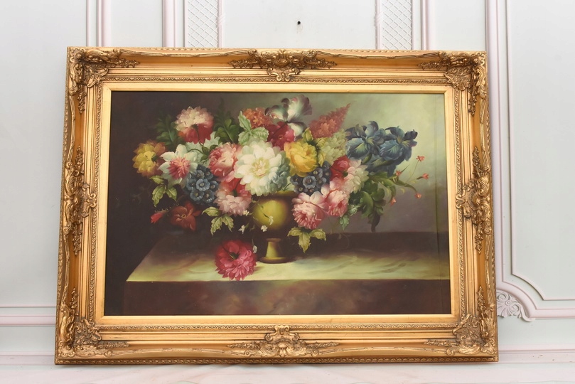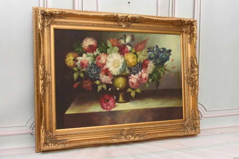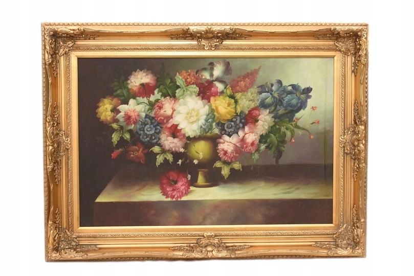 Piękny obraz olejny przedstawiający martwą naturę z kwiatami w wazonie, oprawiony w elegancką złotą ramę. Idealny do salonu, jadalni czy gabinetu, wprowadzając klasyczny urok i kolor do wnętrza.