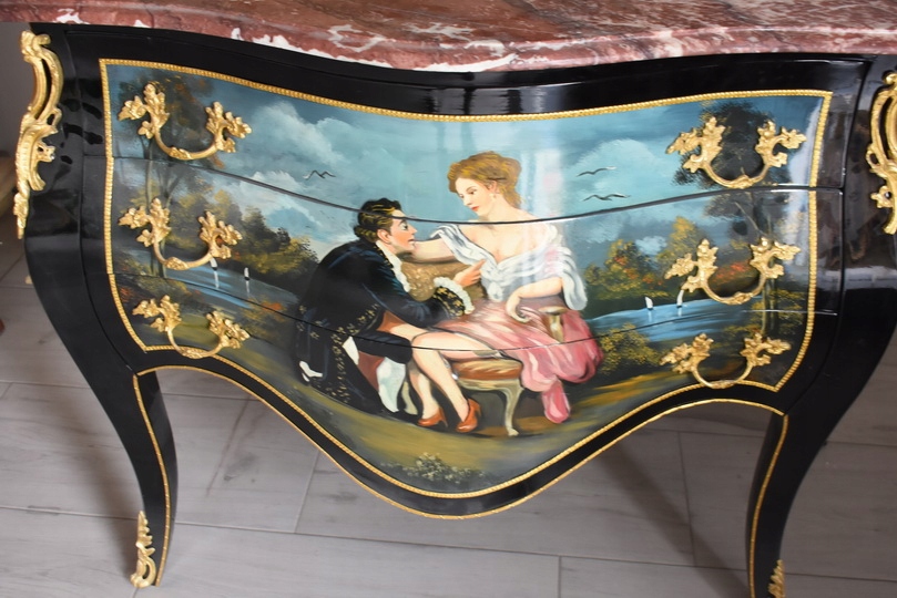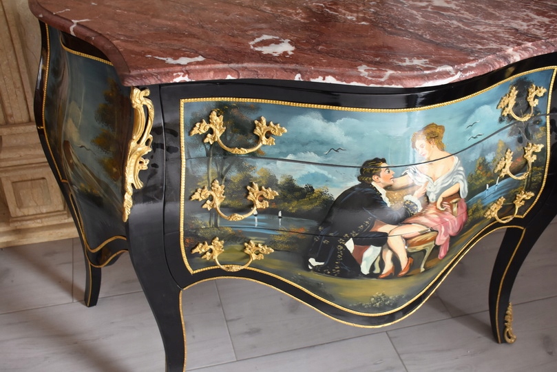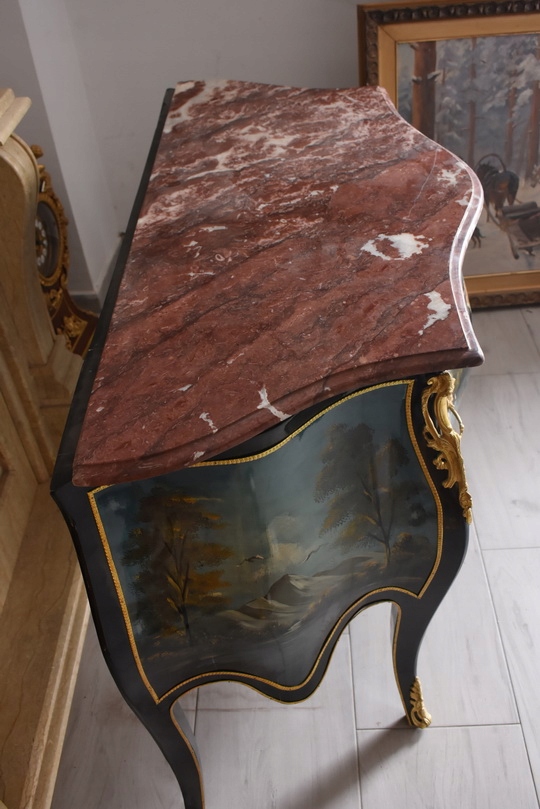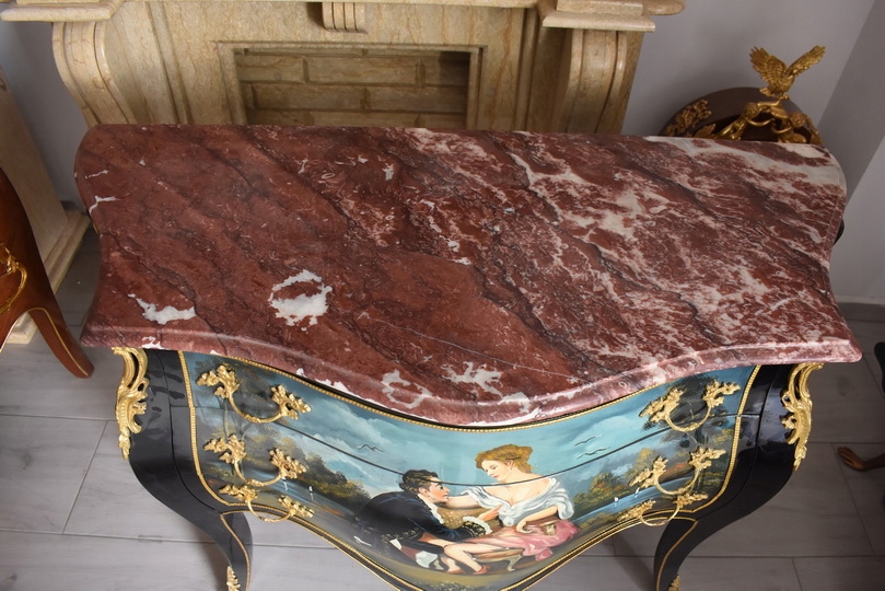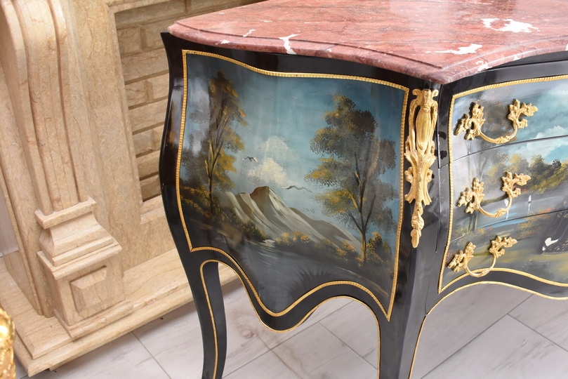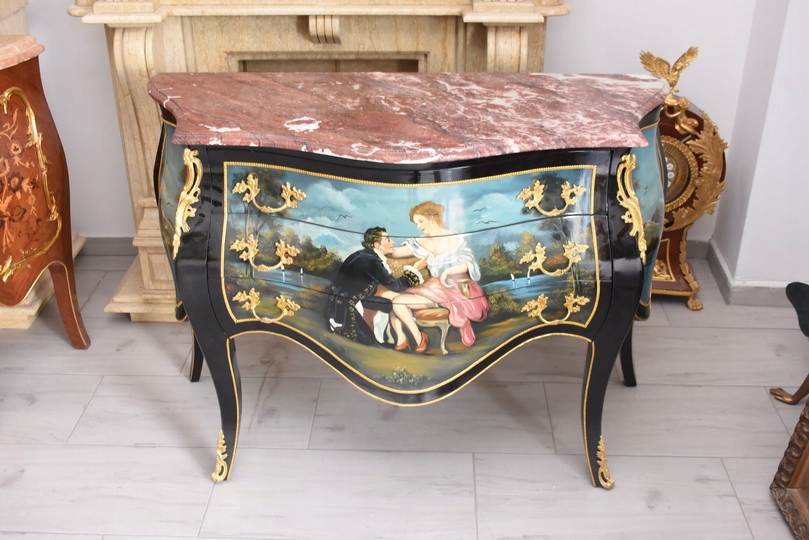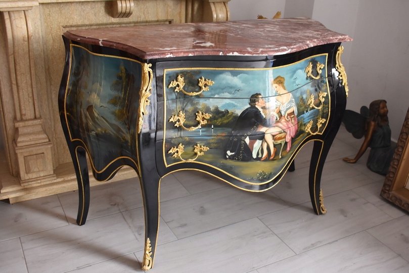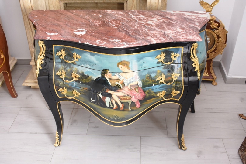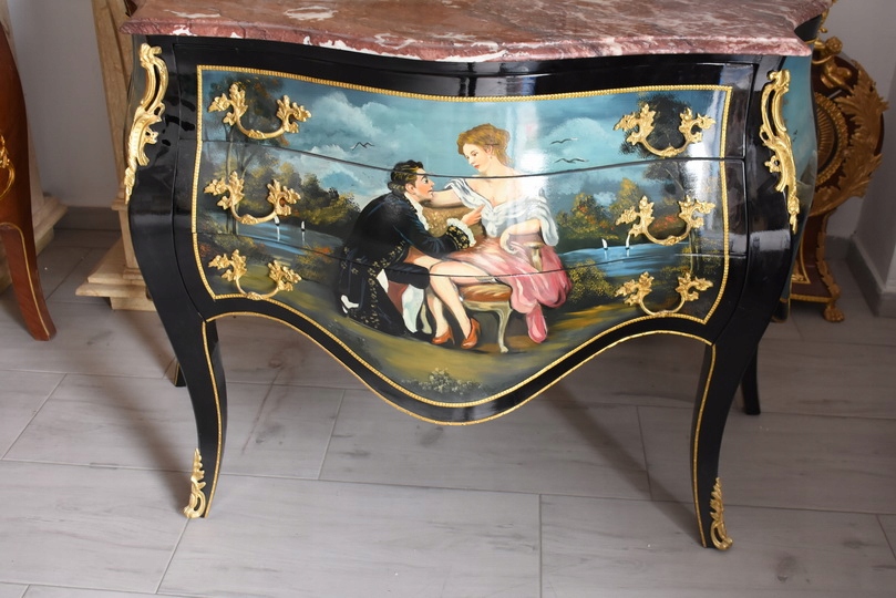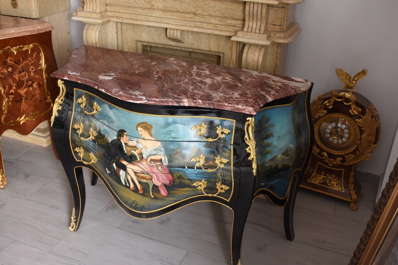 Niesamowicie piękna komoda, licznie zdobiona okuciami, które dodają wspaniałego uroku meblowi. Posiada pojemną szufladę oraz 3 szuflady