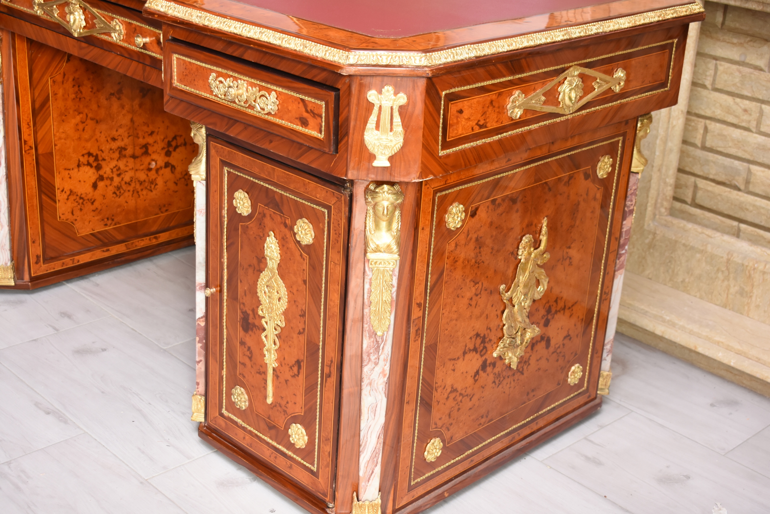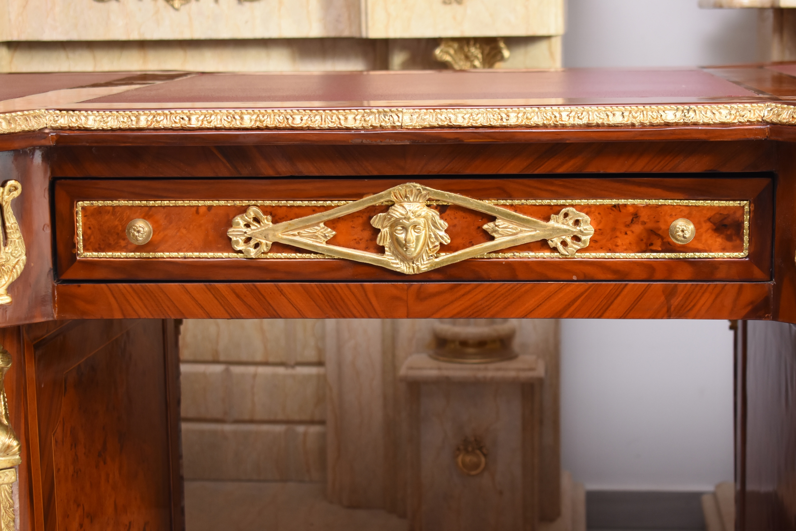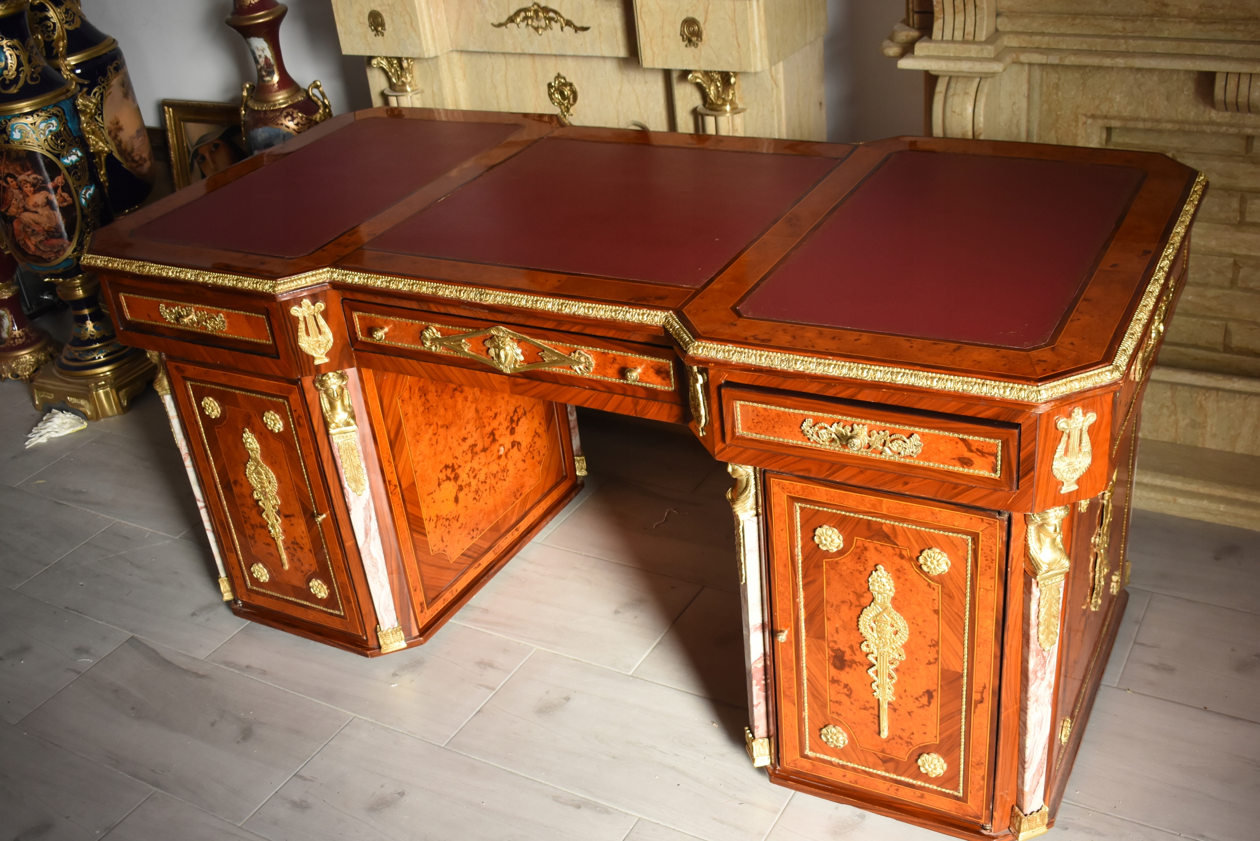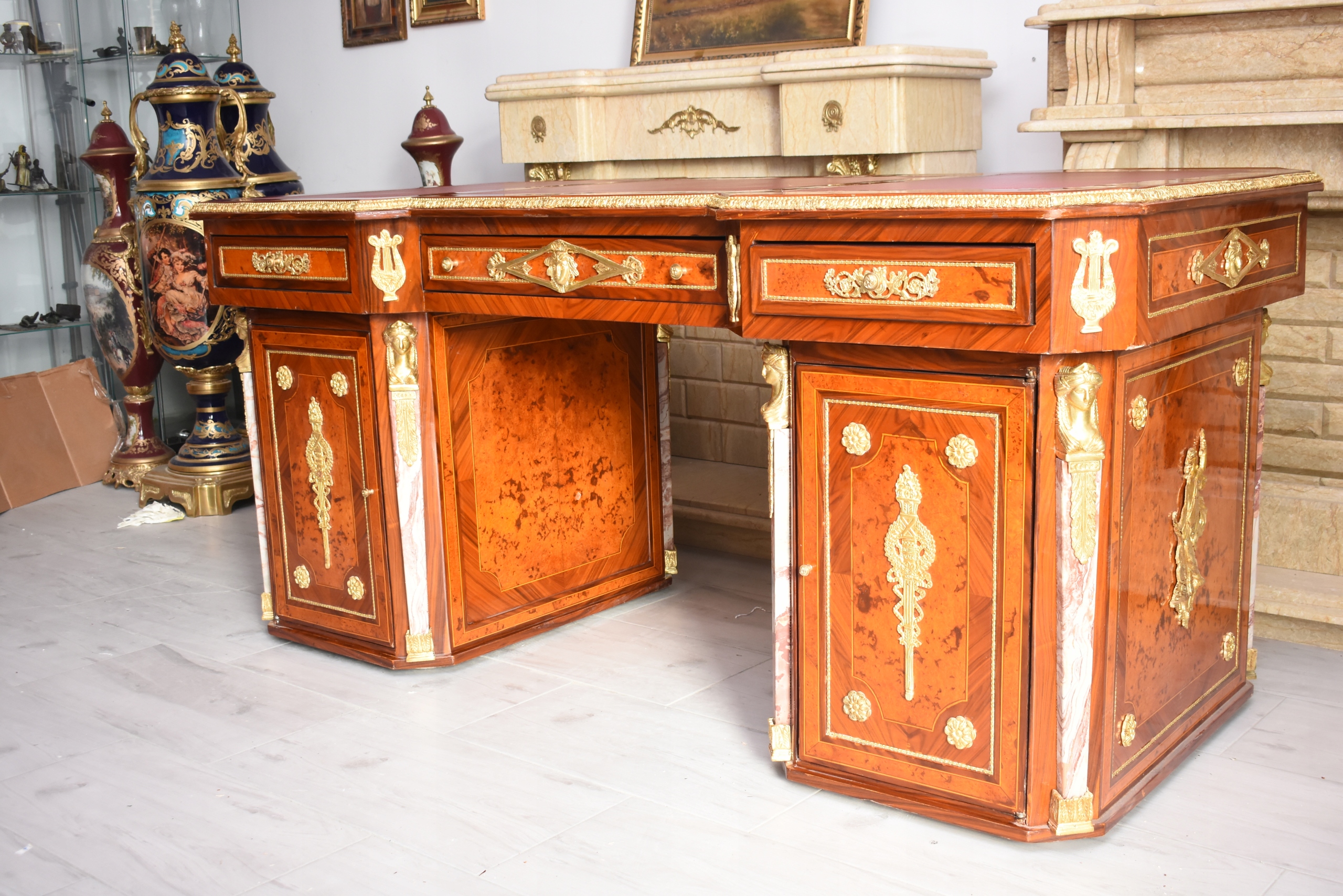 Okazałe, pałacowe biurko gabinetowe w stylu barokowym, o bardzo reprezentacyjnej i monumentalnej formie. Mebel wykonany z wysokiej jakości drewna, bogato fornirowany i zdobiony licznymi złoconymi okuciami z brązu, charakterystycznymi dla barokowej estetyki.