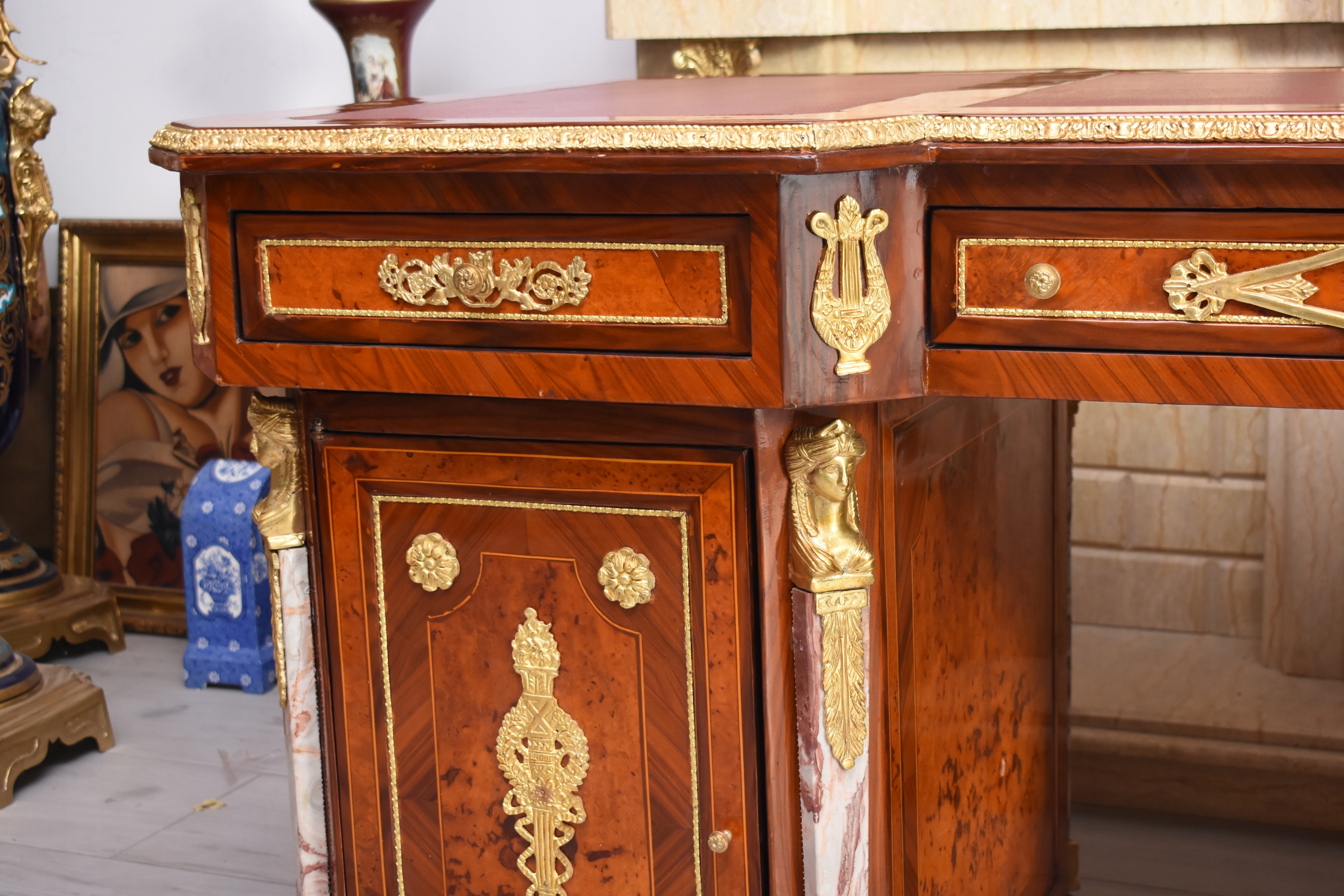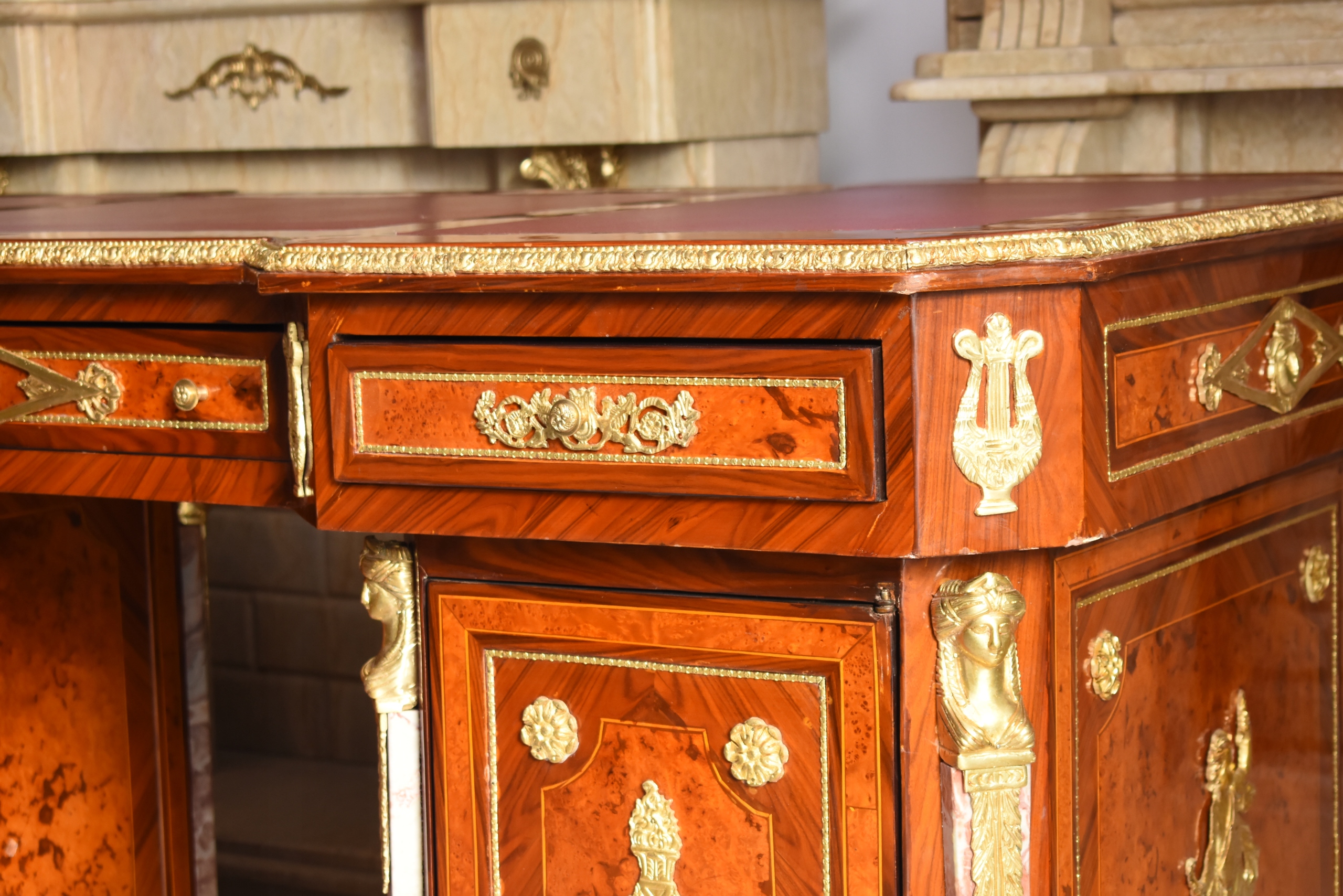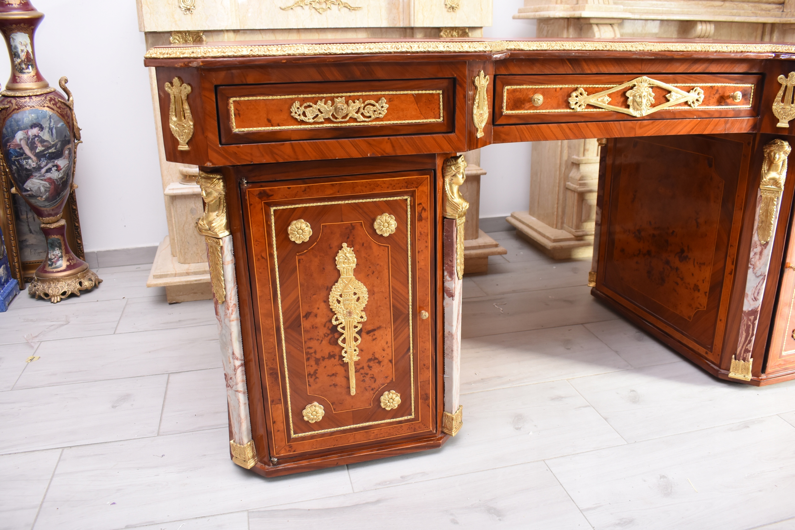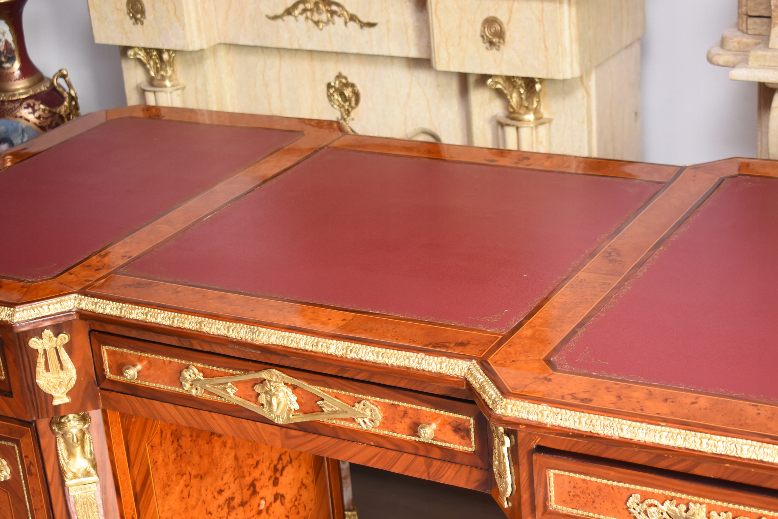 Okazałe, pałacowe biurko gabinetowe w stylu barokowym, o bardzo reprezentacyjnej i monumentalnej formie. Mebel wykonany z wysokiej jakości drewna, bogato fornirowany i zdobiony licznymi złoconymi okuciami z brązu, charakterystycznymi dla barokowej estetyki.