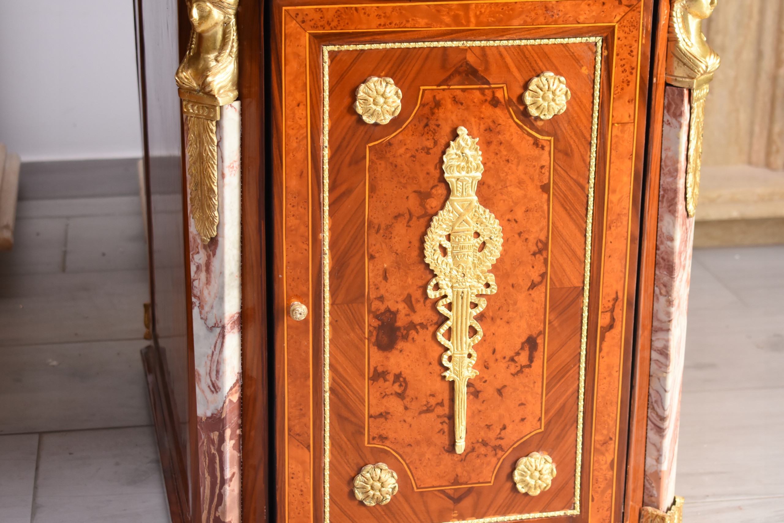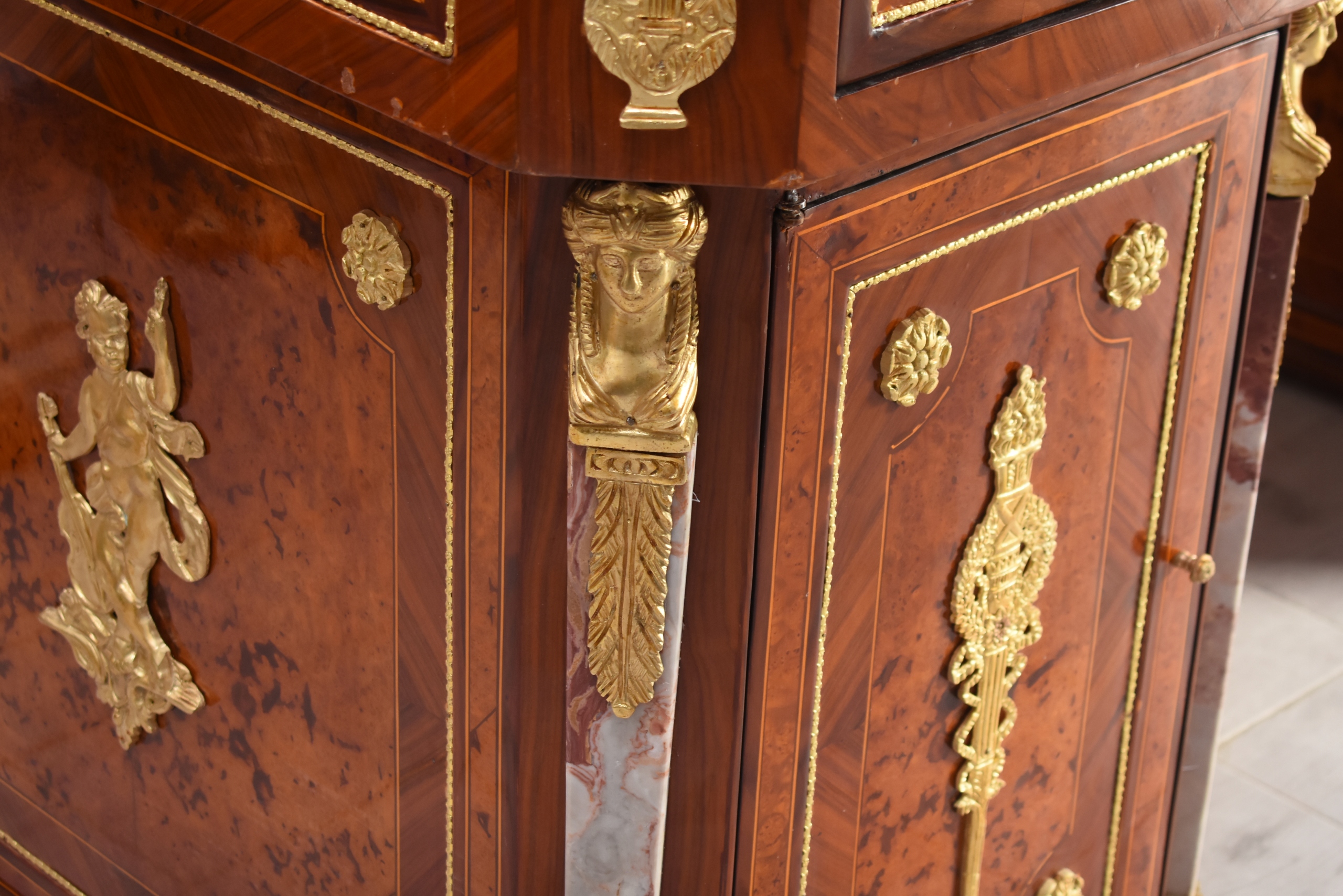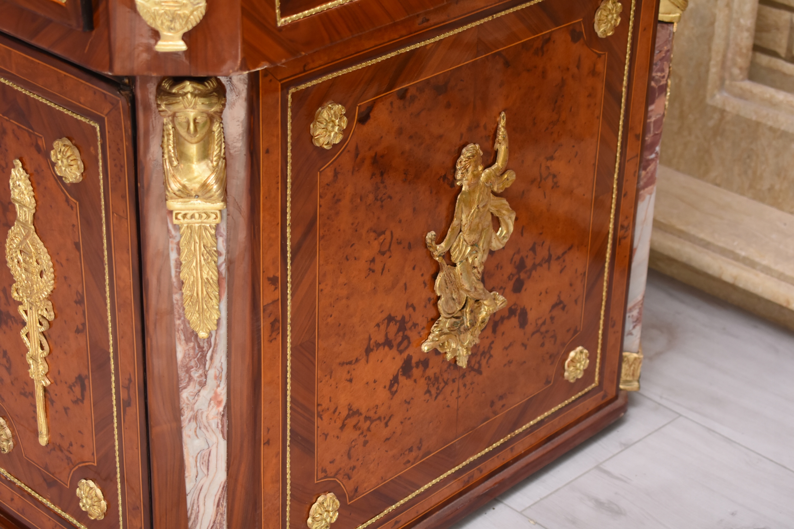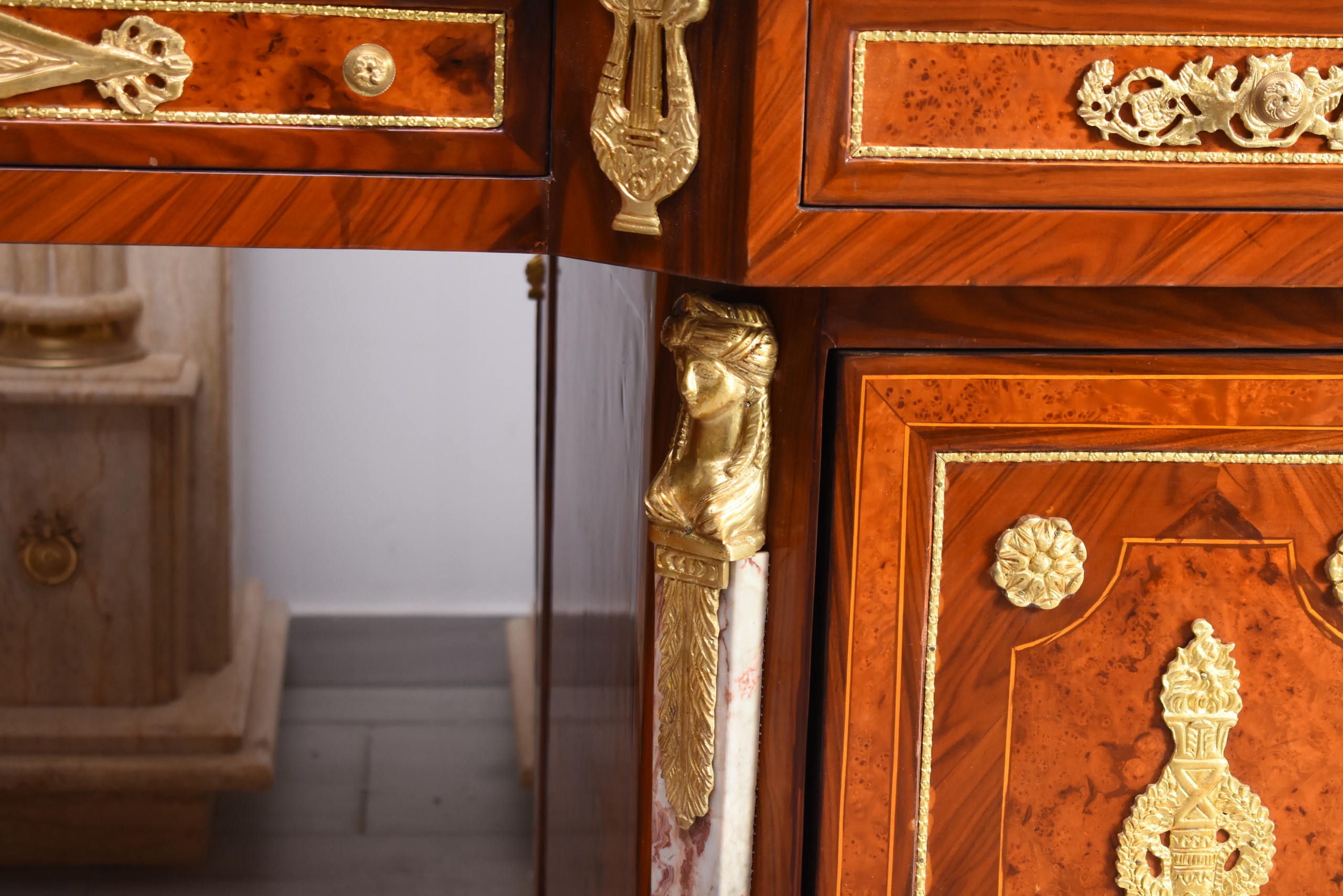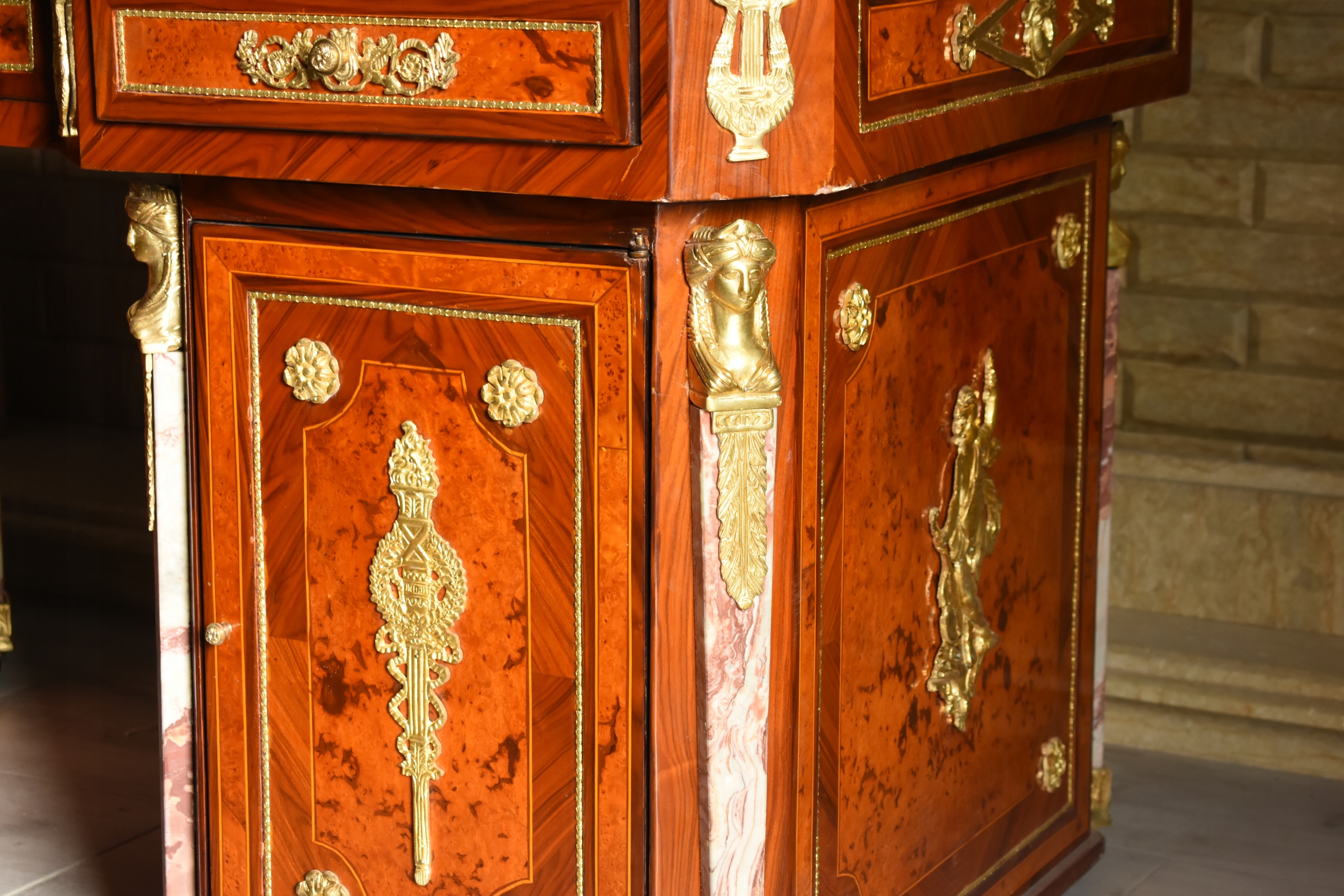 Boczne szafki oraz szuflady zapewniają funkcjonalną przestrzeń do przechowywania, zachowując jednocześnie elegancką formę i proporcje typowe dla baroku. Starannie wykończone narożniki, pilastry oraz bogata dekoracja z brązu nadają meblowi wyjątkowej prezencji.