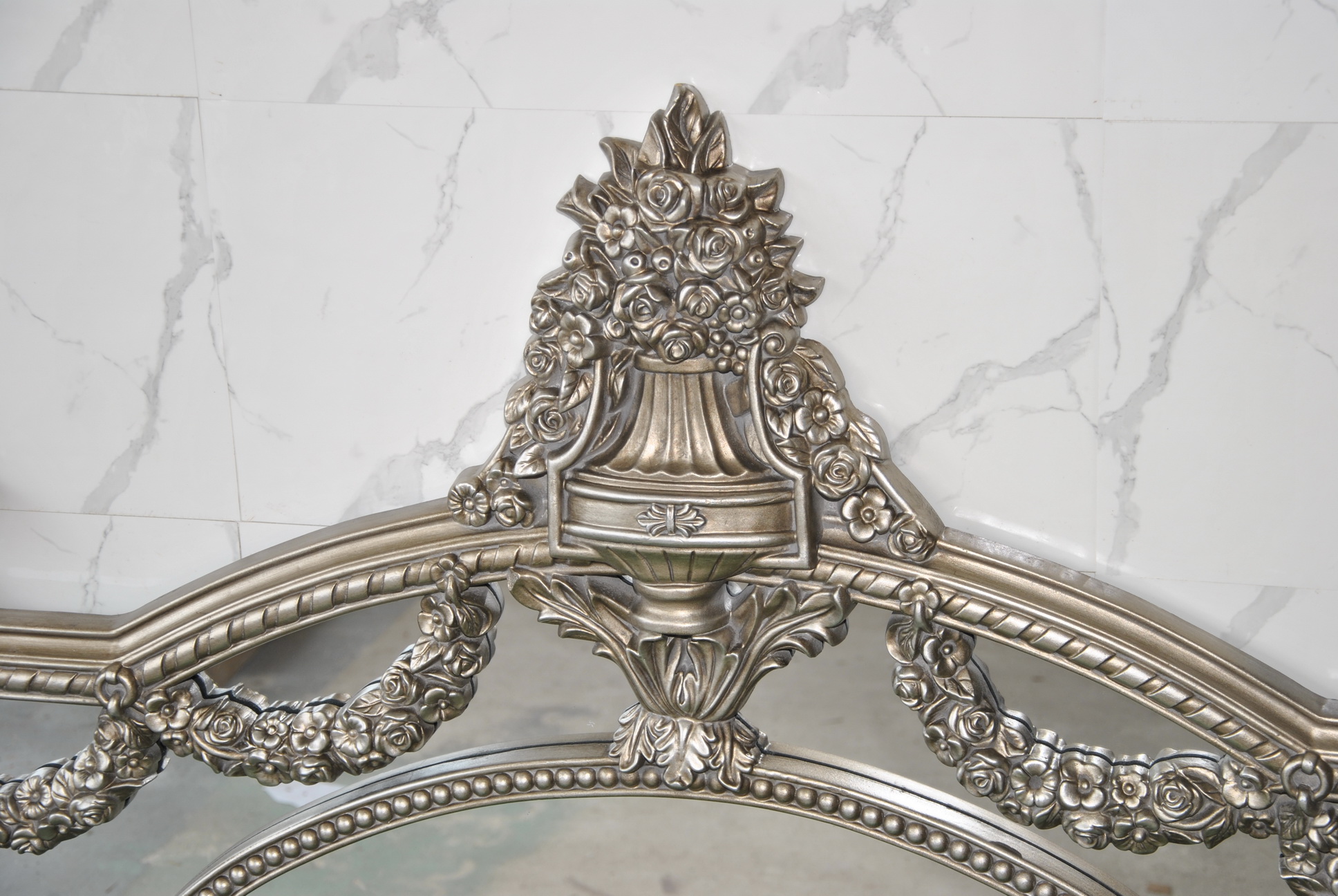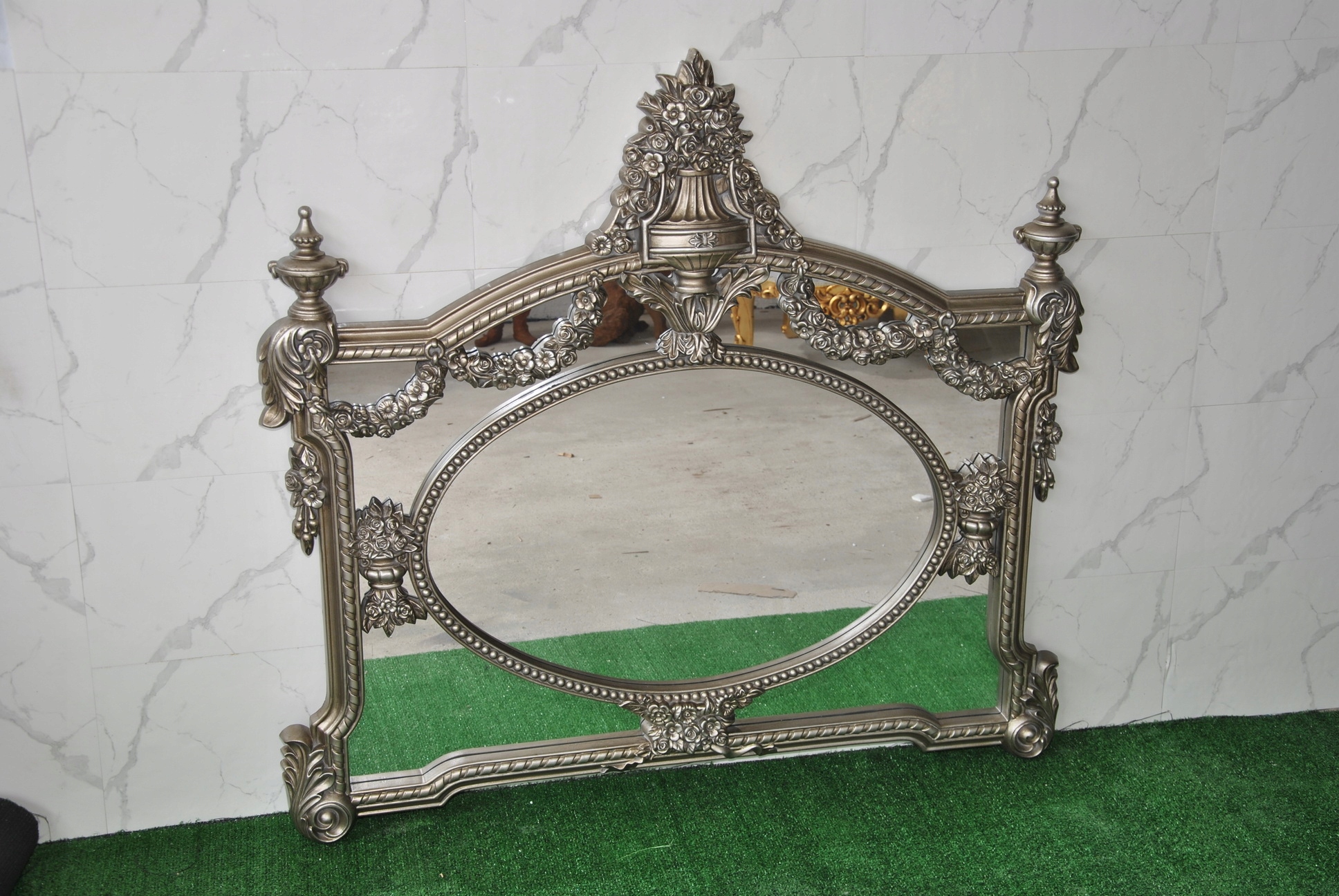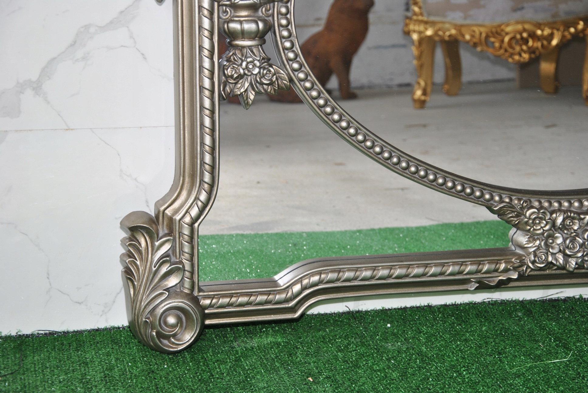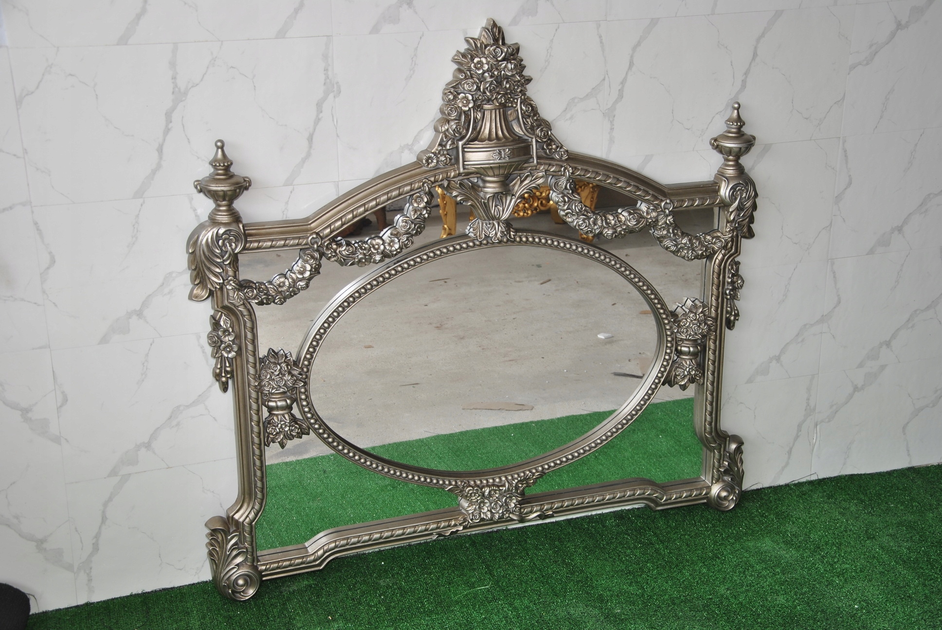 Witam, w dniu dzisiejszym pragnę zaoferować Państwu niebywale srebrne rzeźbione kryształowe lustro w ślicznej drewnianej ramie - całość włącznie z ornamentami jest z drewna.