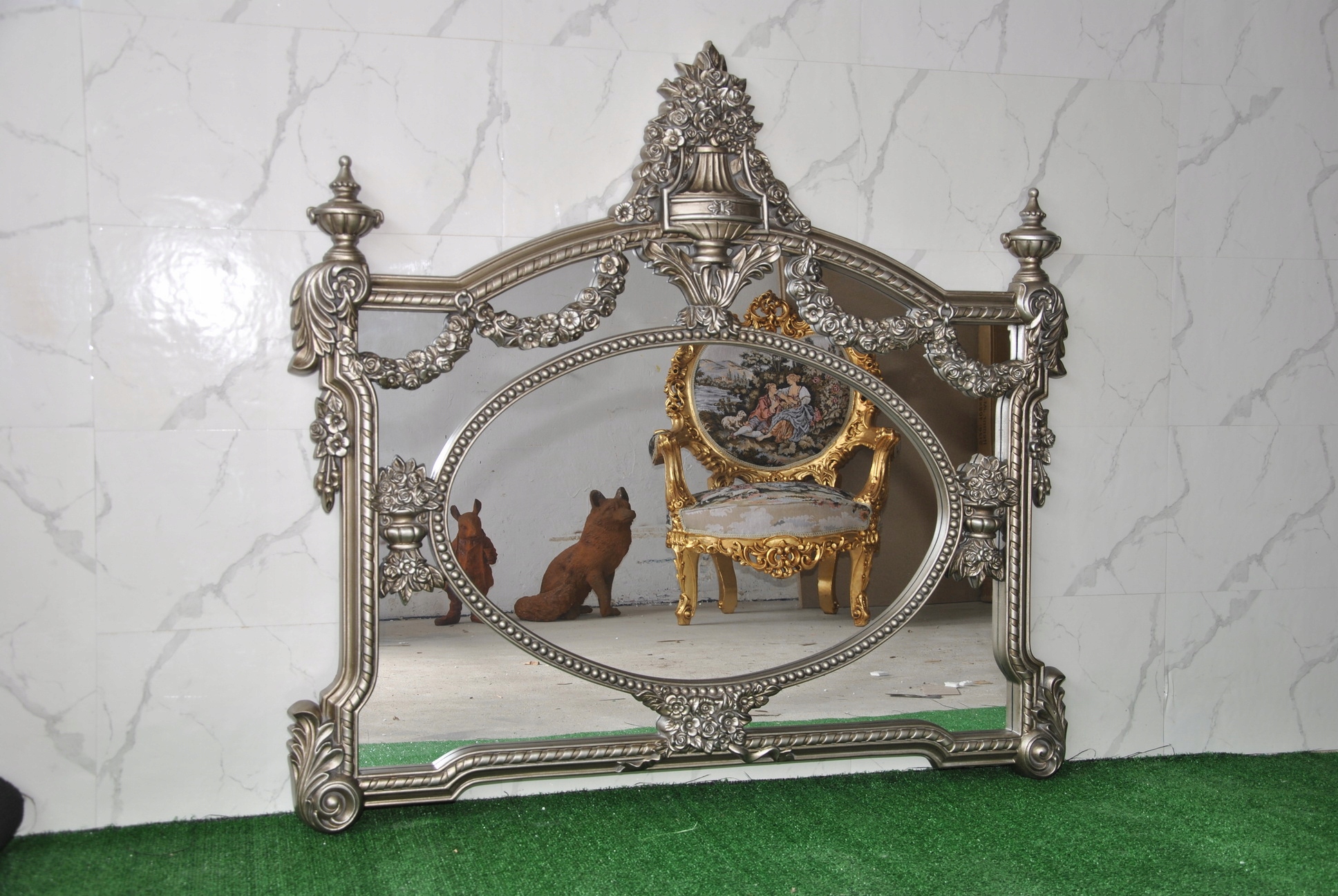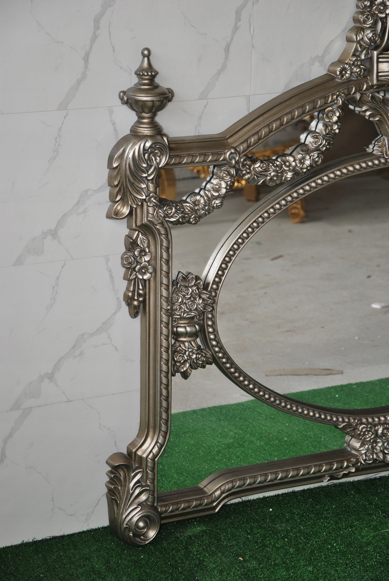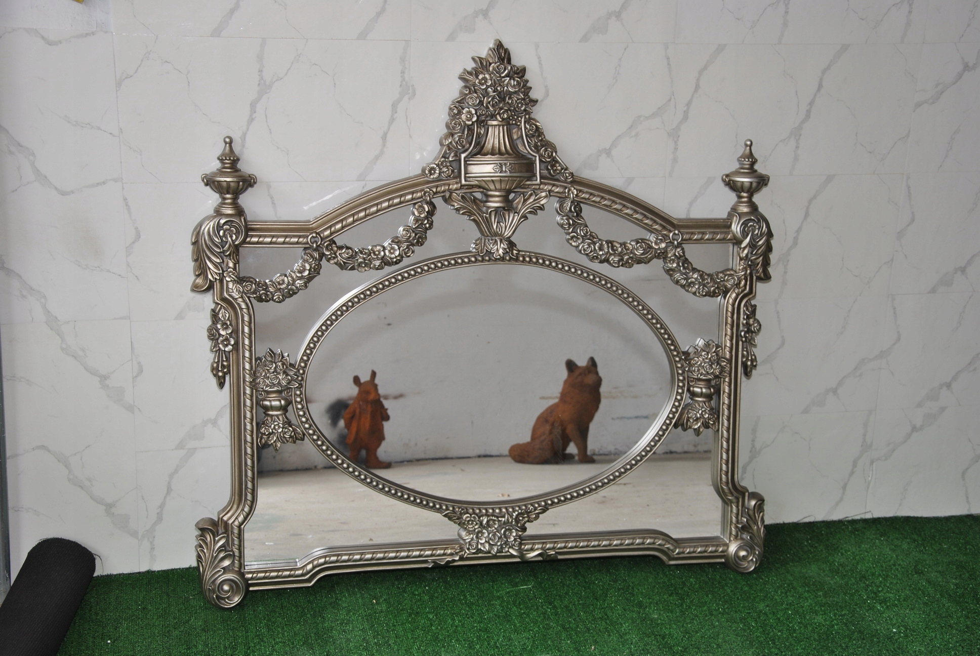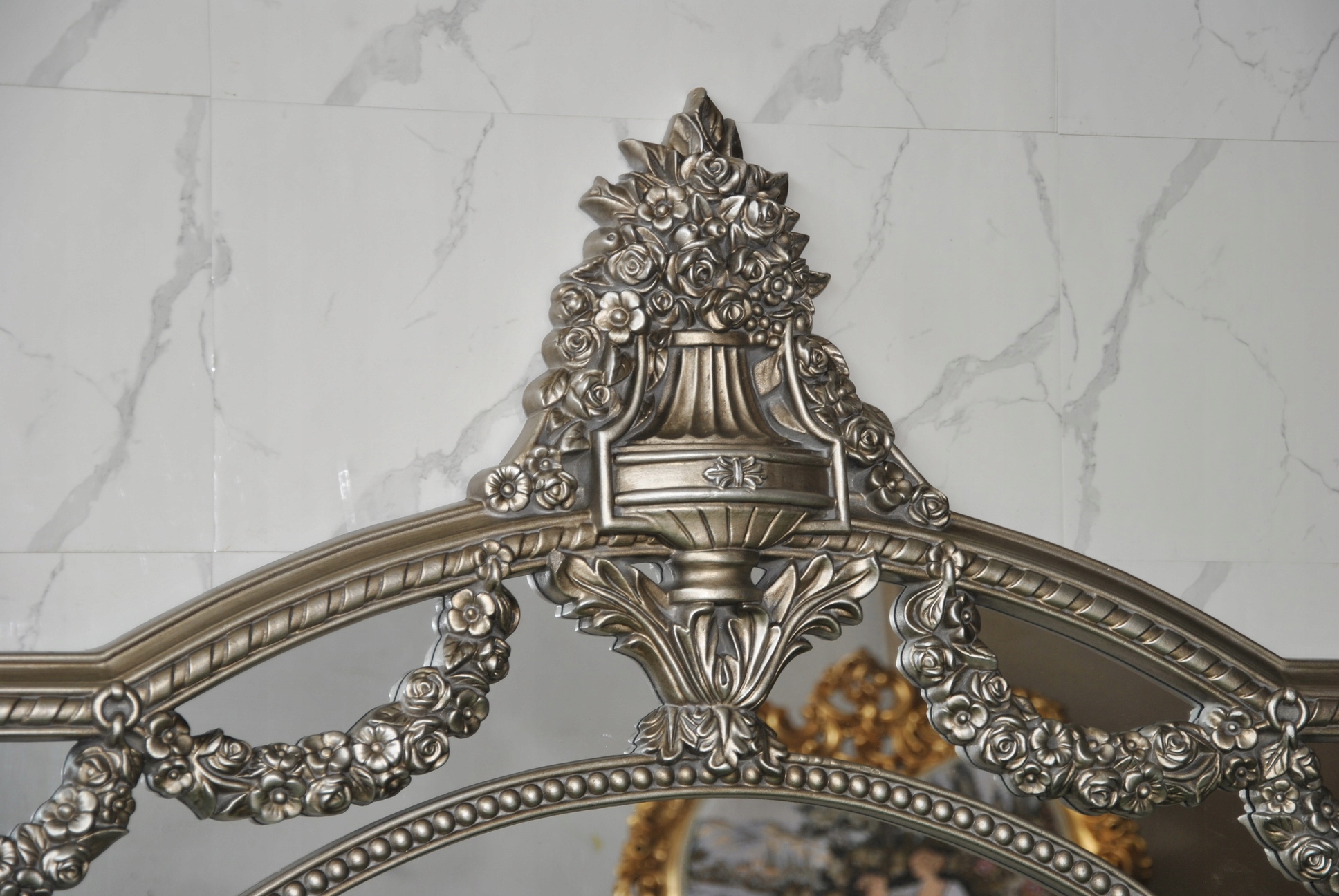 Witam, w dniu dzisiejszym pragnę zaoferować Państwu niebywale srebrne rzeźbione kryształowe lustro w ślicznej drewnianej ramie - całość włącznie z ornamentami jest z drewna.