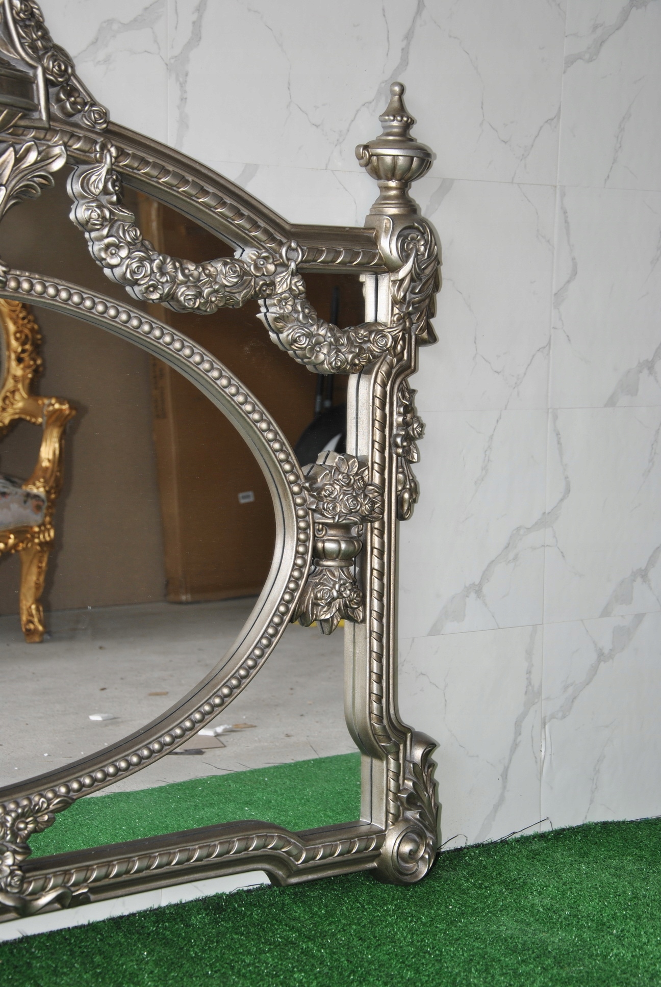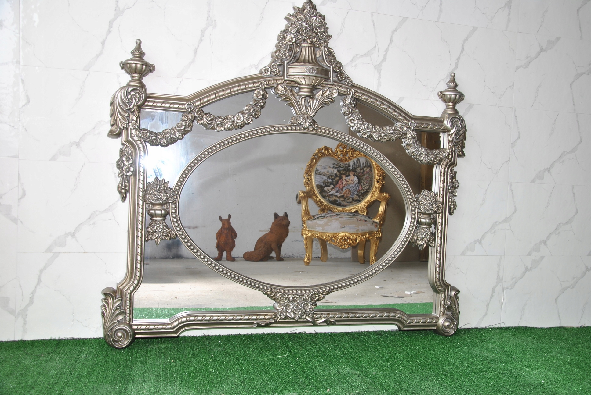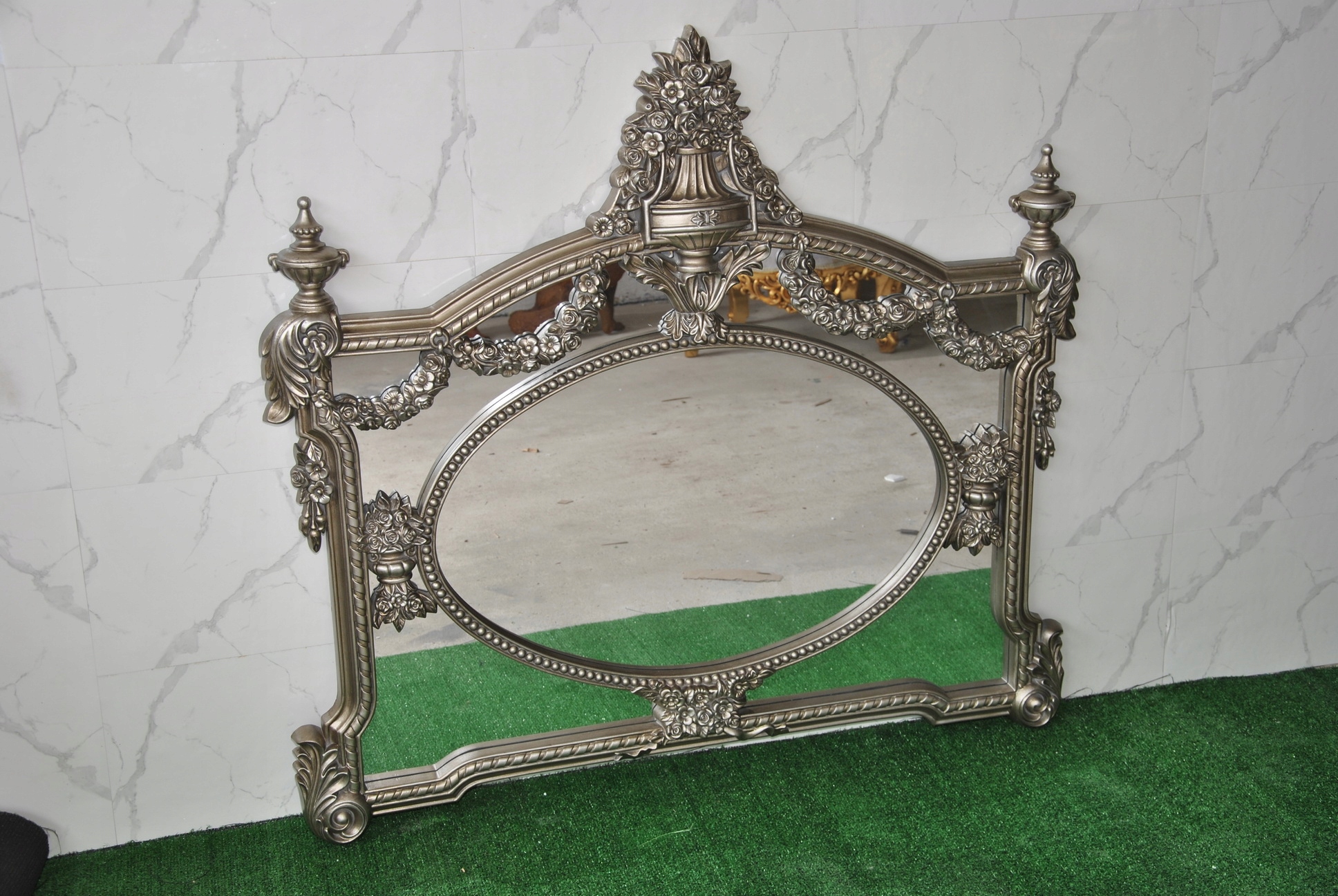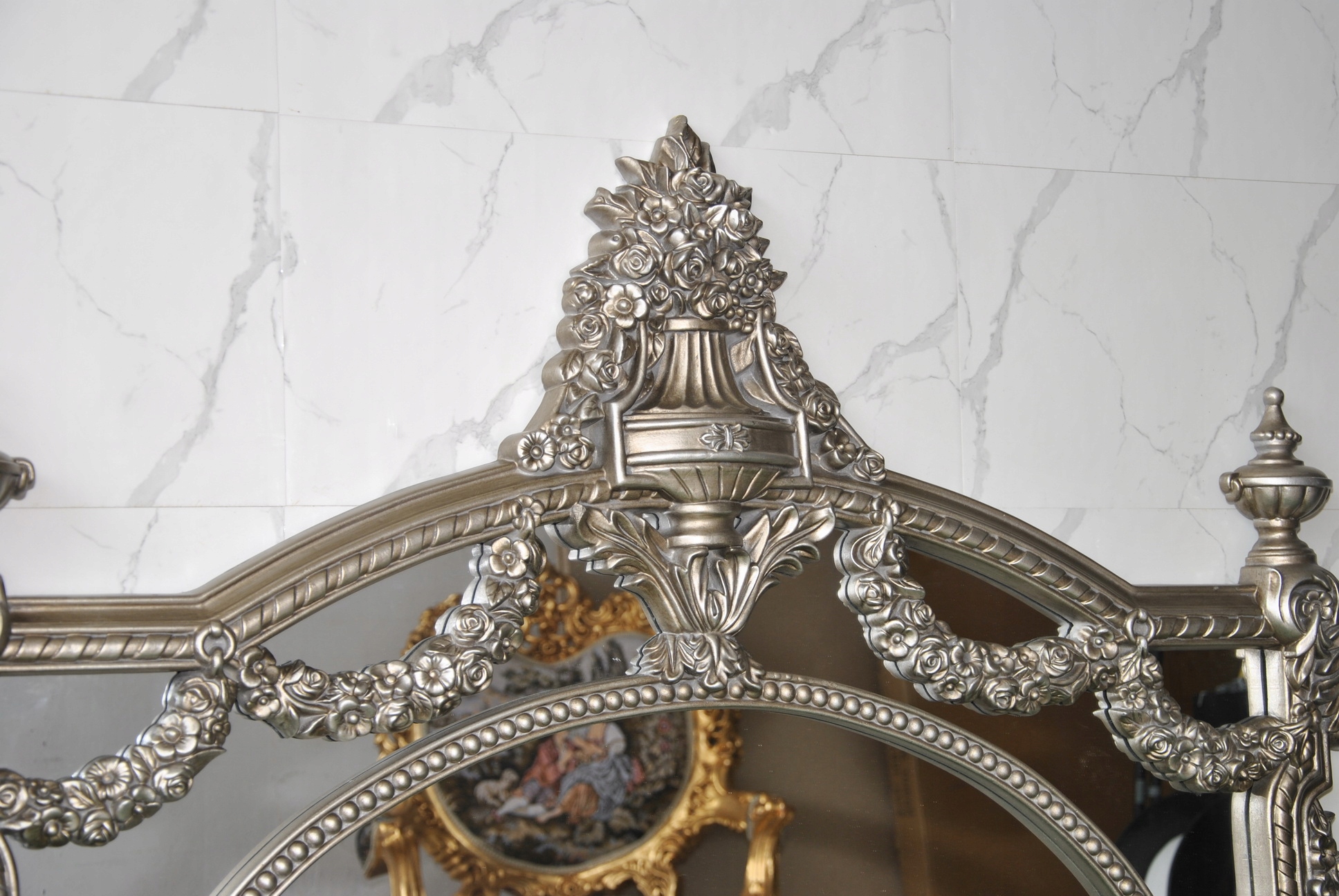 Witam, w dniu dzisiejszym pragnę zaoferować Państwu niebywale srebrne rzeźbione kryształowe lustro w ślicznej drewnianej ramie - całość włącznie z ornamentami jest z drewna.