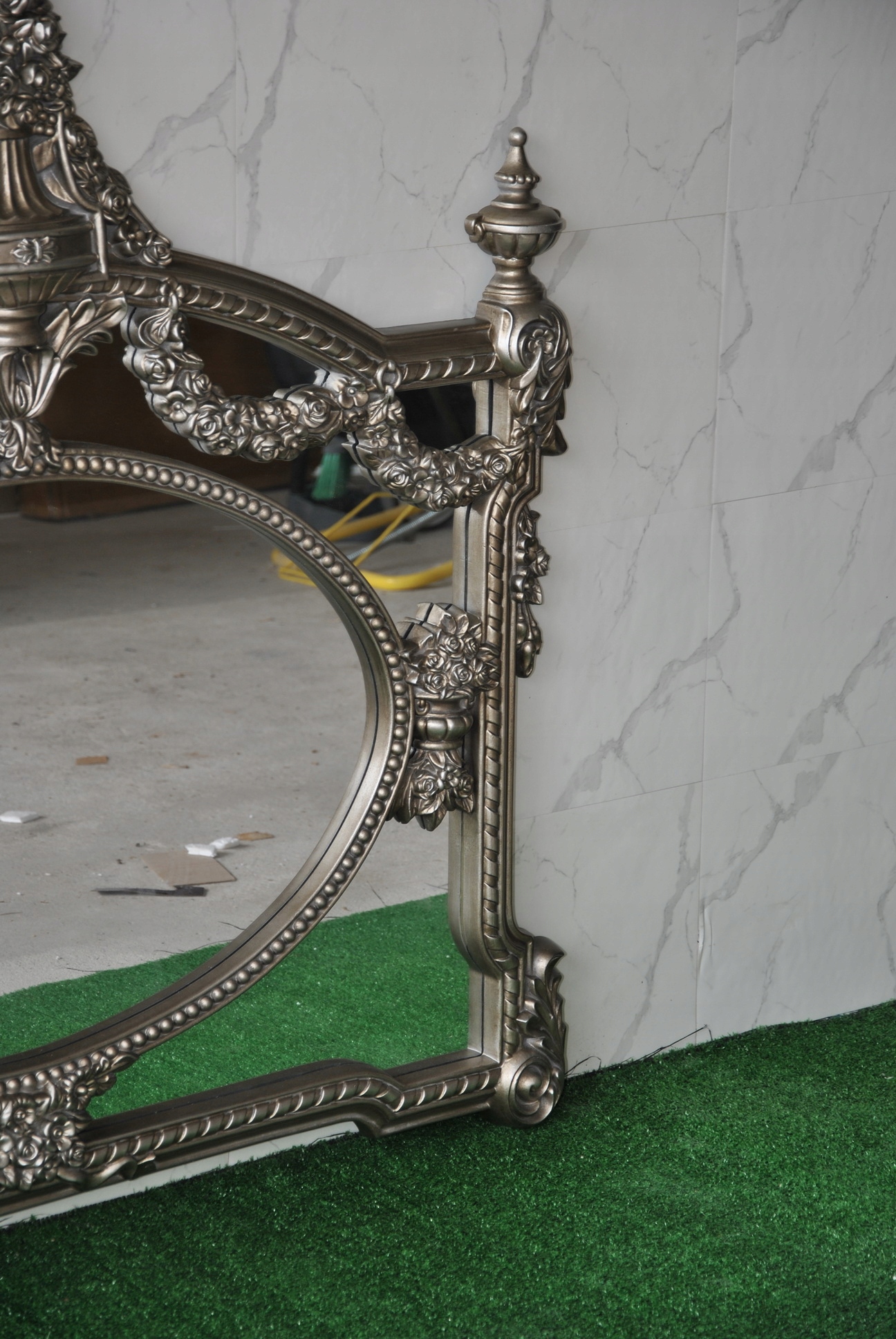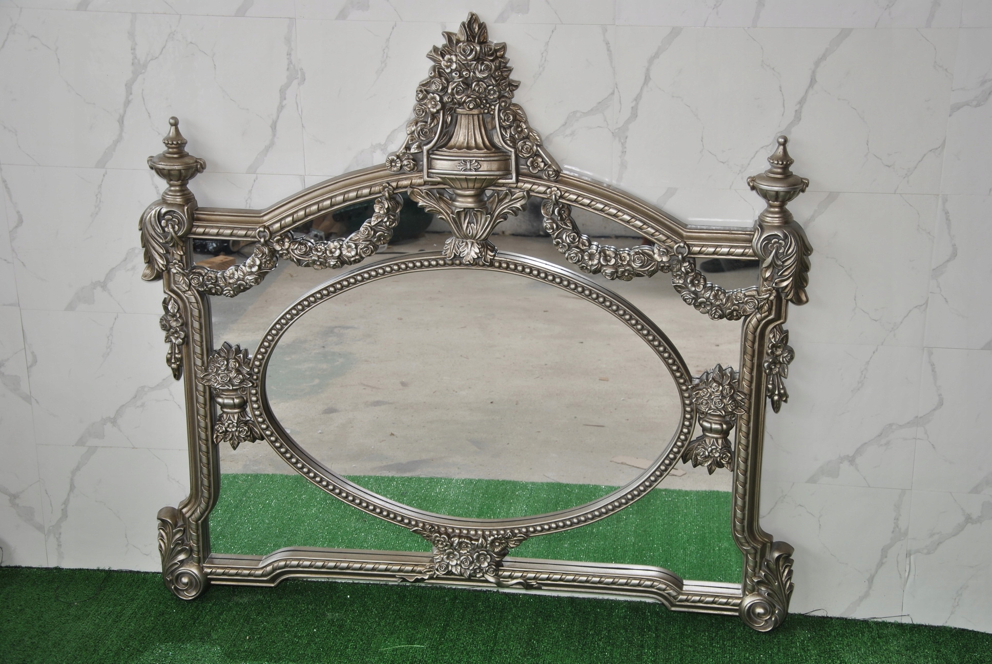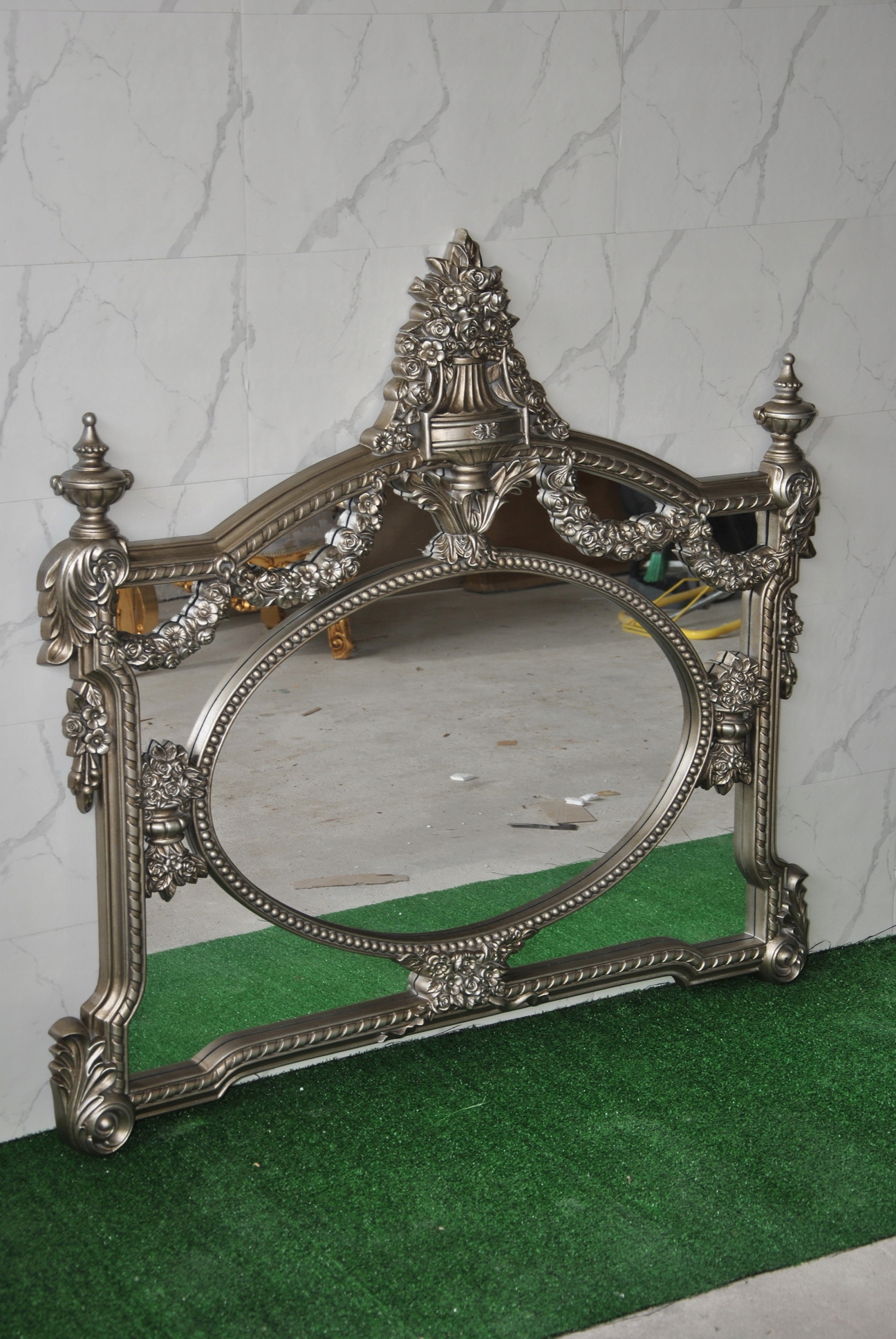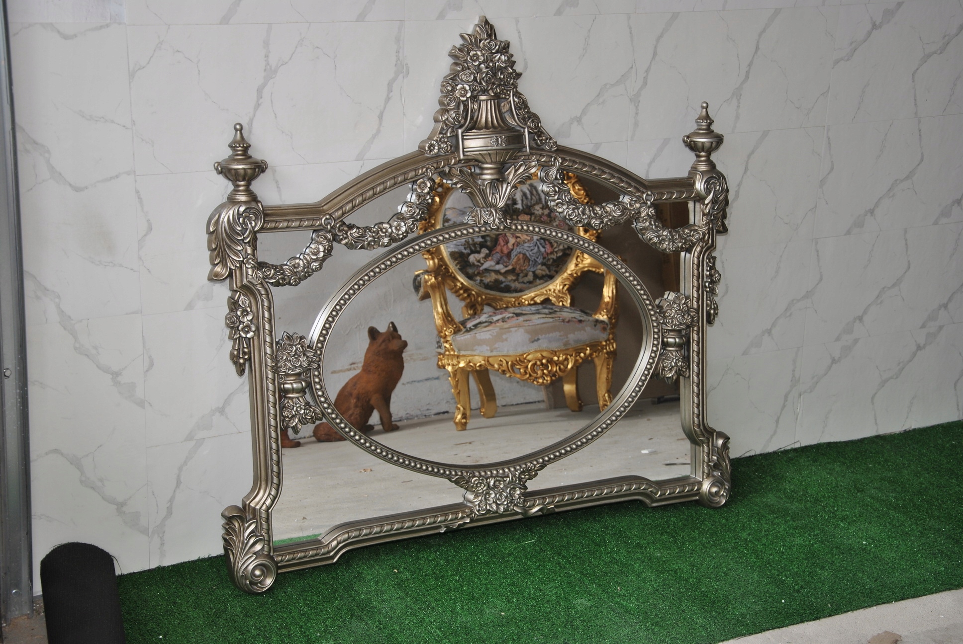 Witam, w dniu dzisiejszym pragnę zaoferować Państwu niebywale srebrne rzeźbione kryształowe lustro w ślicznej drewnianej ramie - całość włącznie z ornamentami jest z drewna.